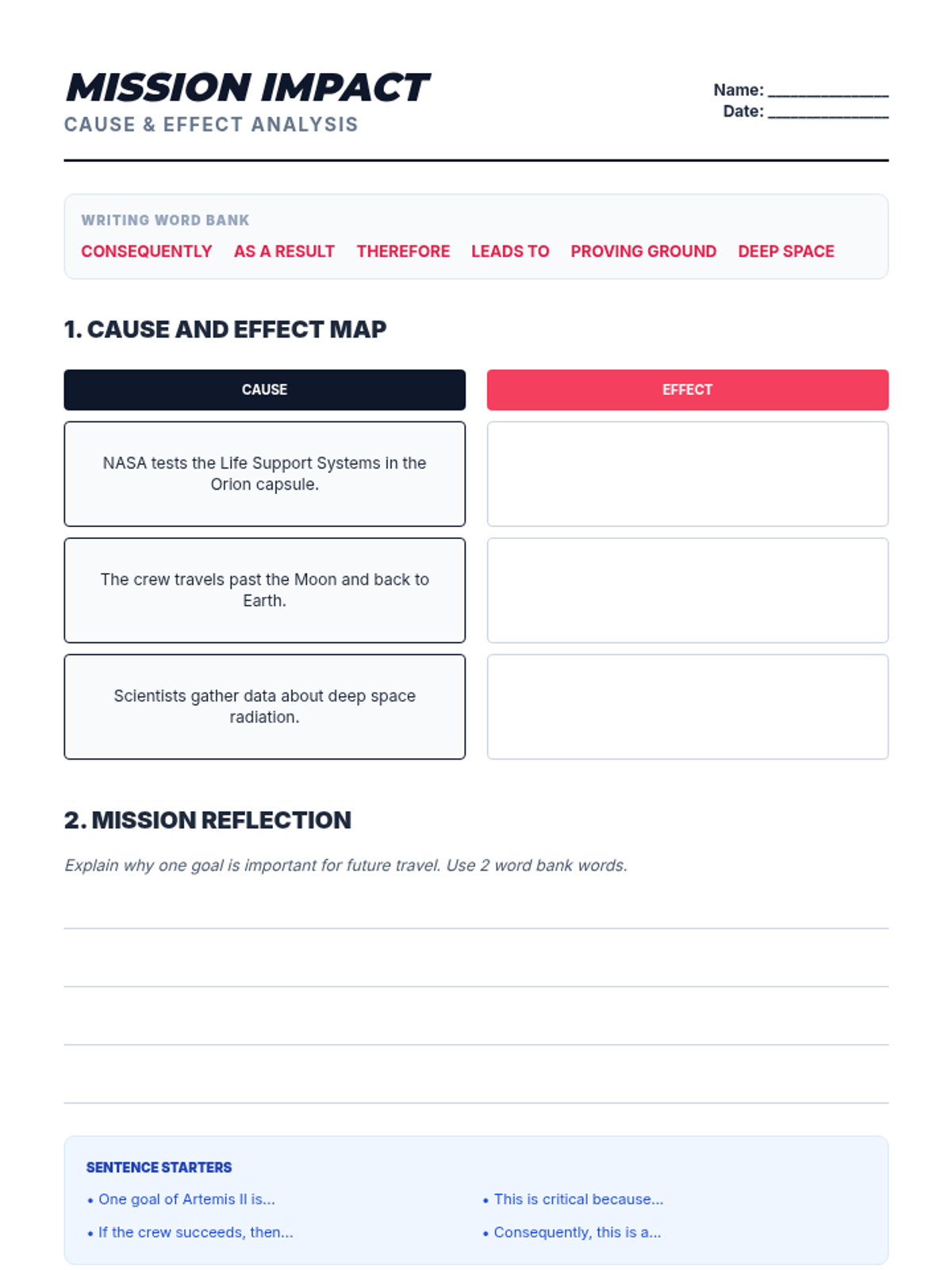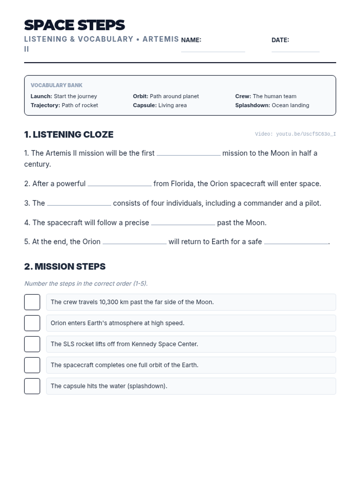 An immersive Language Lounge experience where students explore the goals and logistics of the Artemis II mission to the Moon.