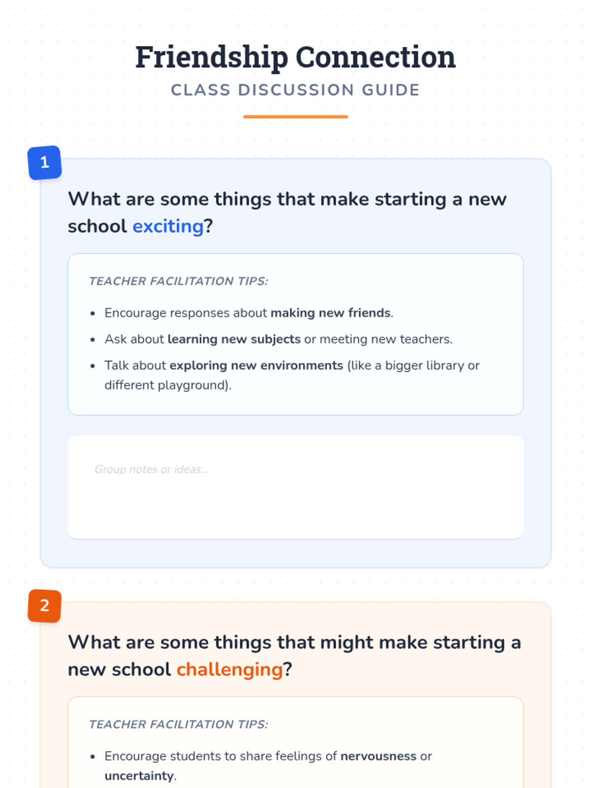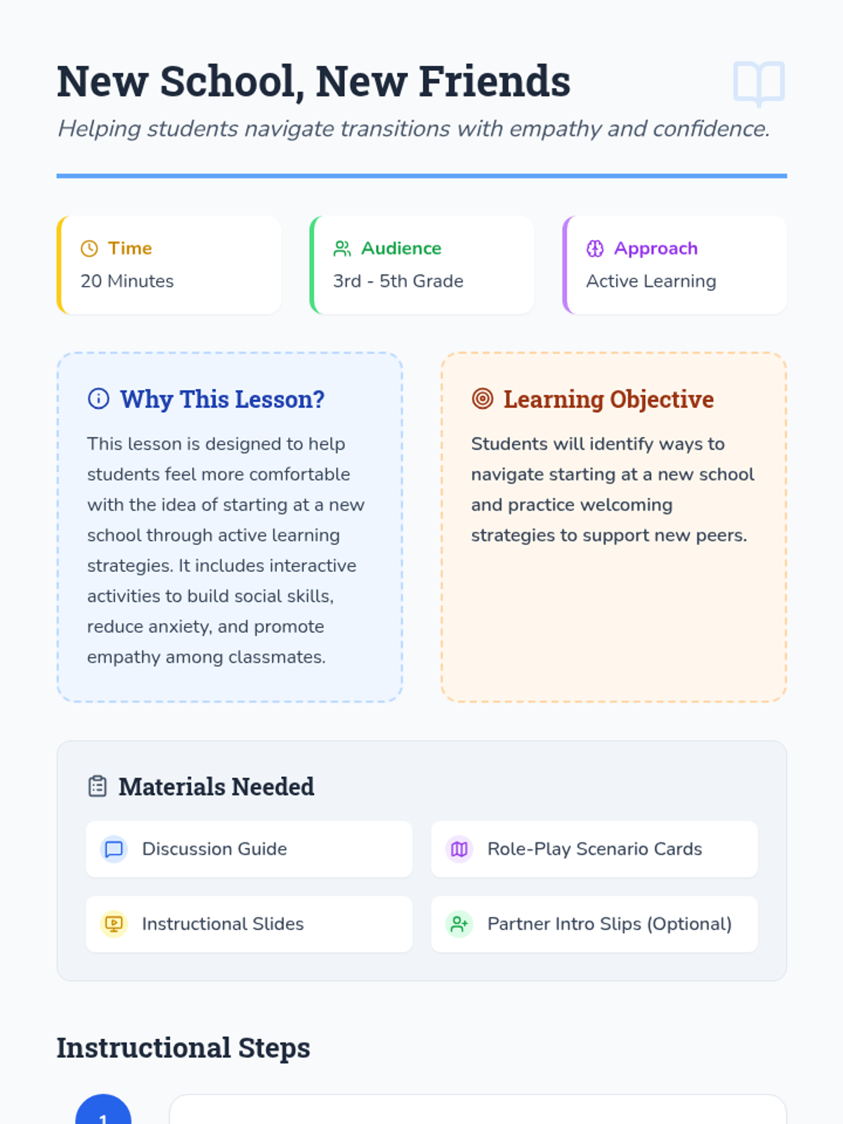 A social-emotional learning lesson designed to help 3rd-5th grade students navigate the transition to a new school, focusing on empathy, social skills, and reducing anxiety.