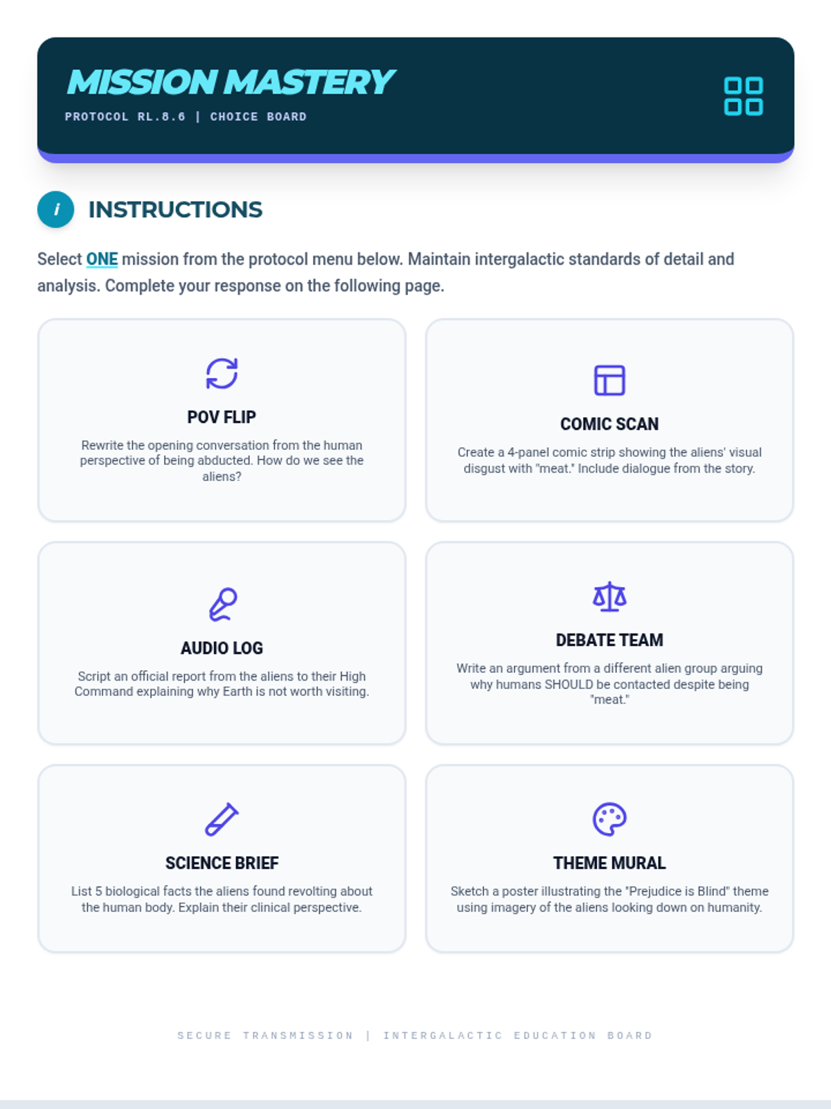A one-hour deep dive into Terry Bisson's 'They're Made out of Meat,' focusing on point of view, dramatic irony, and themes of prejudice through an alien-themed lens.
