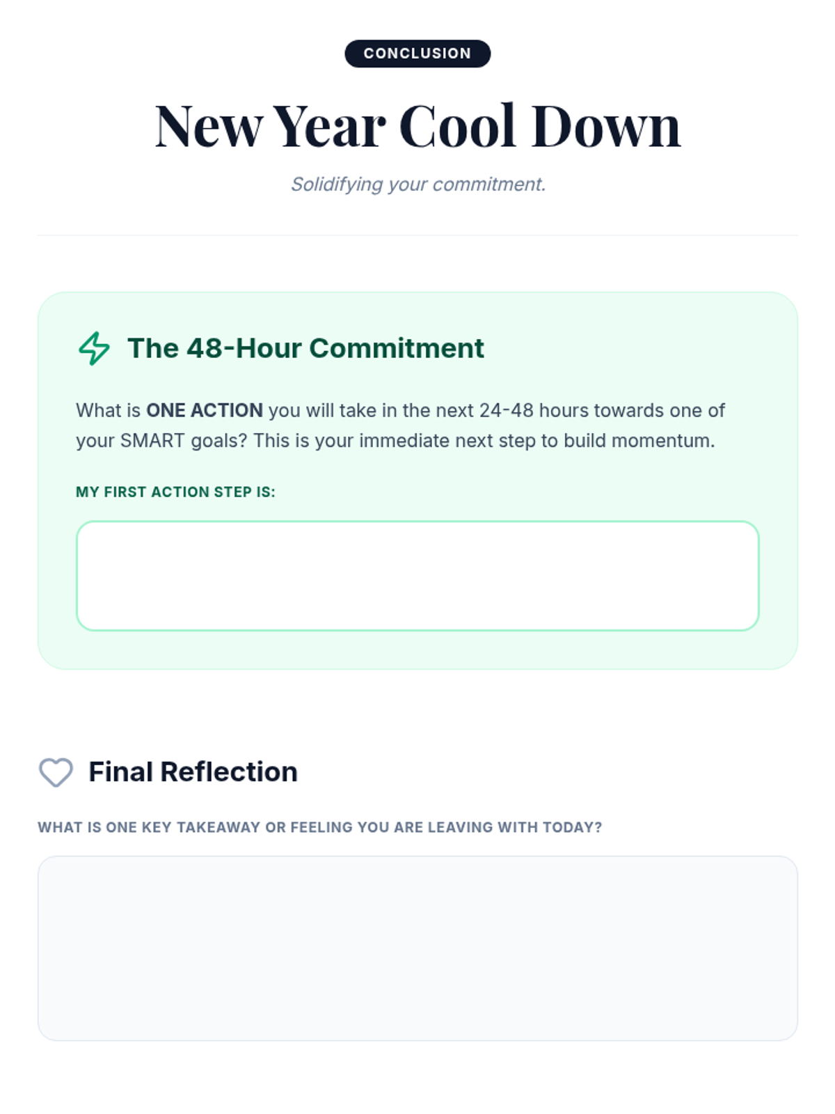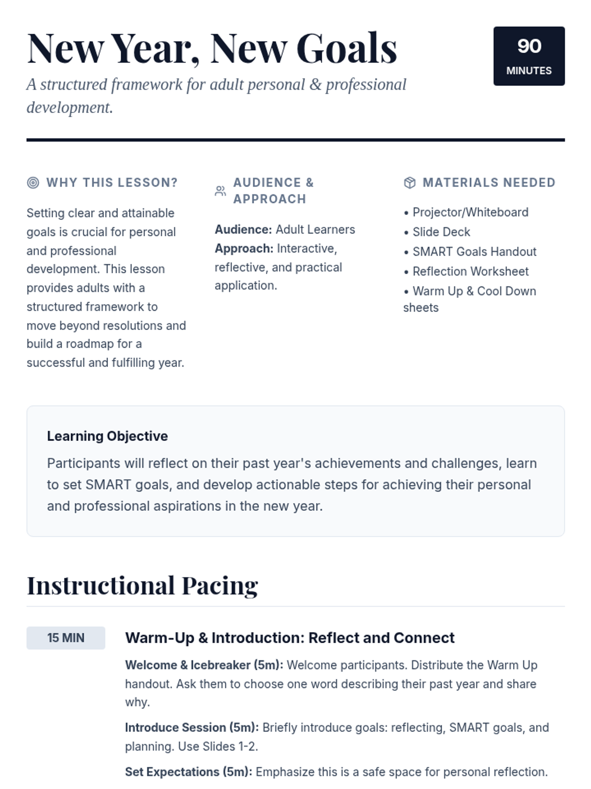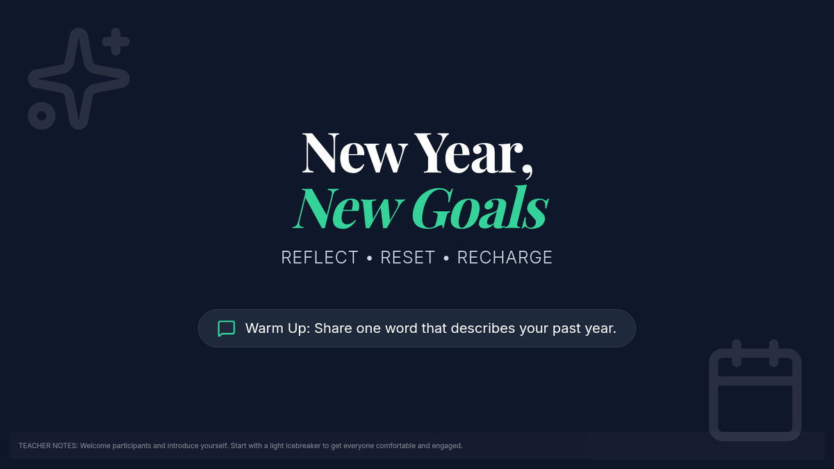 A 90-minute workshop for adult learners focused on reflecting on the past year and setting actionable SMART goals for the new year.