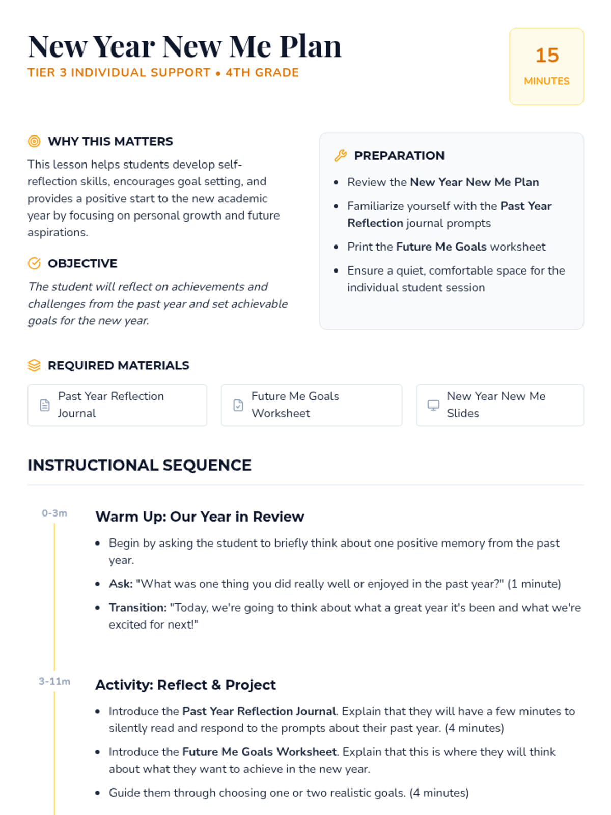 A 15-minute individual reflection and goal-setting session for 4th-grade students to celebrate the past year and plan for the new one.