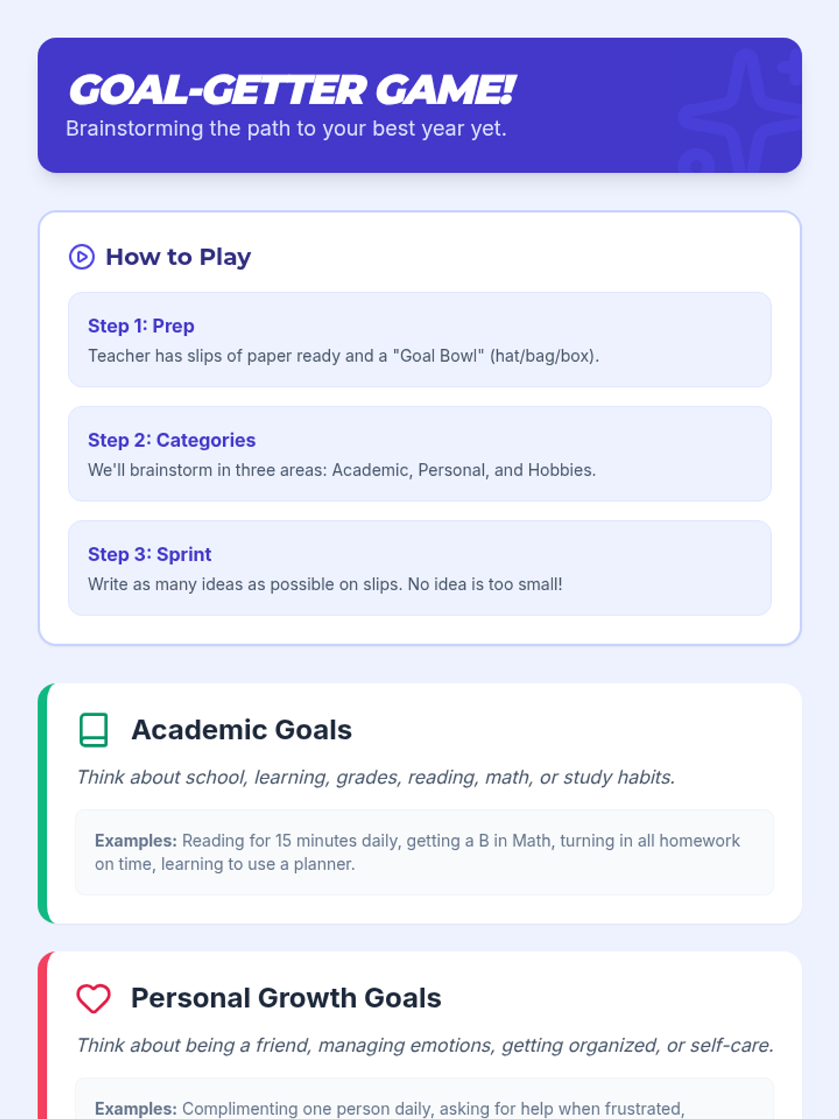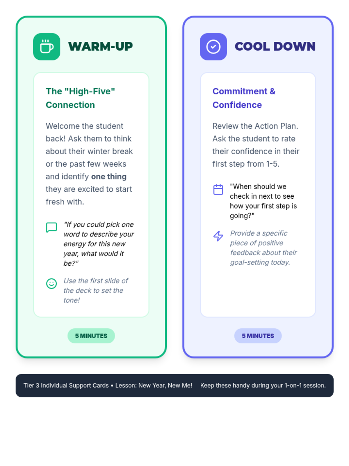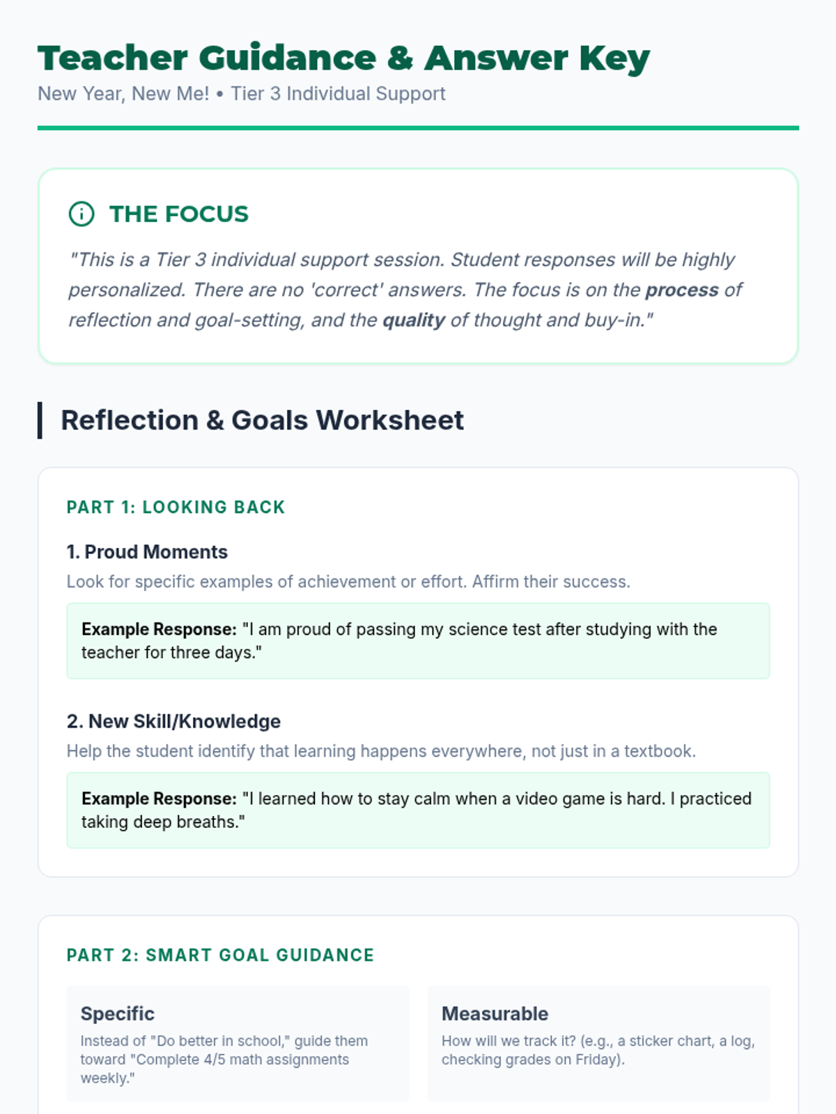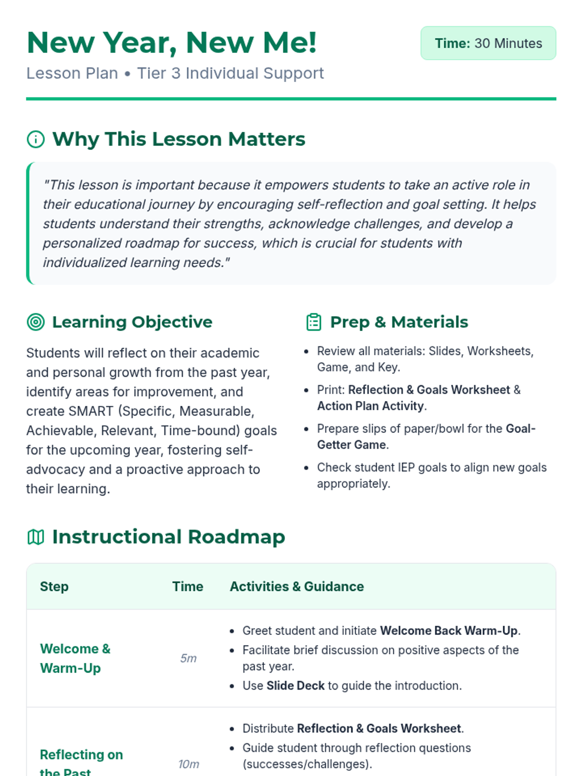 A 30-minute Tier 3 individual lesson for 5th-8th graders focused on reflecting on past achievements and setting SMART goals for the new year to foster self-awareness and ownership of learning.