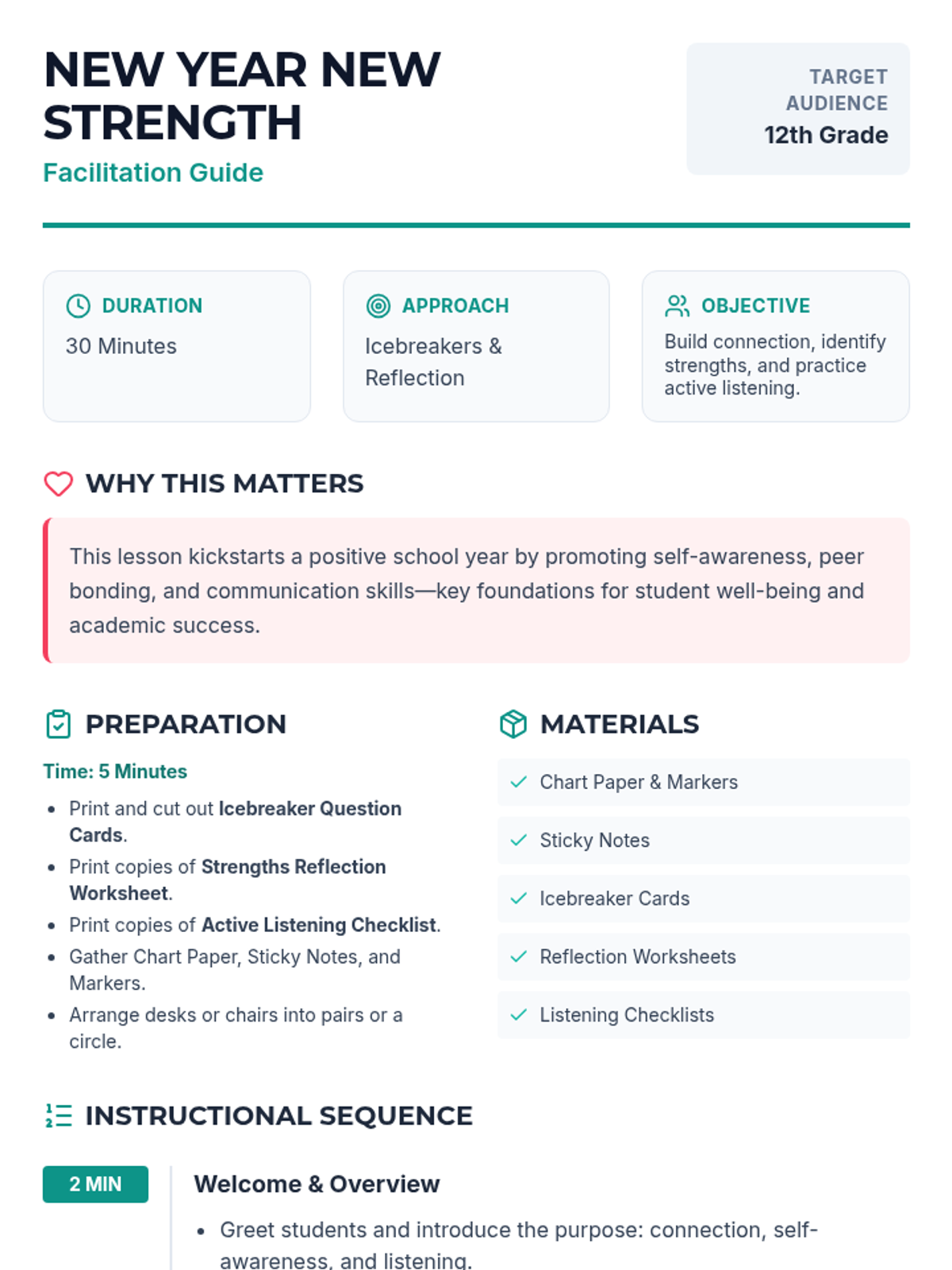 A 30-minute SEL lesson for 12th graders focused on building classroom community, identifying personal strengths, and practicing active listening to start the school year with purpose.