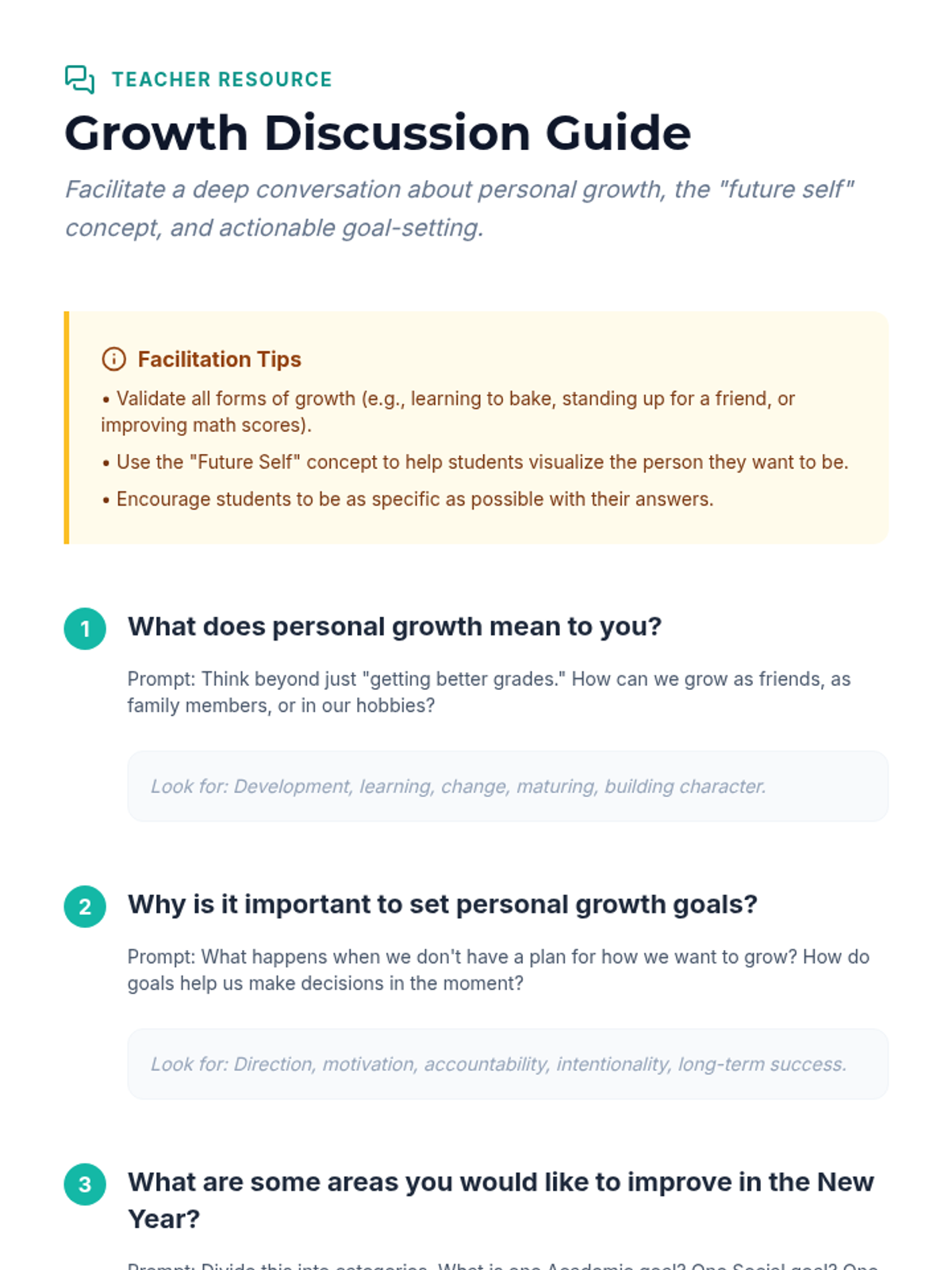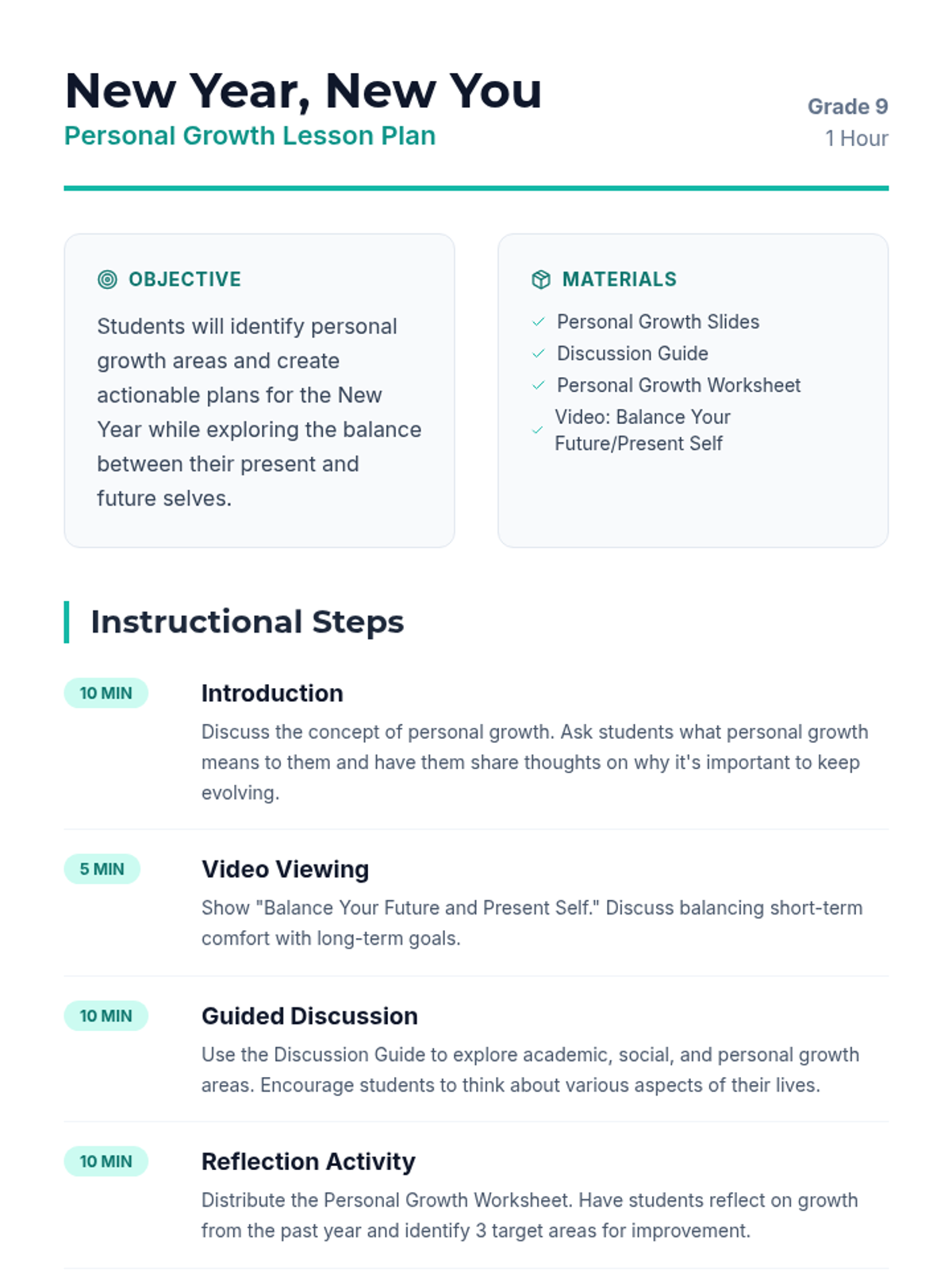 This lesson helps Grade 9 students focus on personal growth by identifying areas for improvement, setting actionable goals, and balancing their present and future selves through reflection and role-playing.