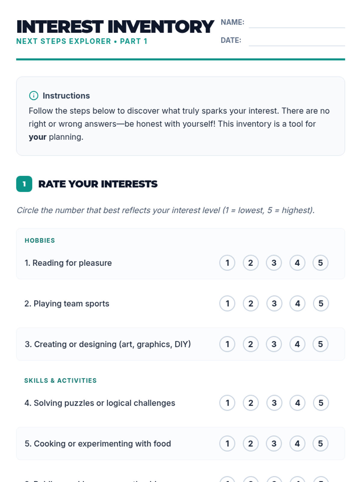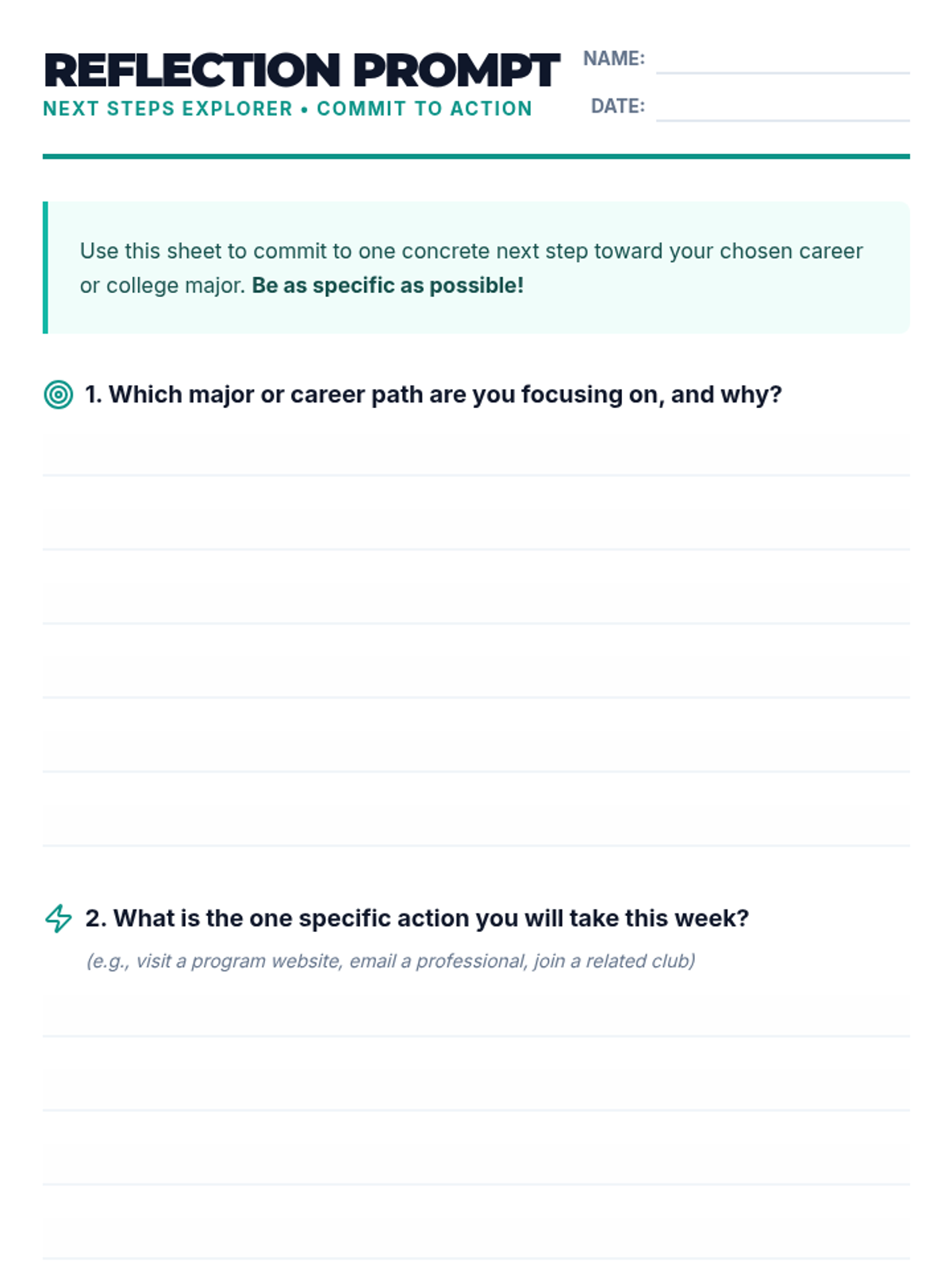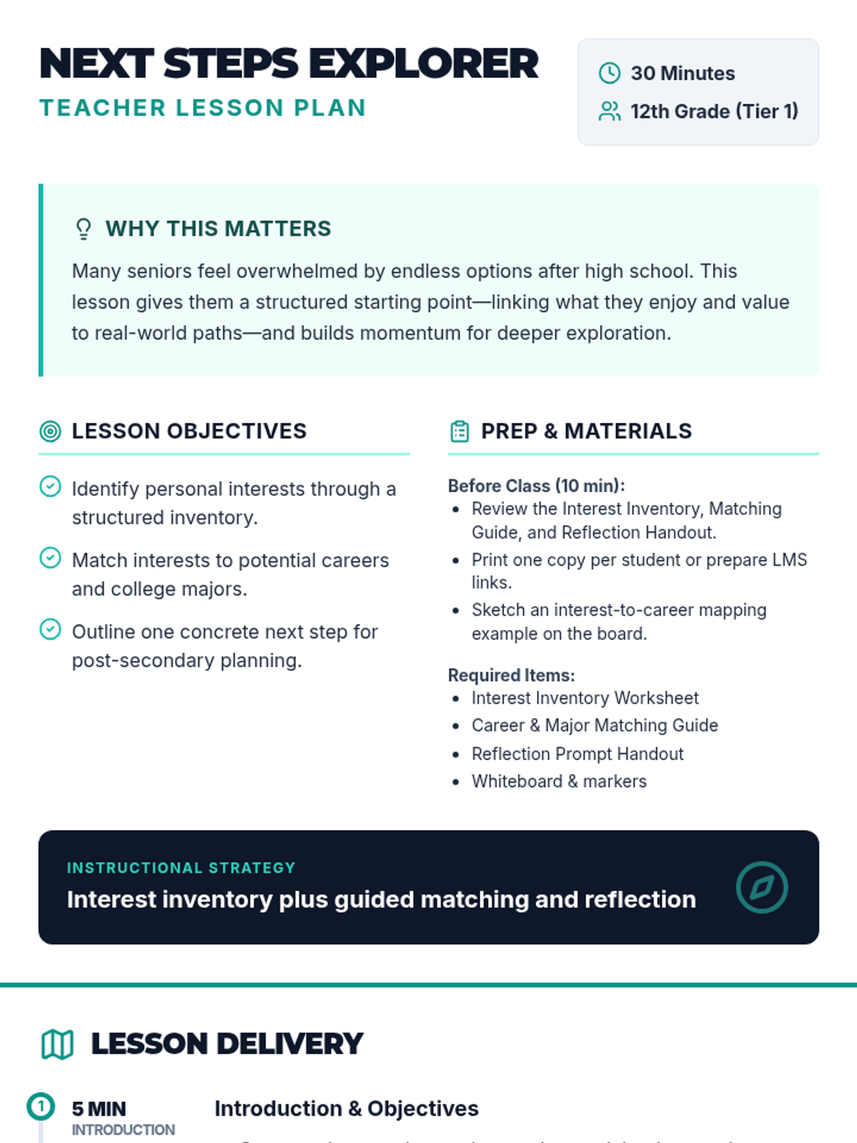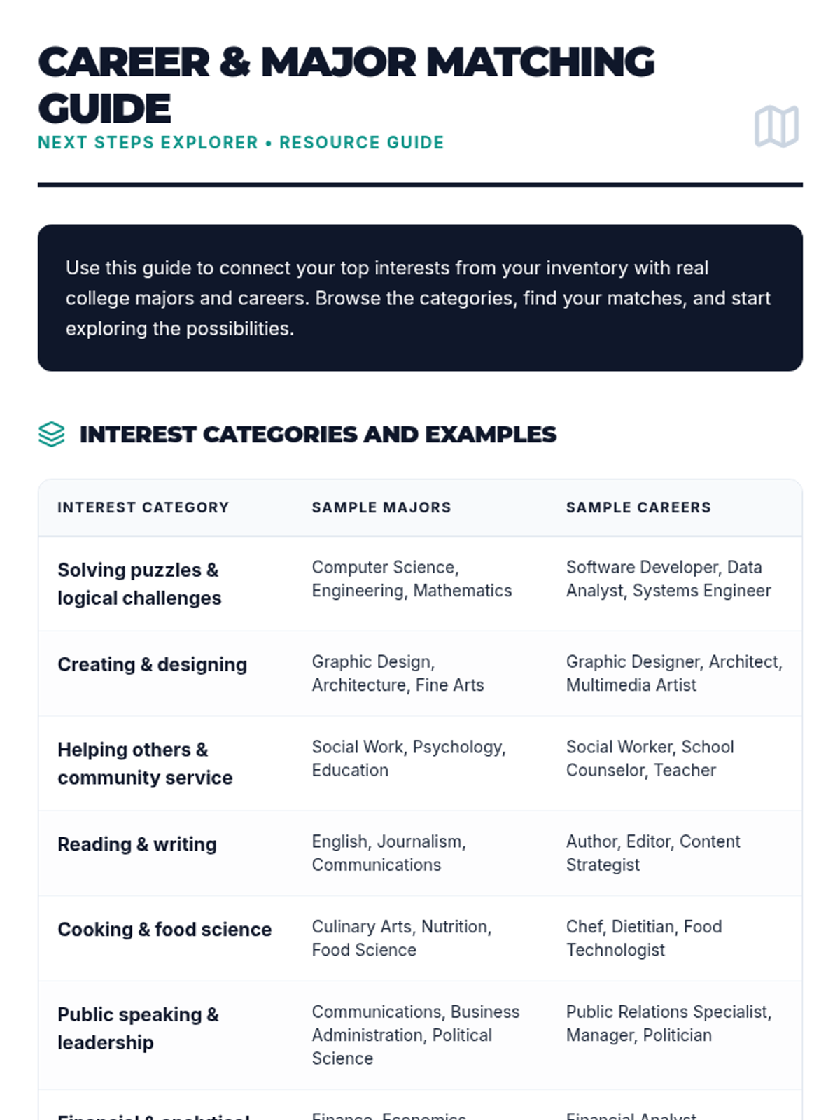 A 30-minute foundational session for seniors to begin exploring career and college major options by matching personal interests and strengths to real-world paths.