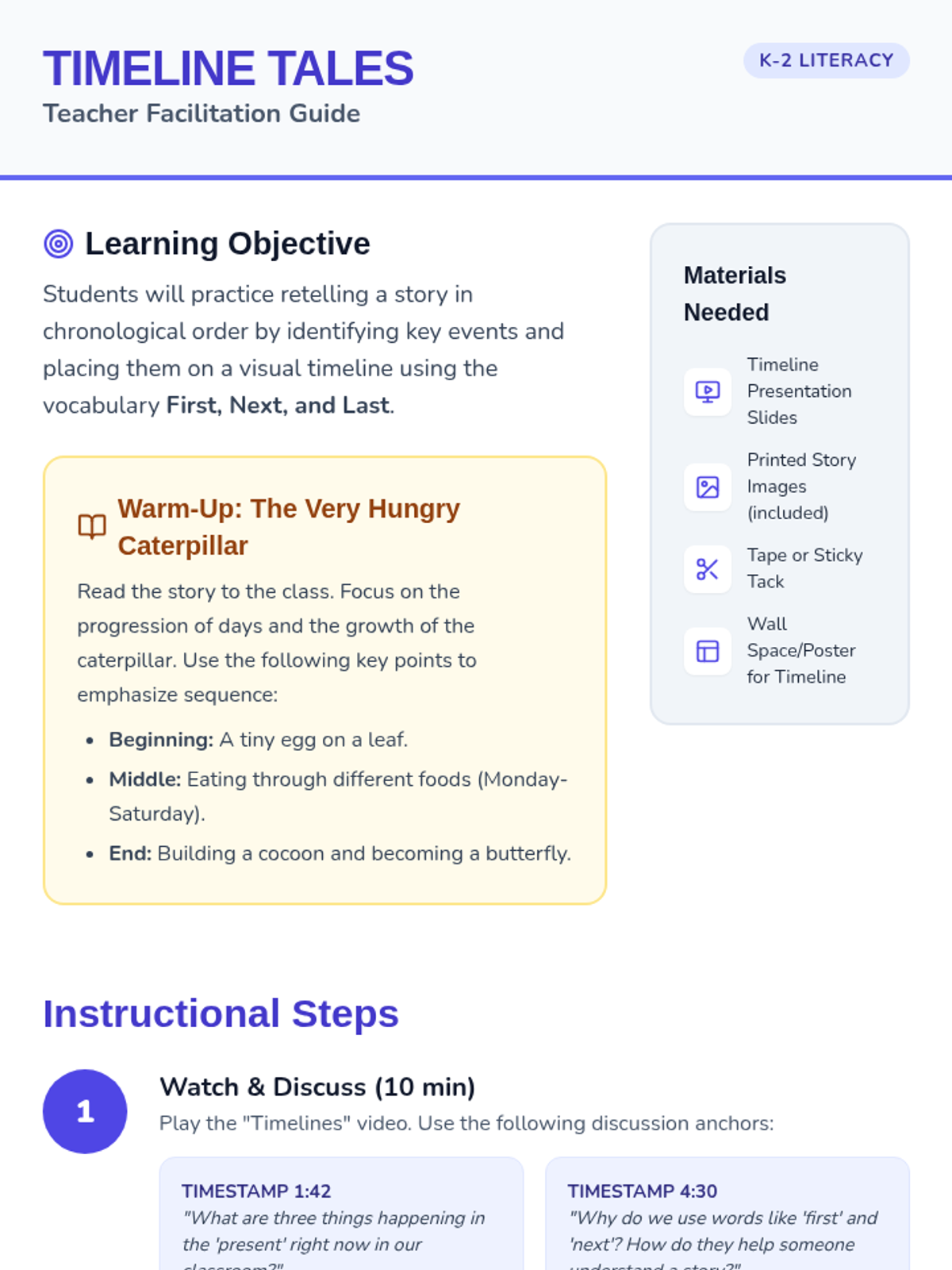 Students learn to retell stories in chronological order by creating visual timelines. They watch an instructional video, discuss sequence words (First, Next, Last), and work in groups to order scenes from a familiar story.