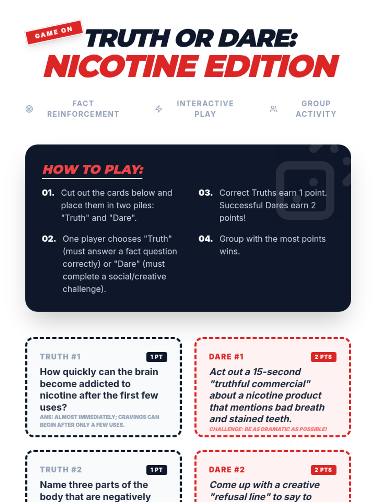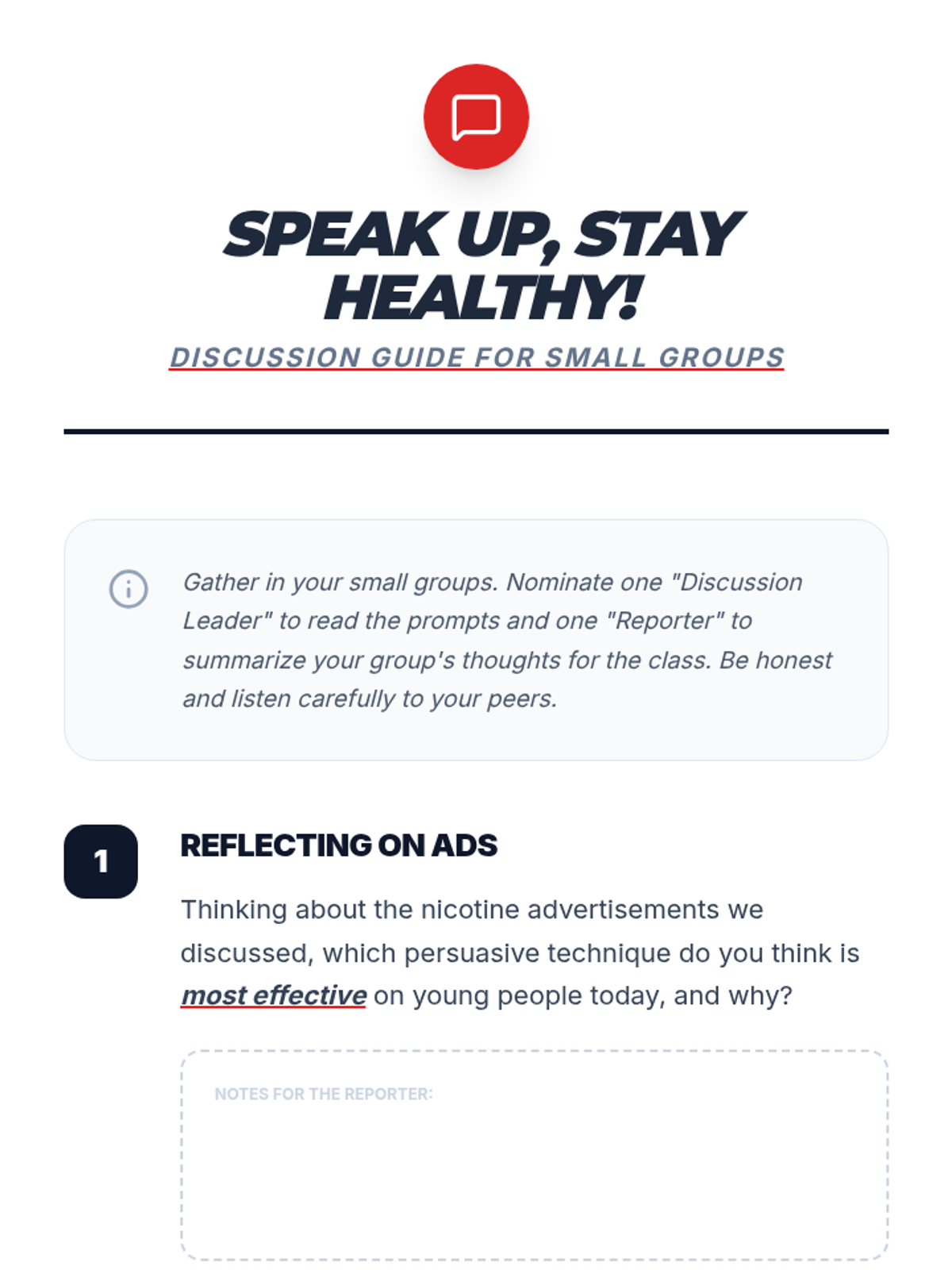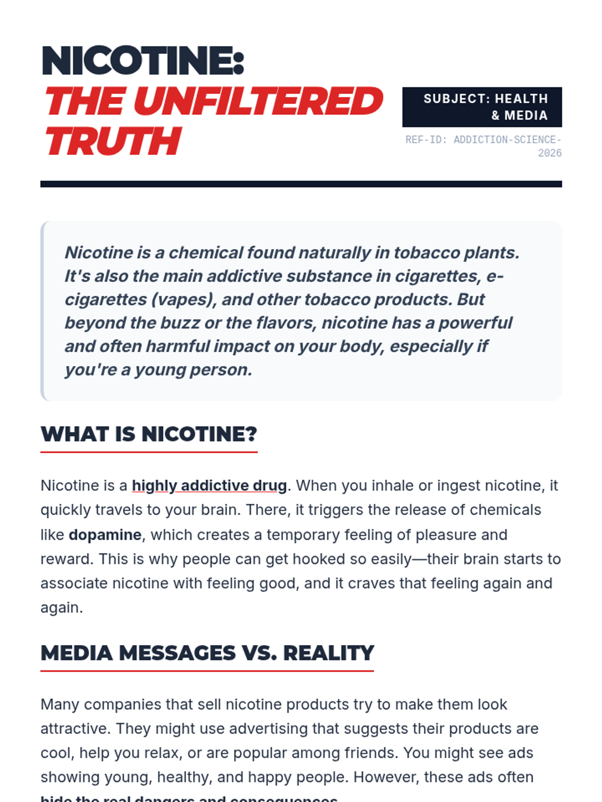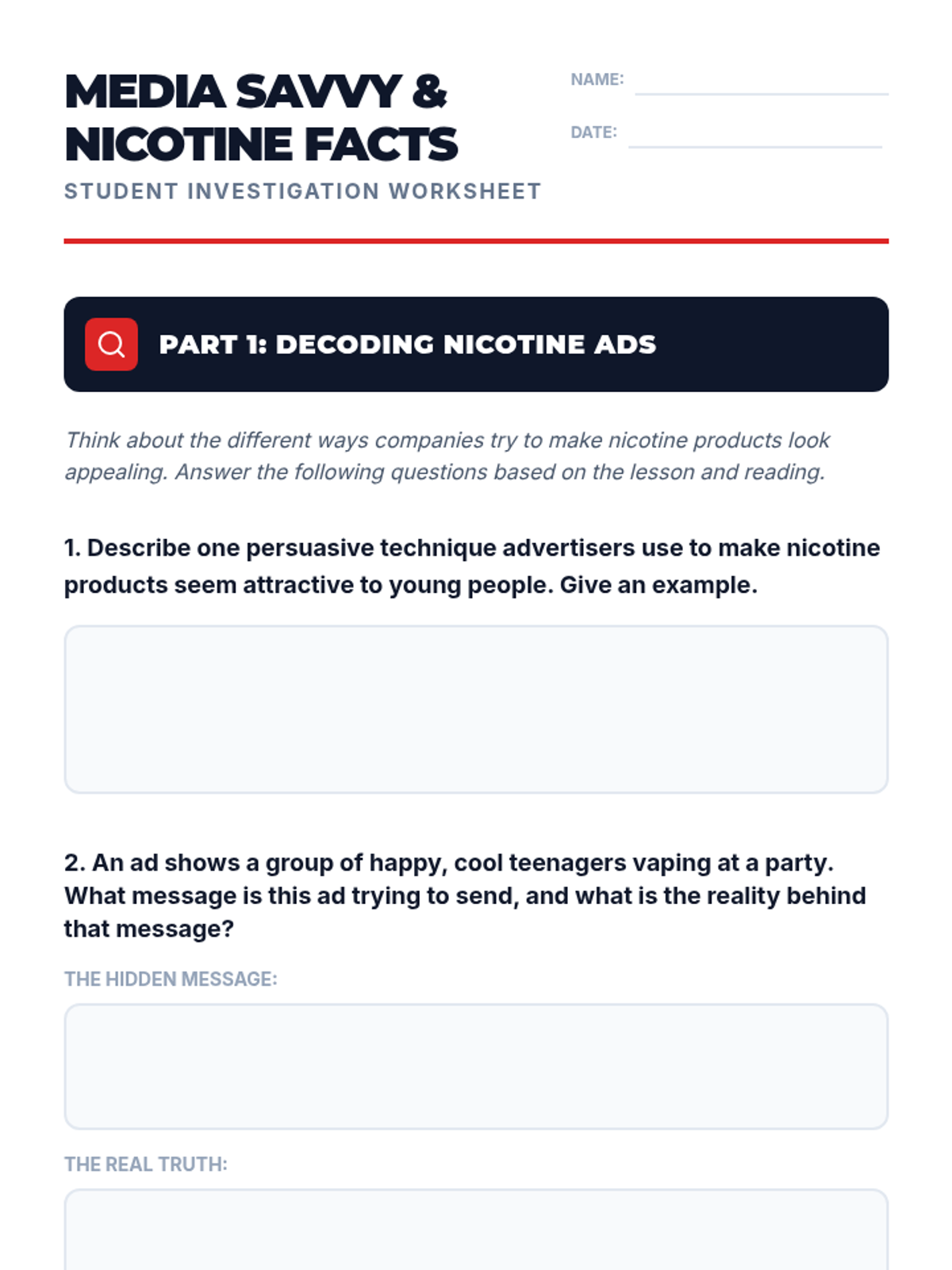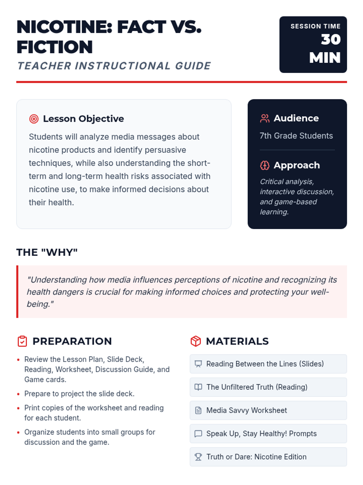 This 30-minute lesson for 7th graders empowers students to critically analyze nicotine advertising and understand the real health consequences of nicotine use. Through a slide presentation, guided reading, and interactive activities, students develop media literacy skills to make informed health decisions.
