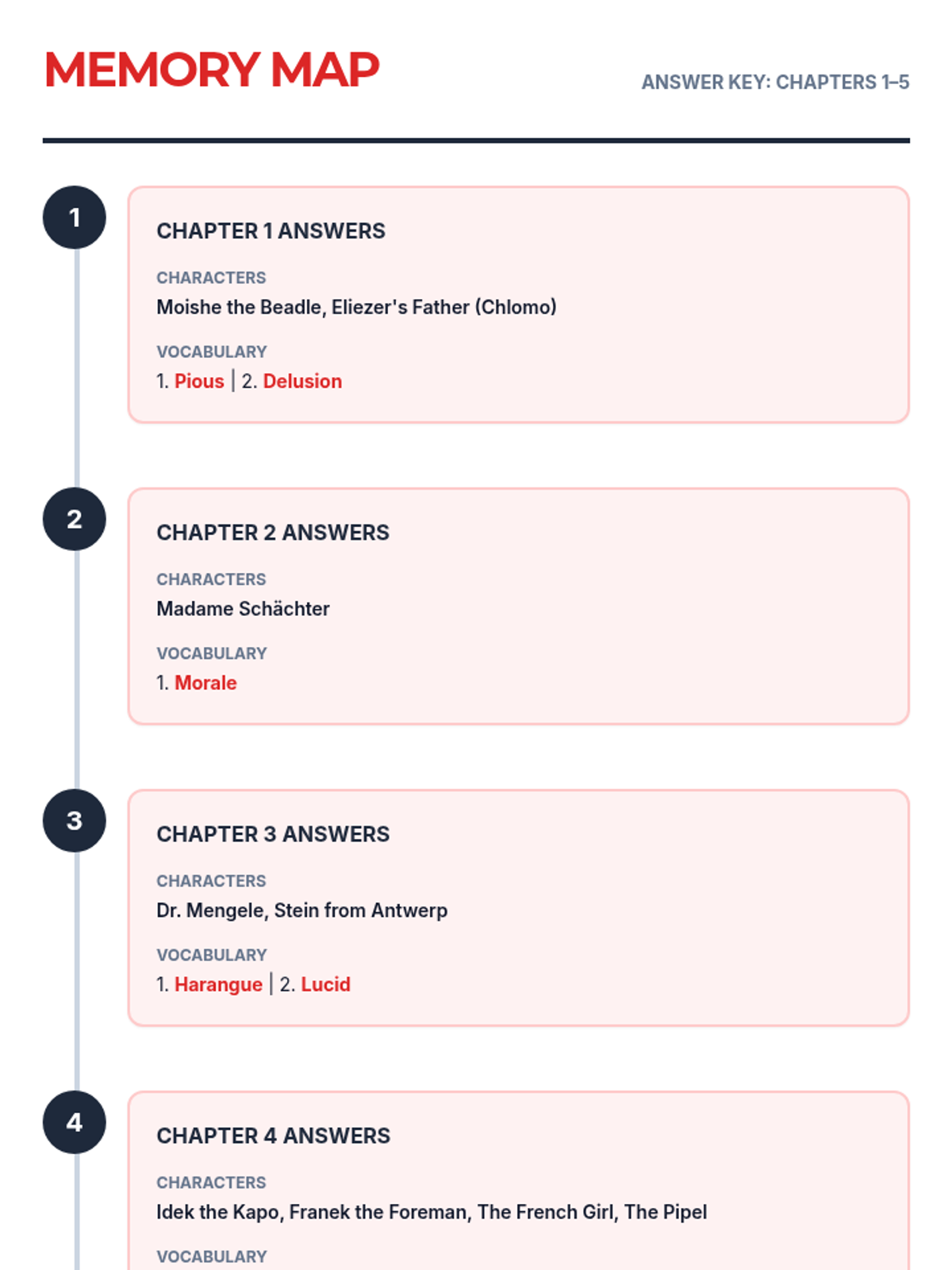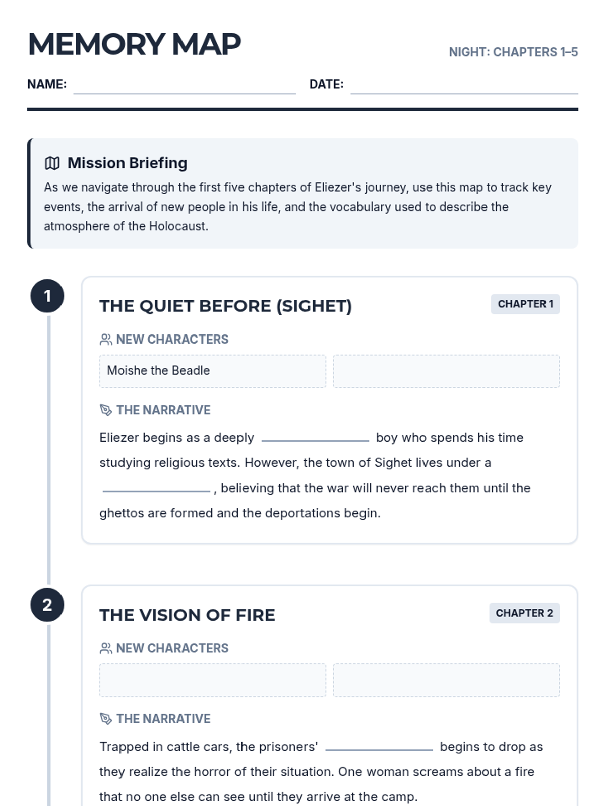 A lesson focused on tracking the chronological events, character introductions, and key vocabulary across the first five chapters of Elie Wiesel's 'Night'.