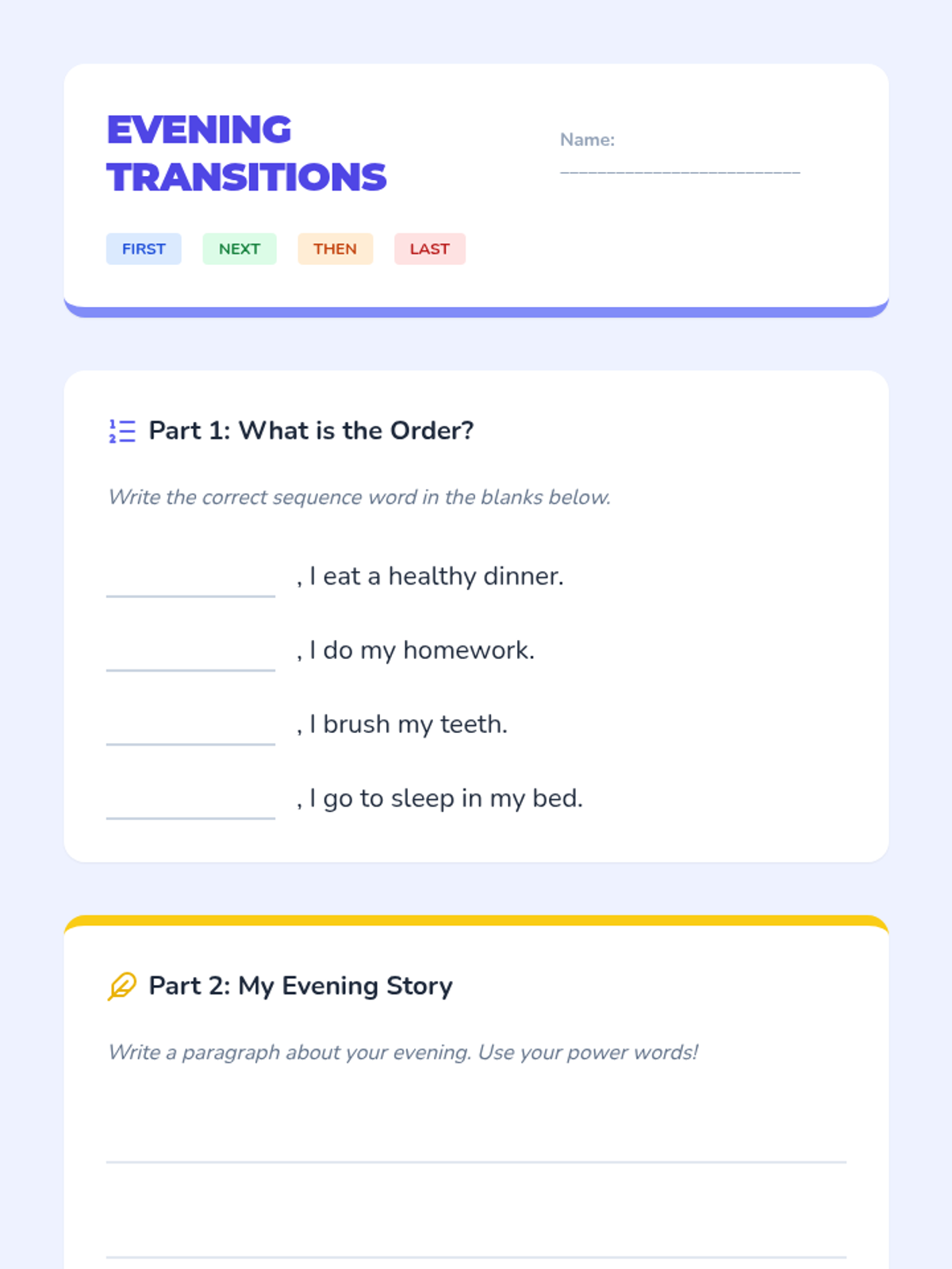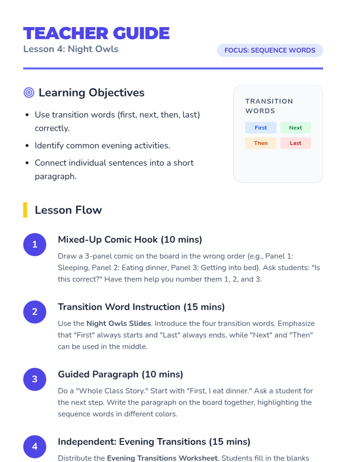 Students introduce transition words (first, next, then, last) to connect evening activities and build cohesive narrative paragraphs.