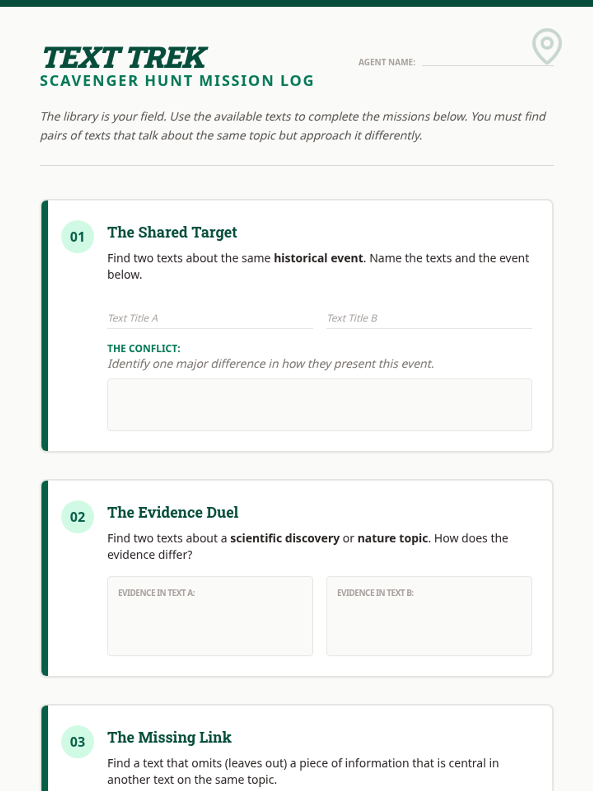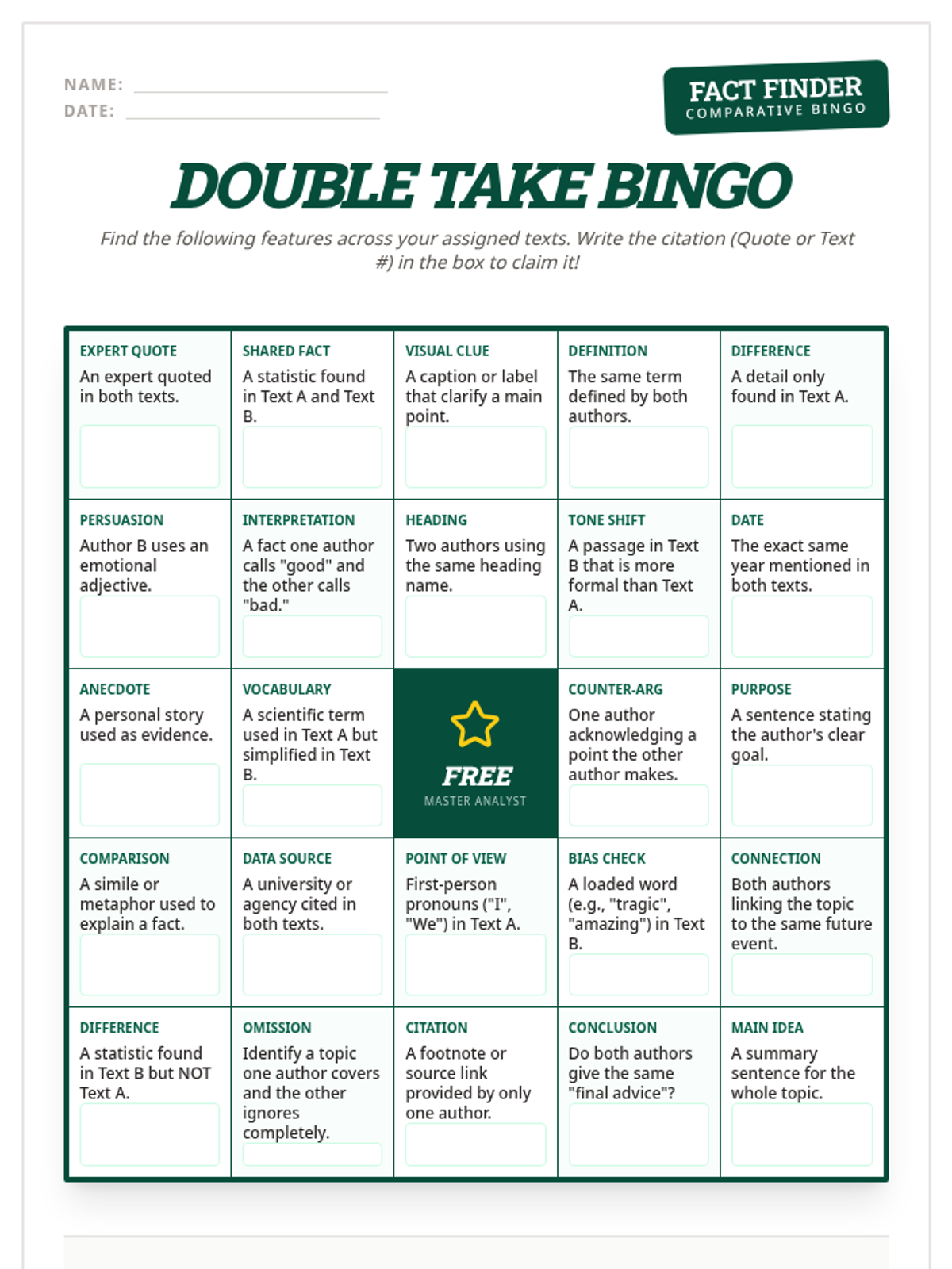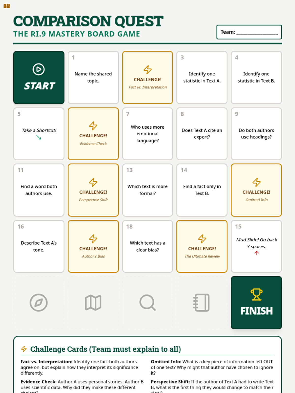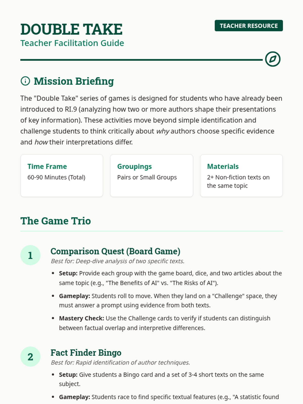A high-energy, game-based lesson designed to reinforce RI.9 standards. Students engage in a multi-modal 'Double Take' challenge involving a board game, bingo, and a scavenger hunt to analyze how different authors present the same non-fiction topics.