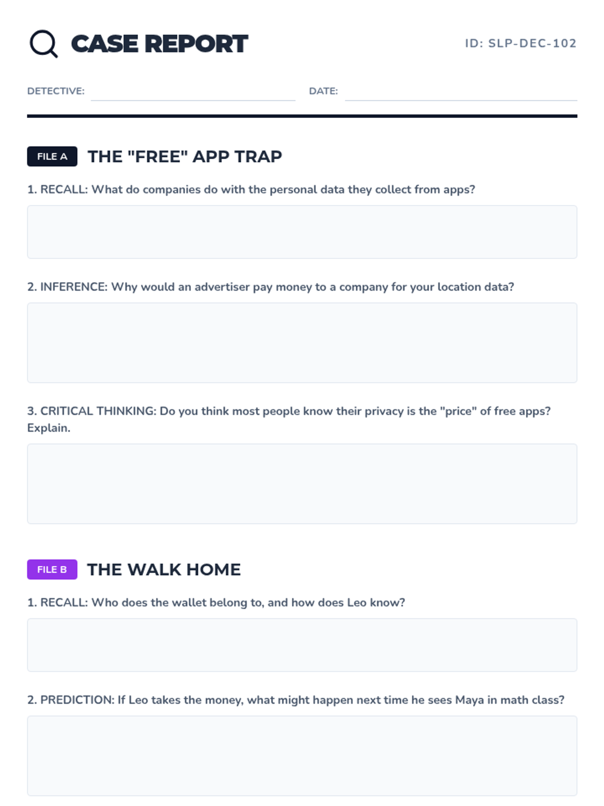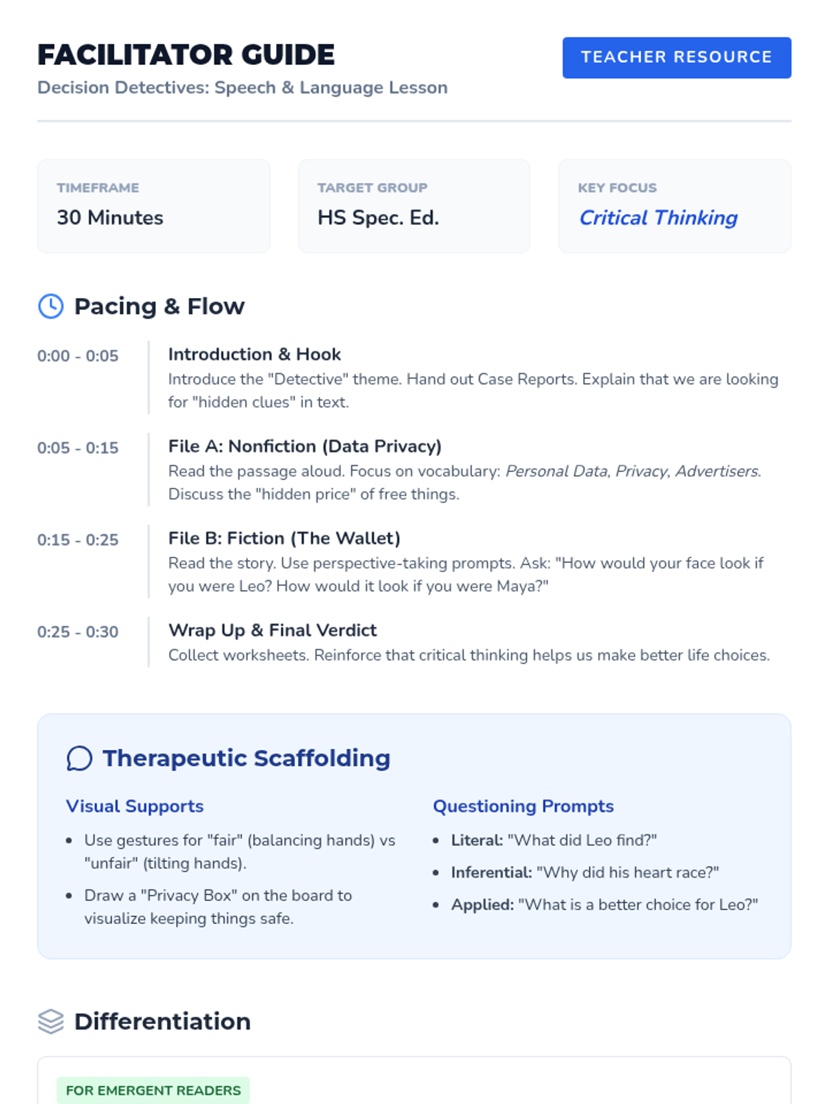 A 30-minute speech and language activity focused on comprehension and critical thinking using paired fiction and nonfiction texts. Designed for high school special education students with a "Case File" investigation theme.