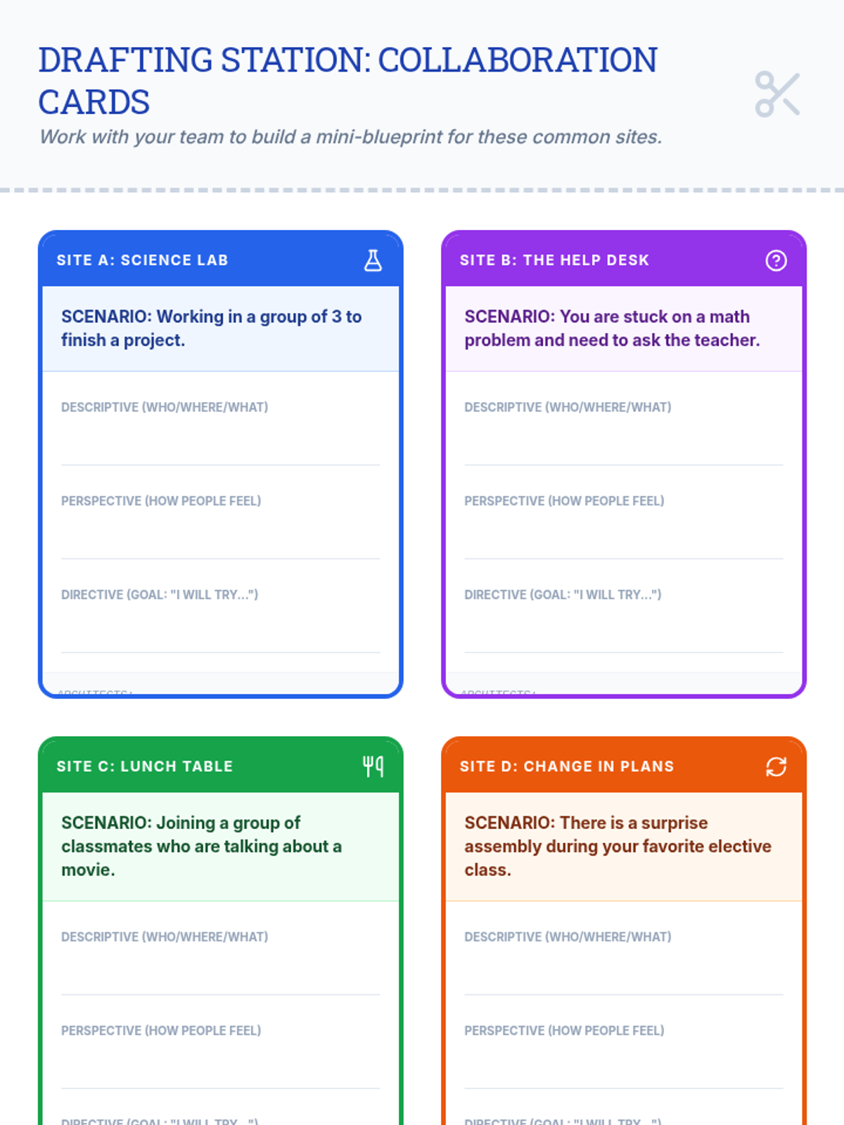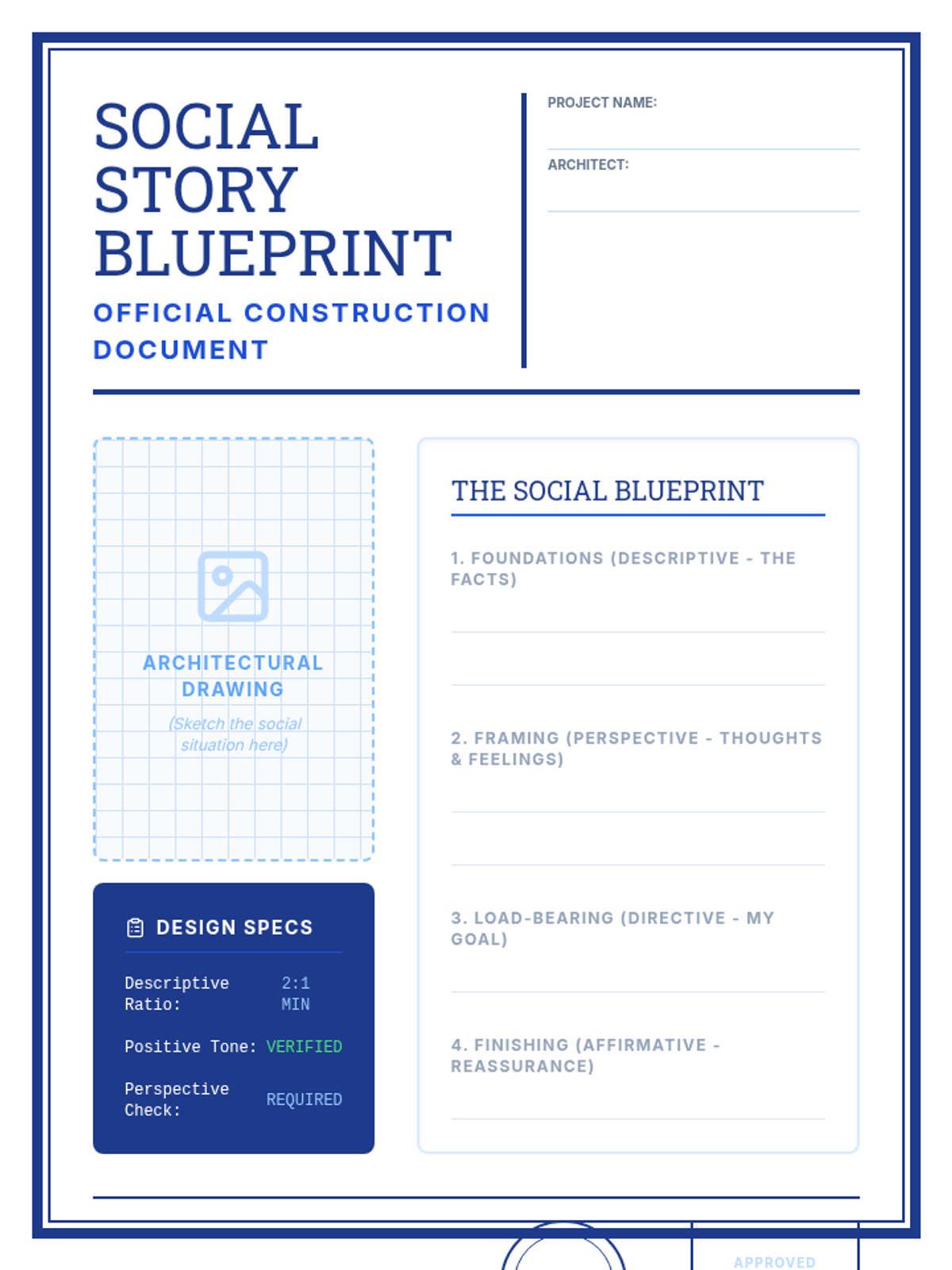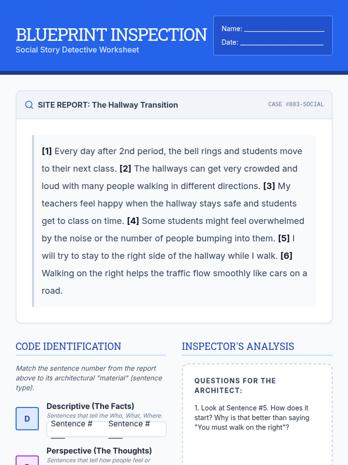 A structured lesson for 8th-grade special education students to learn the art of crafting social stories. Students will analyze examples, identify social cues, and build their own 'Blueprints for Success' to navigate social transitions and group interactions with confidence.
