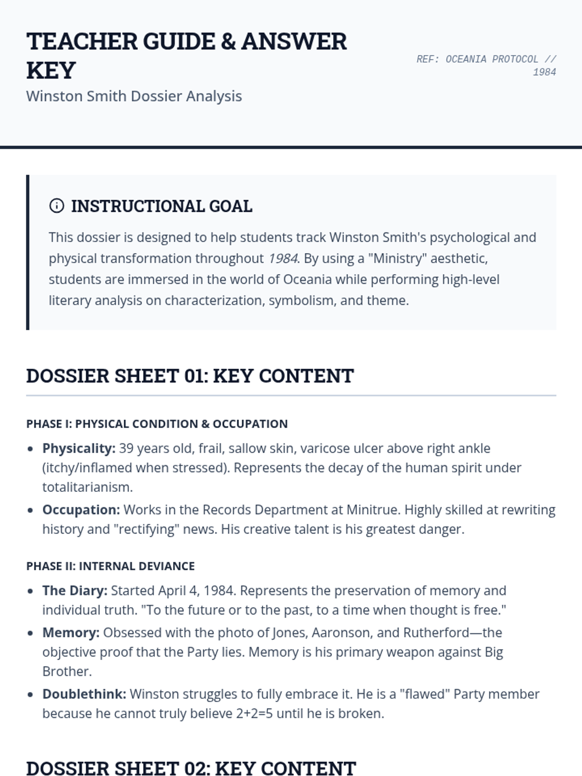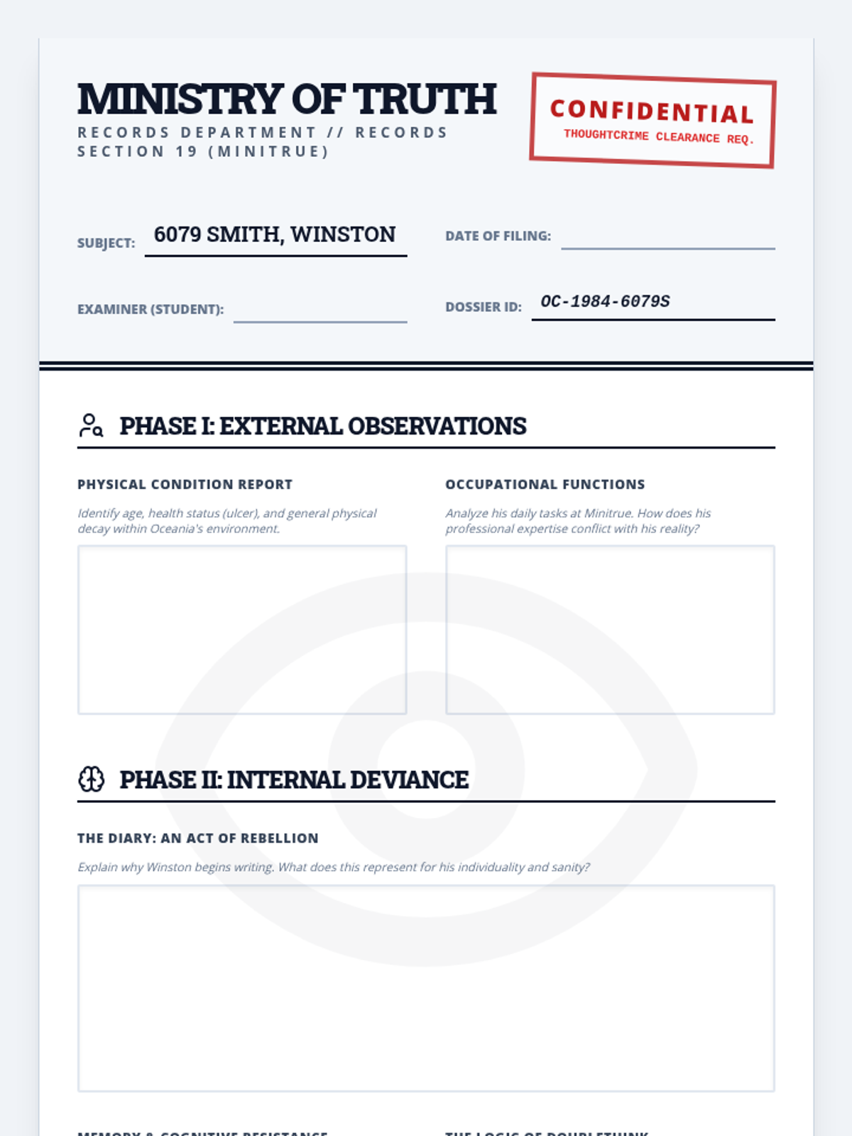 A character analysis lesson focused on Winston Smith's internal and external rebellion in George Orwell's '1984'. Students use a thematic dossier to deconstruct Winston's physicality, relationships, and psychological arc.