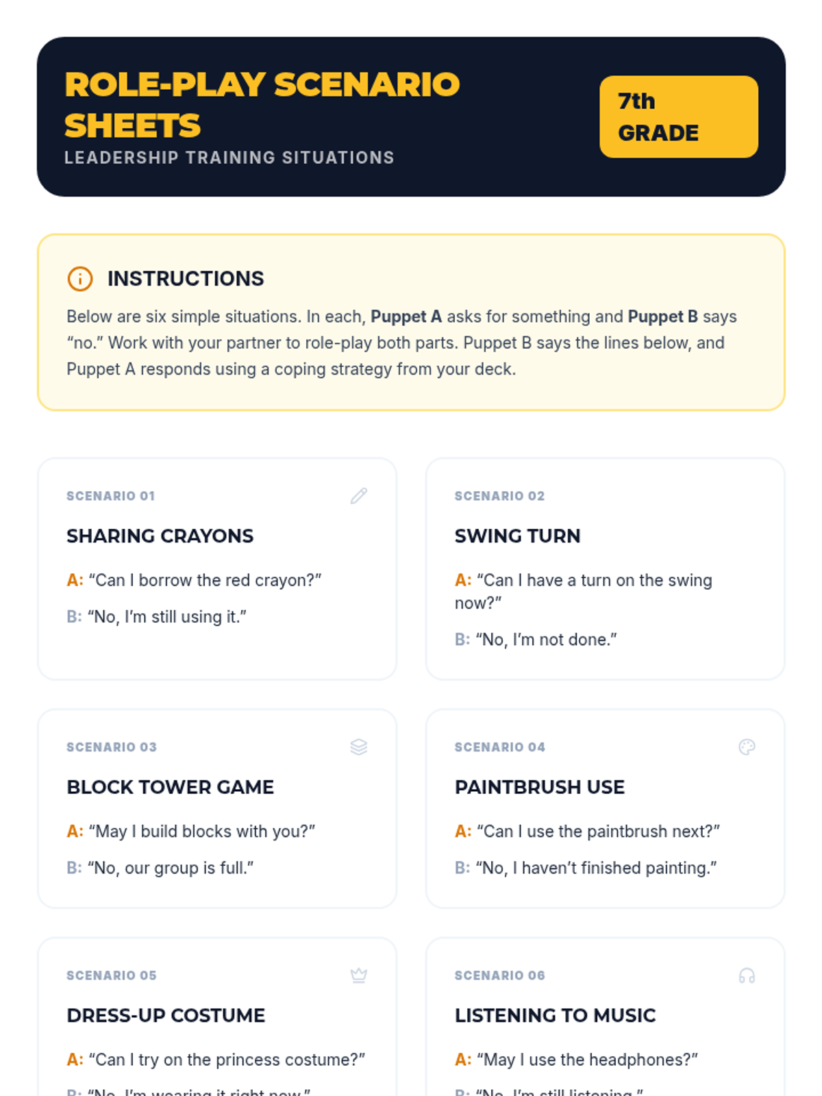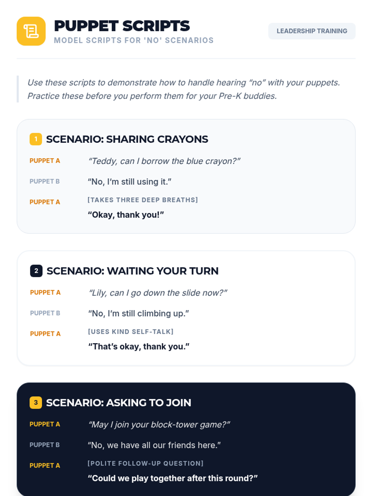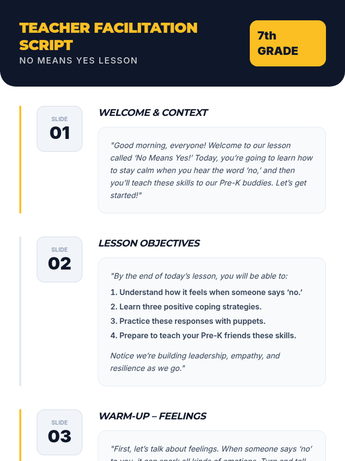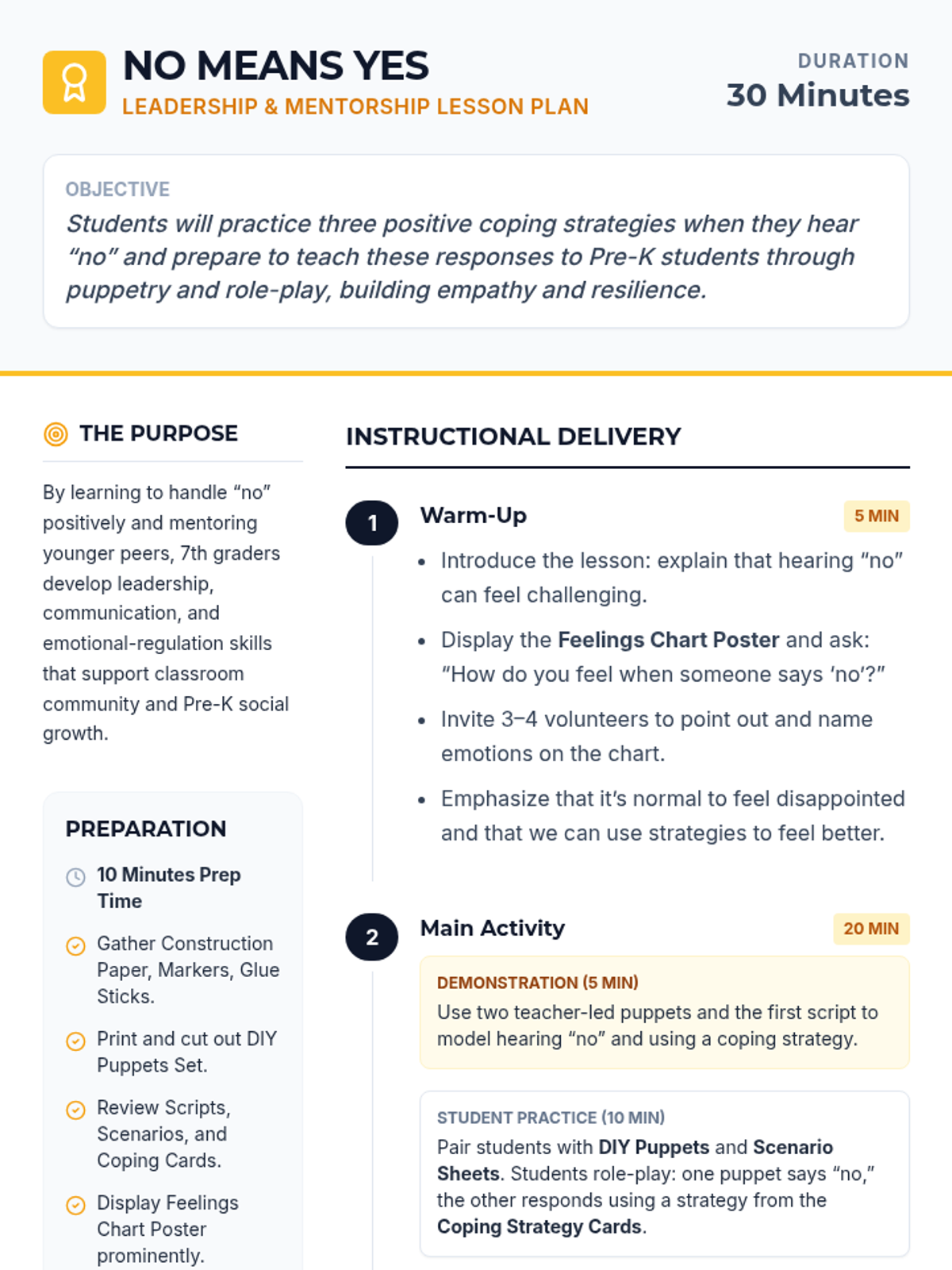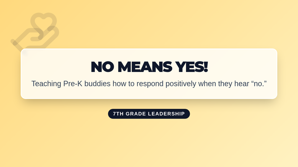 A 30-minute Tier 1 classroom lesson where 7th graders learn leadership and emotional regulation skills by preparing to teach Pre-K students how to positively respond to 'no'. through puppetry and role-play.
