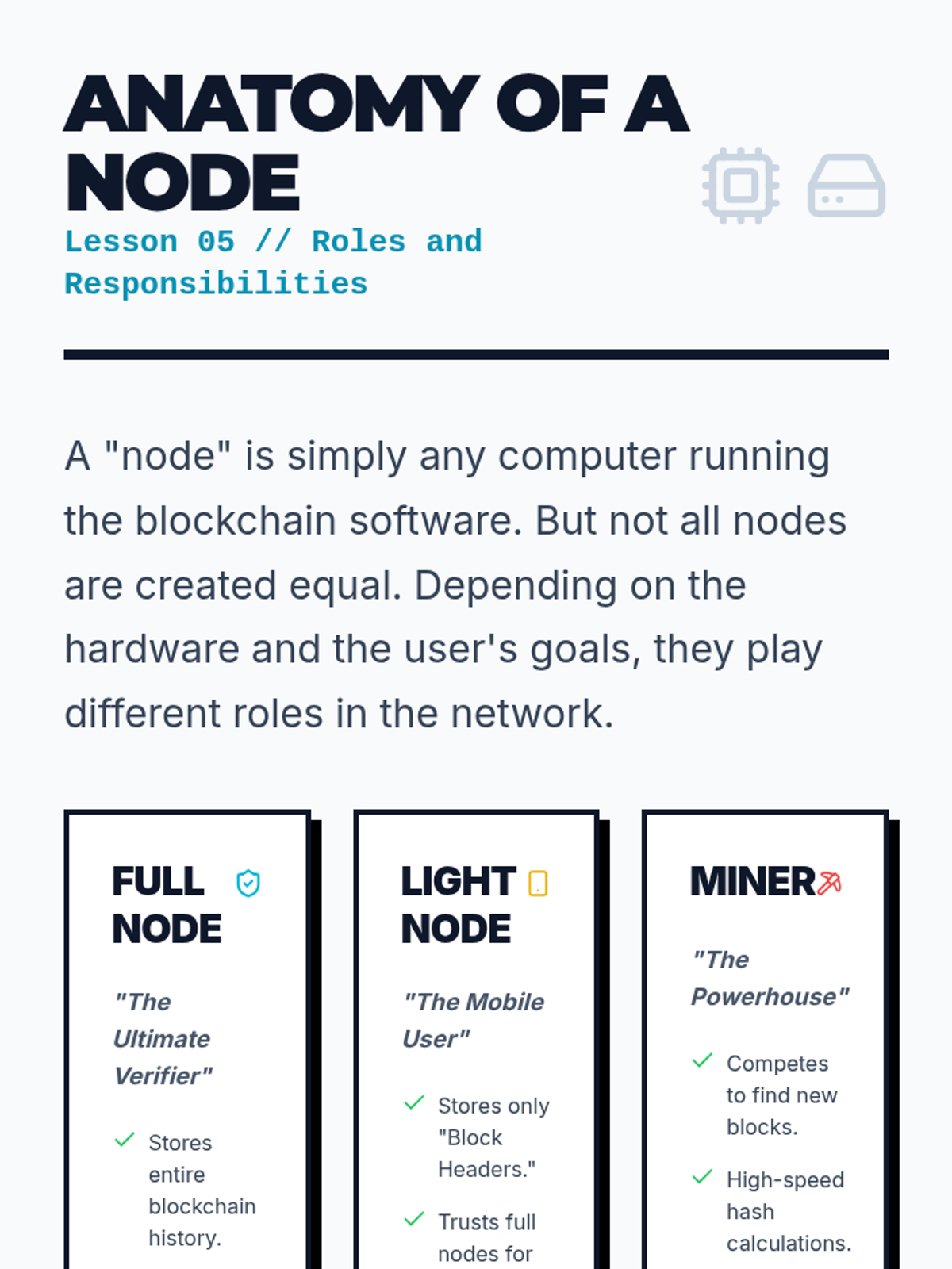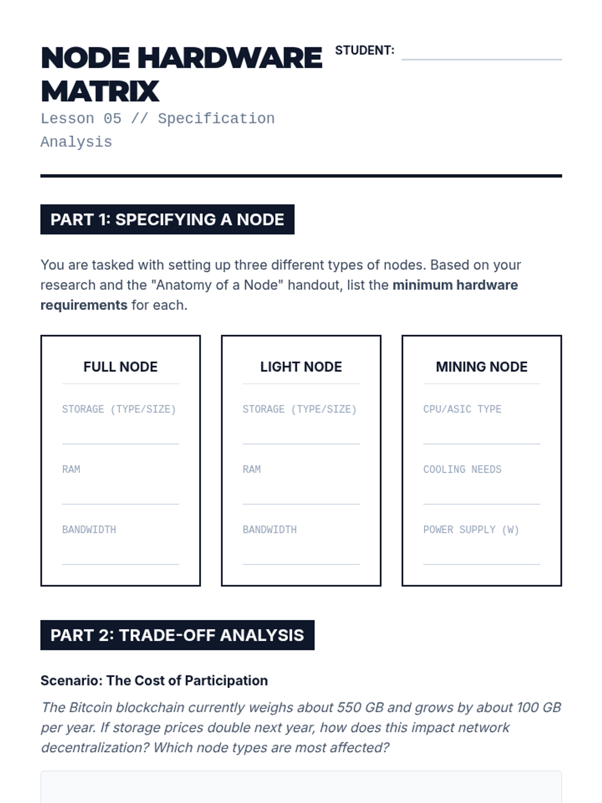 Students categorize the different roles nodes play in a blockchain network, from full nodes to light clients. They evaluate hardware requirements and the incentive structures for running a node.