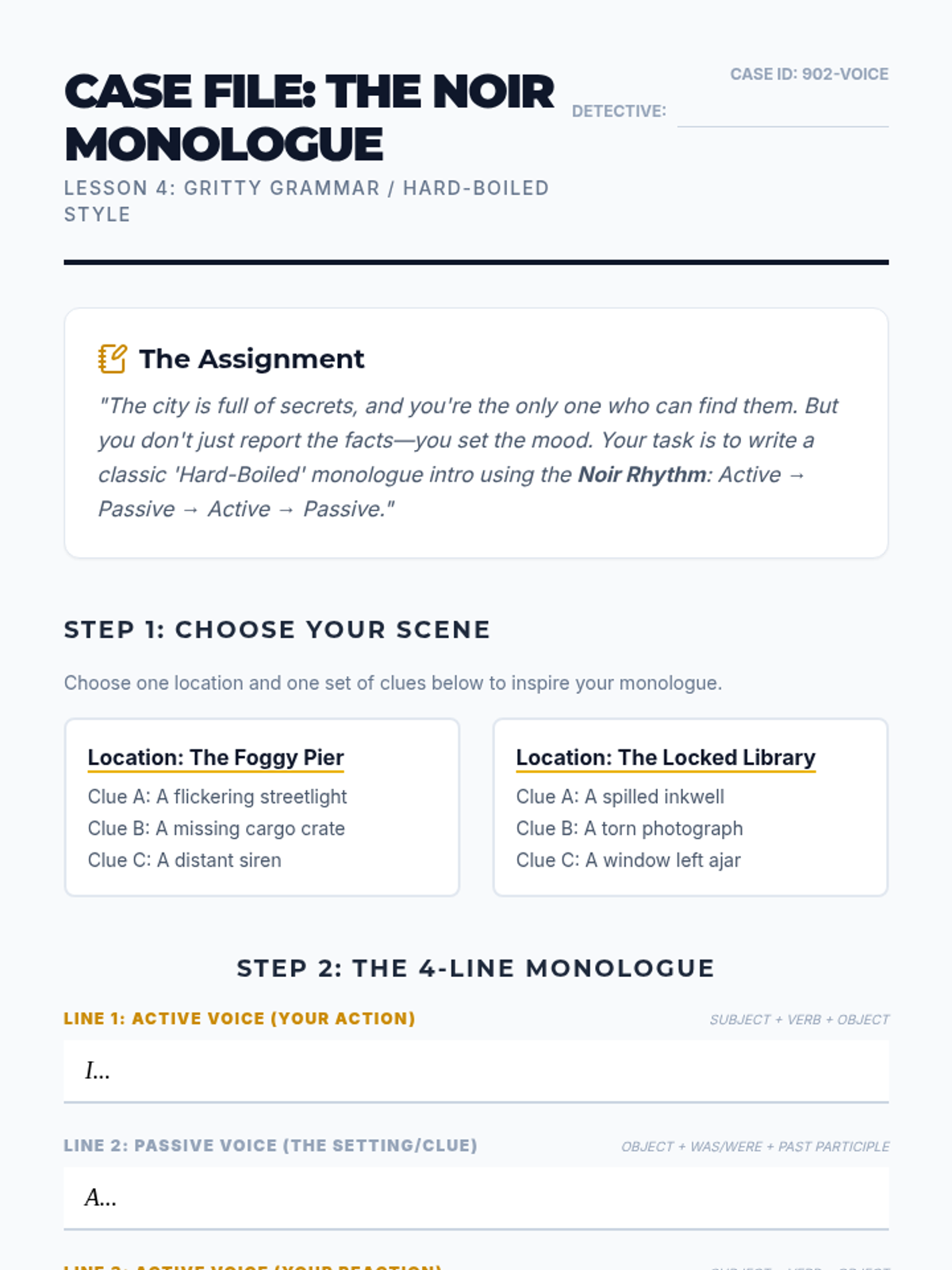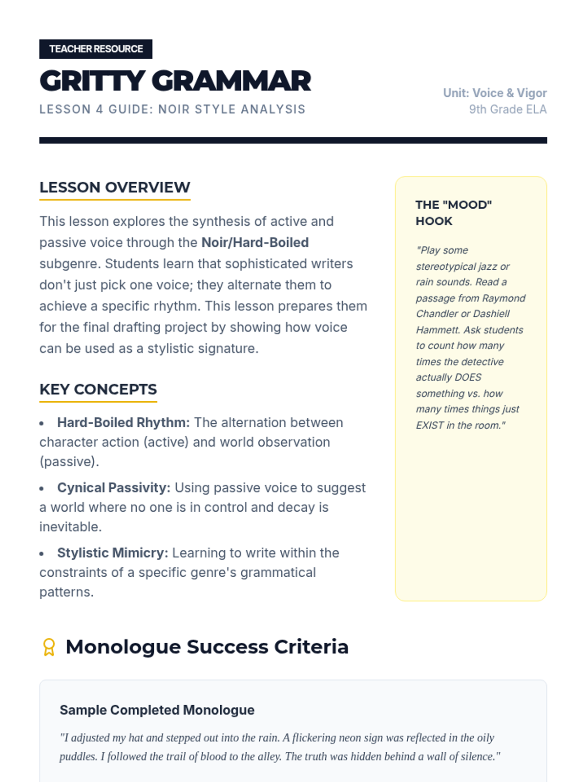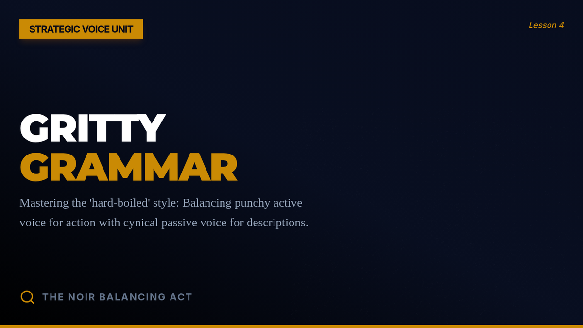Analysis of the 'hard-boiled' noir style, balancing punchy active voice with descriptive passive voice to create a gritty, cynical atmosphere.
