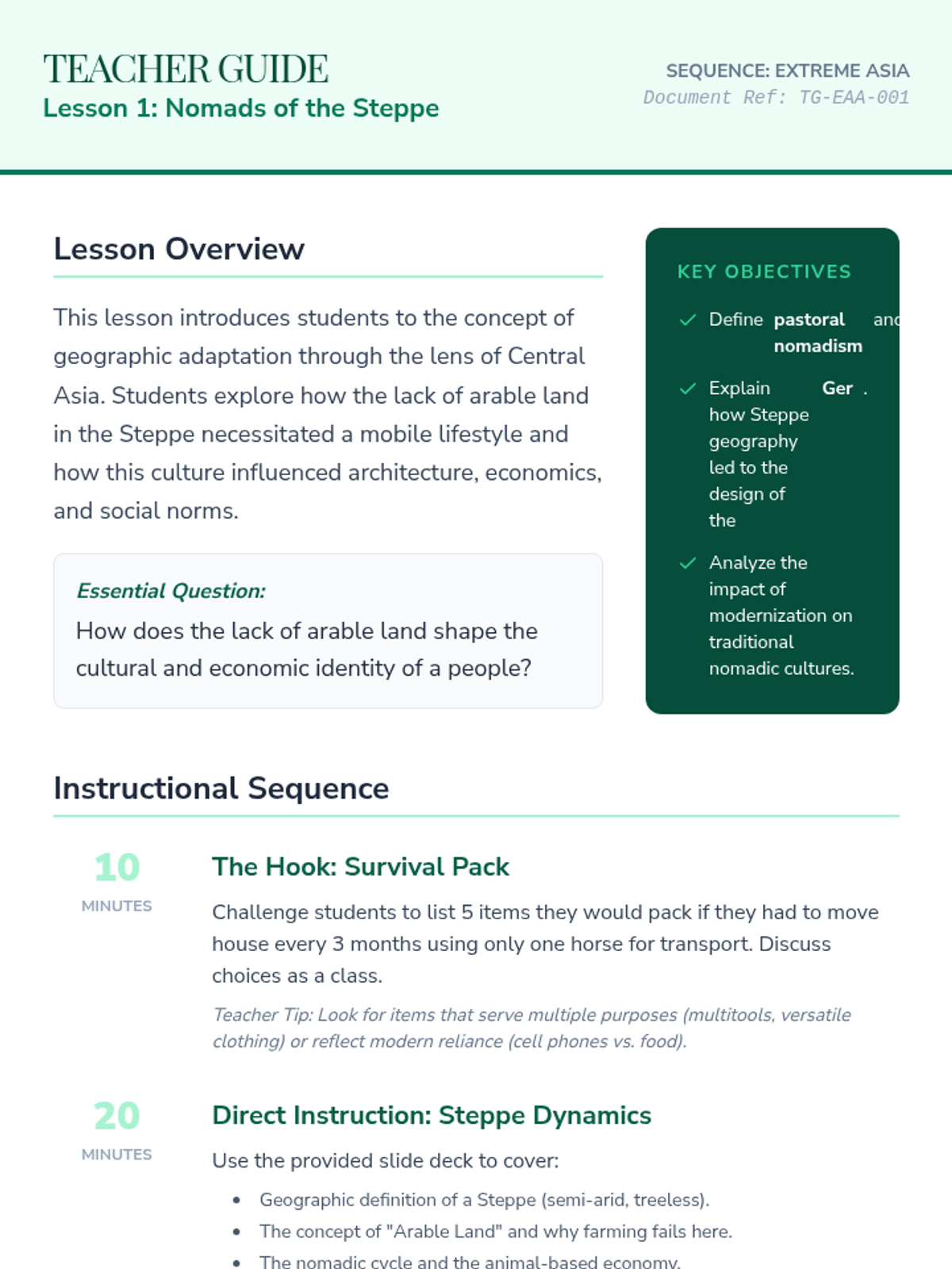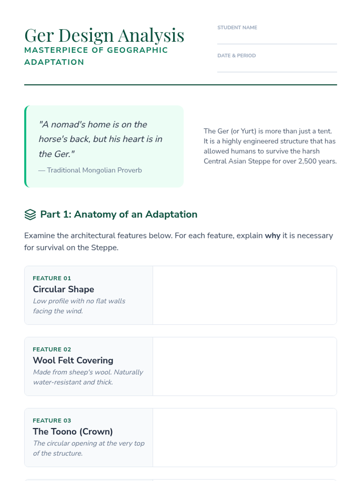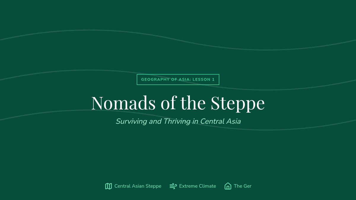 Explores the Central Asian Steppe and the adaptation of pastoral nomadism, focusing on the resource constraints of the region and the ingenious design of the yurt (ger).