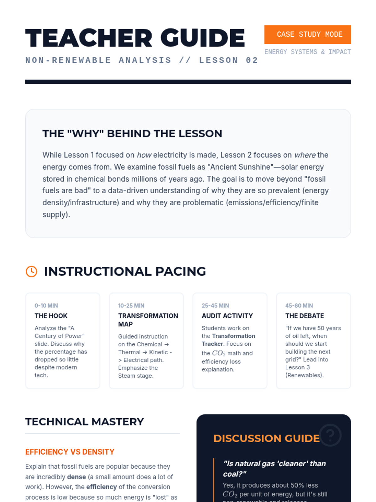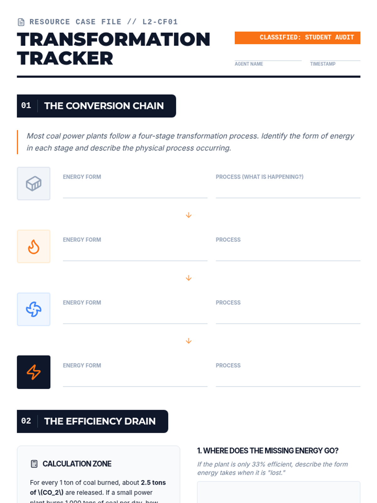Students conduct a case study on fossil fuels (coal, oil, natural gas). They map the energy transformations from chemical potential energy to electrical energy and analyze data regarding efficiency and carbon emissions.
