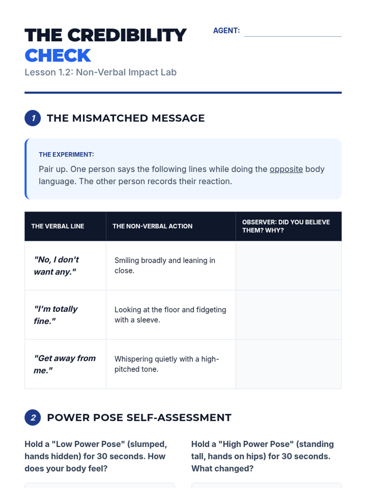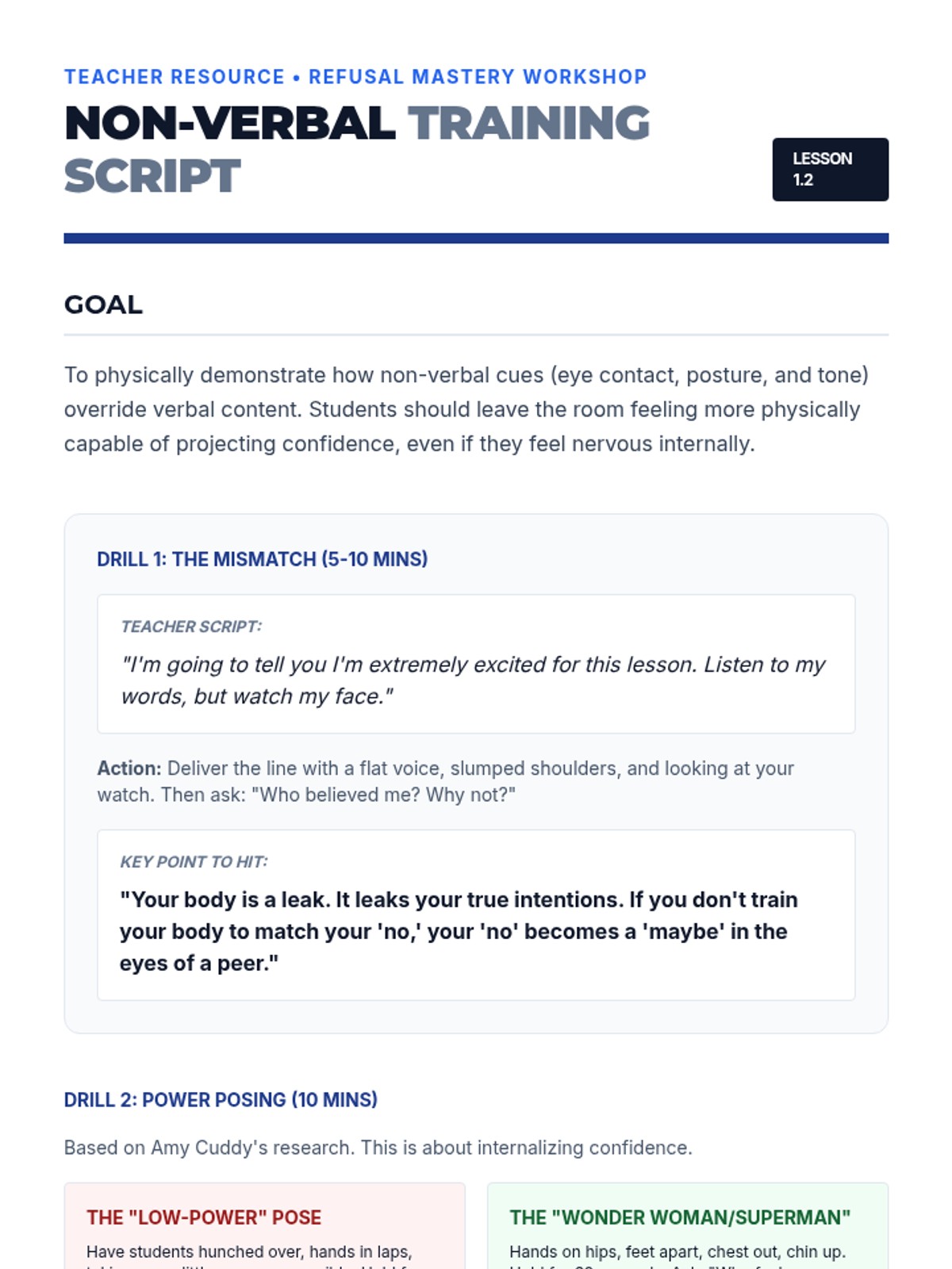 Focuses on the impact of body language, eye contact, and tone of voice on the credibility of a refusal, including 'power posing' techniques.