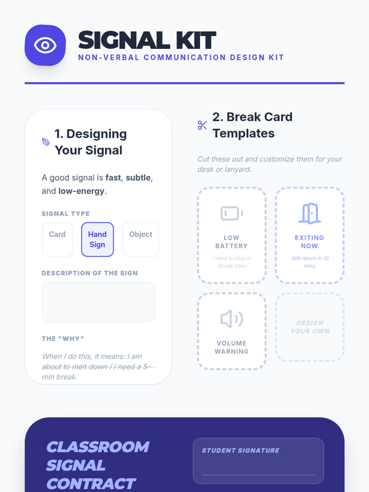 Students design and practice non-verbal signals to communicate the need for a break when verbal communication becomes difficult during dysregulation.