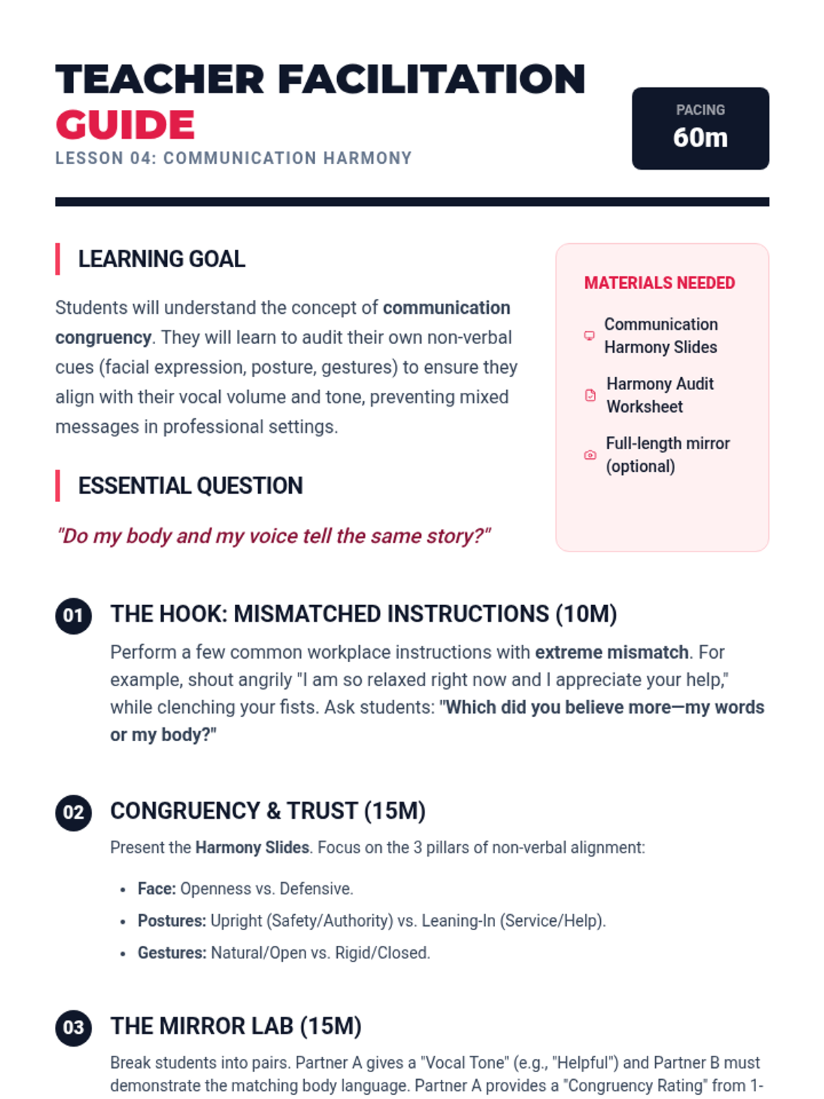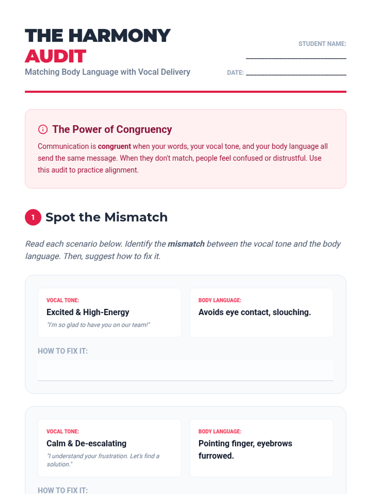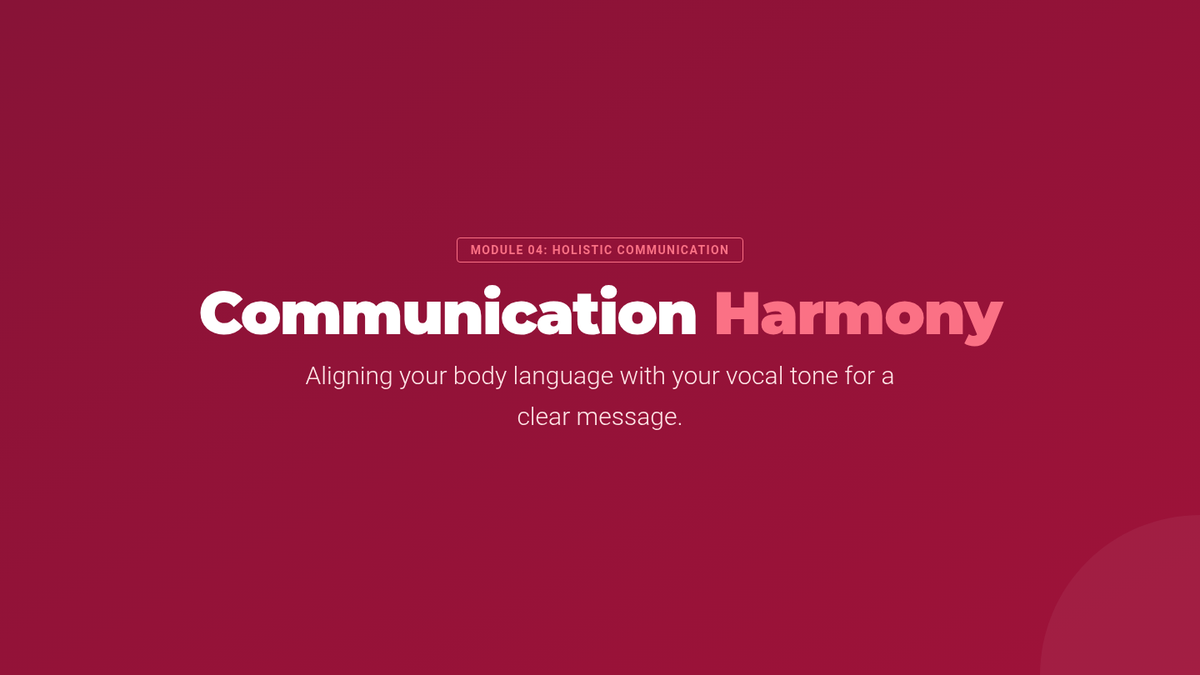 Examines the alignment between body language and vocal tone for clear communication.