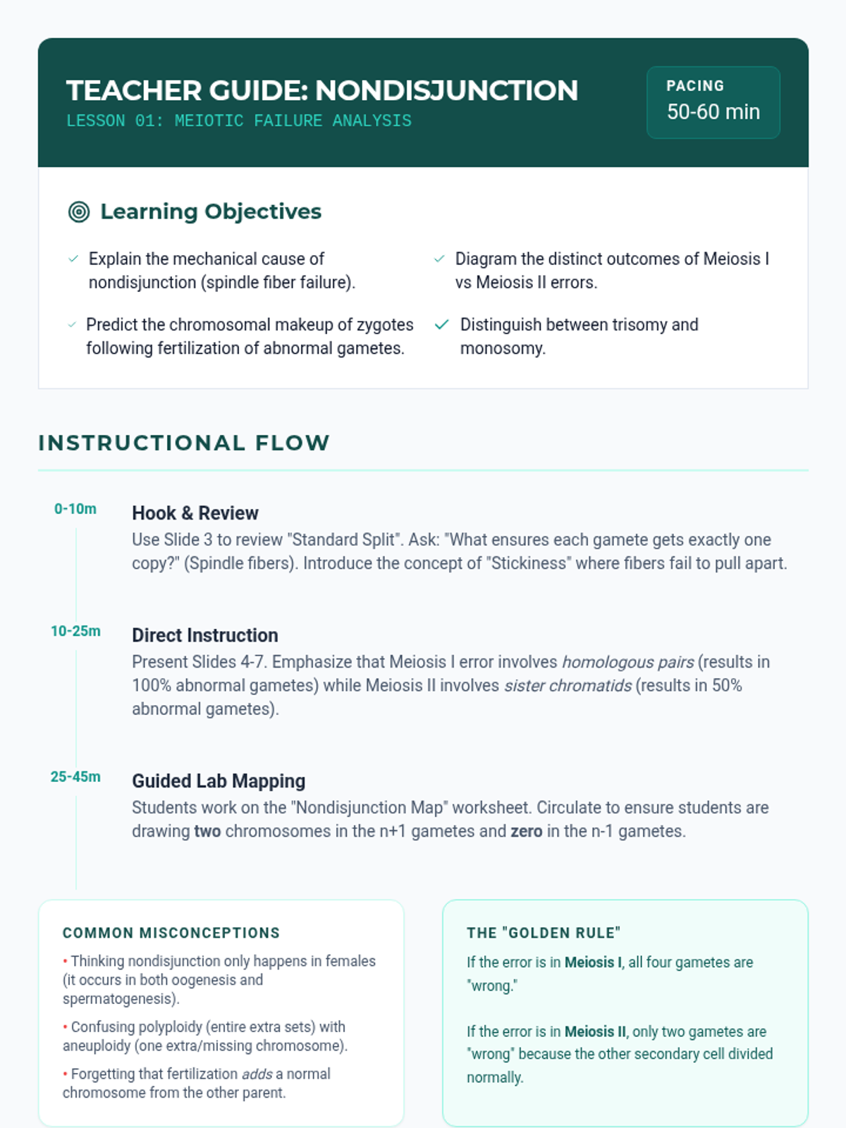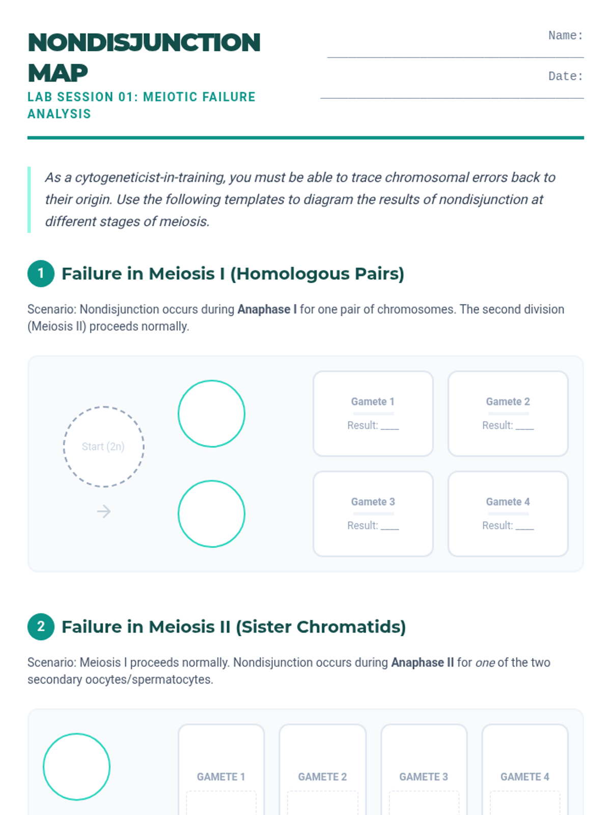 Students investigate how spindle fiber failure during Meiosis I versus Meiosis II leads to different outcomes in gametes. They diagram the resulting aneuploidy in potential offspring.