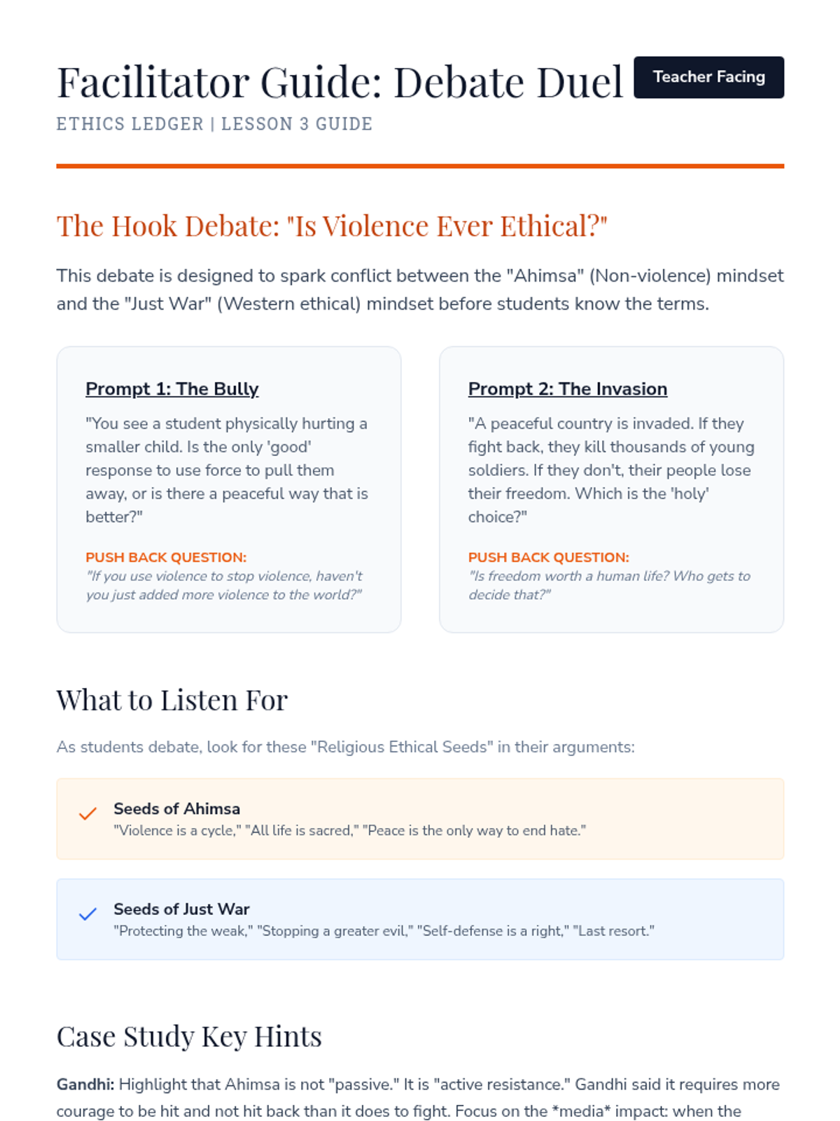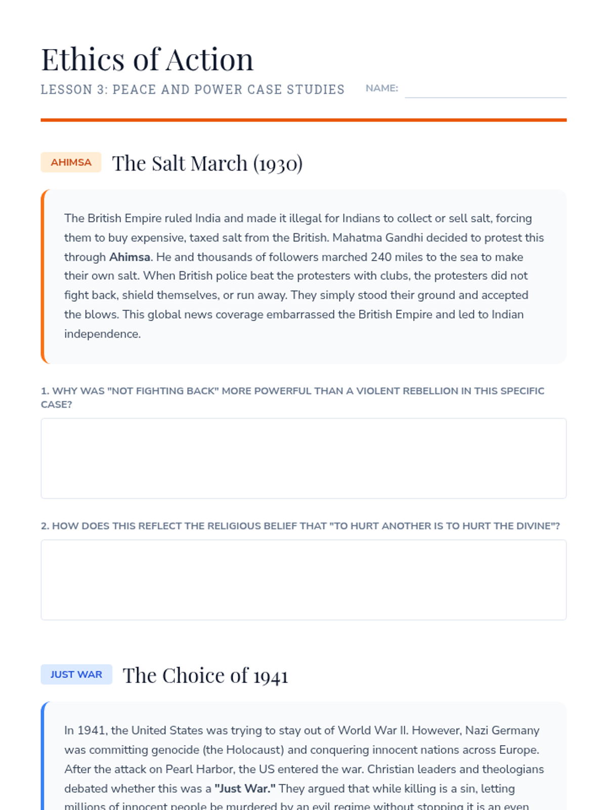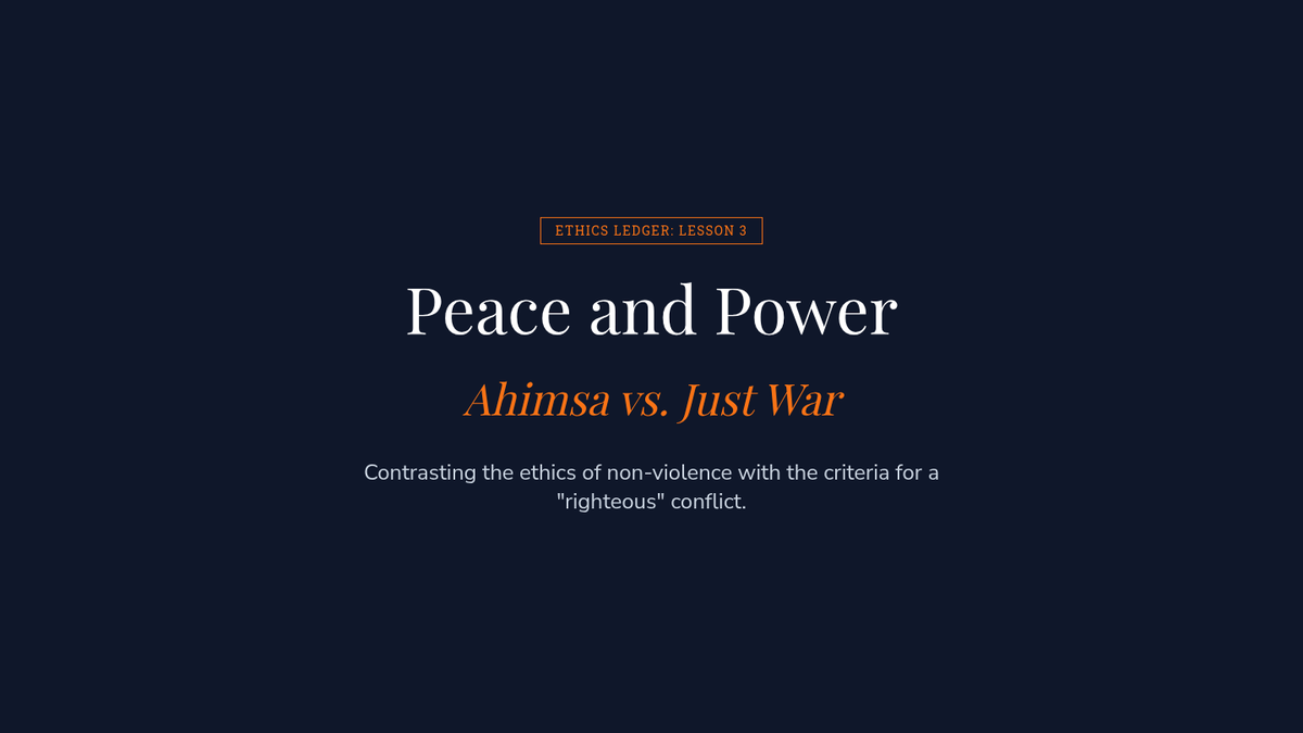 Contrasts Ahimsa (non-violence) with Just War Theory, analyzing historical movements and conflicts.