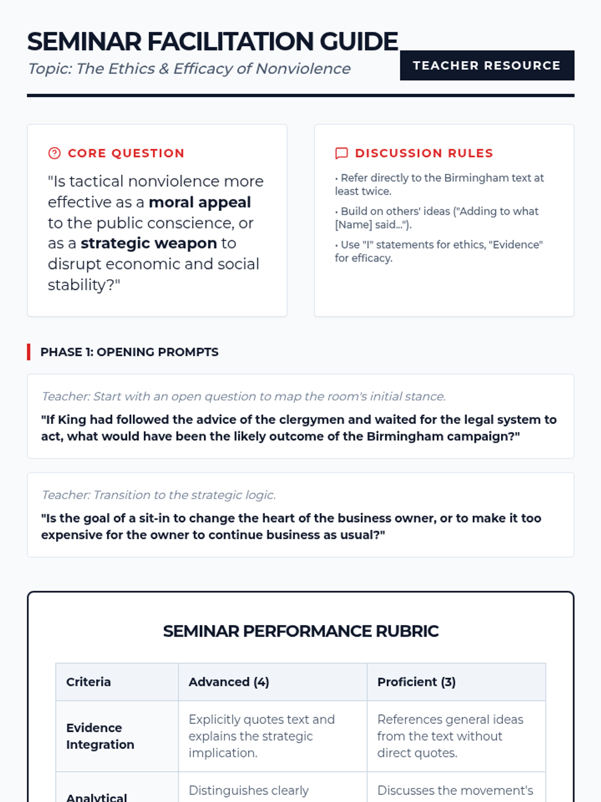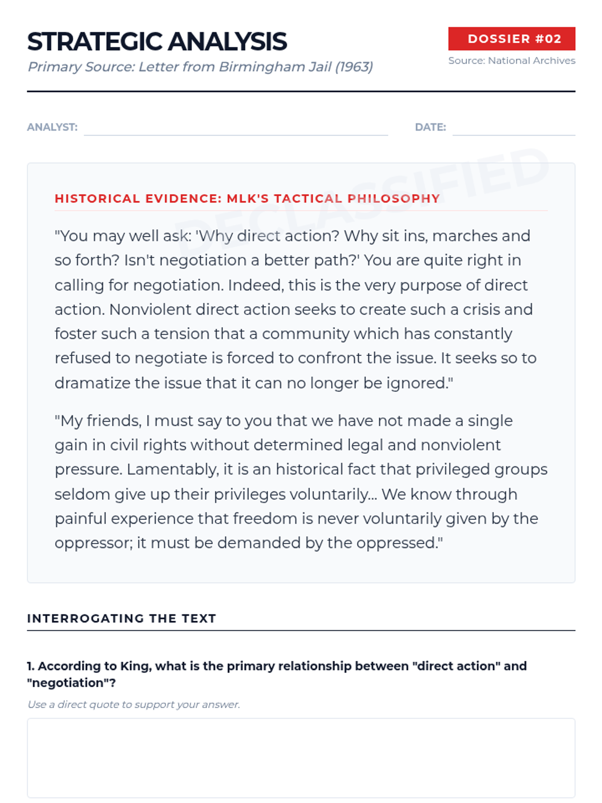 Focusing on the Civil Rights Movement, students dissect the strategic logic behind nonviolent direct action. They examine primary source documents to analyze how specific actions were designed to provoke government responses.