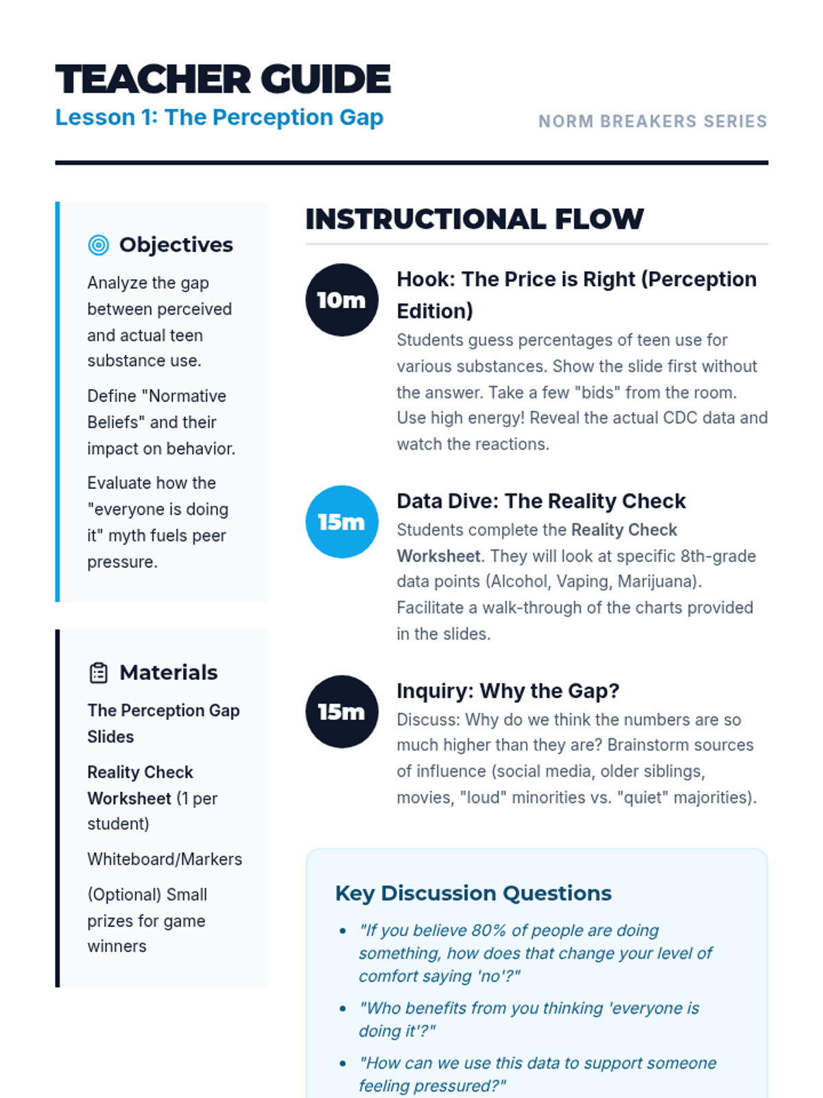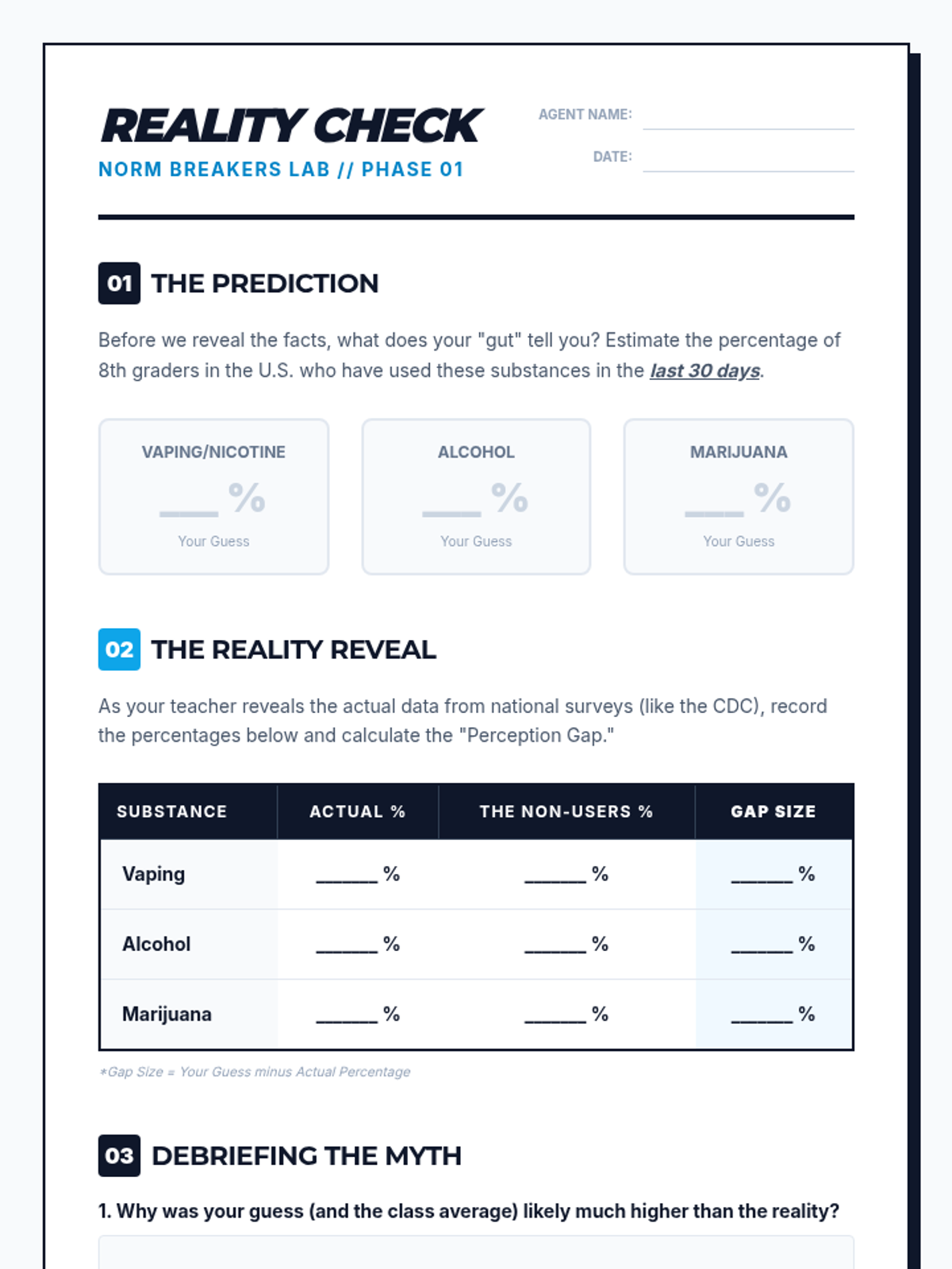 Students compare their perceptions of teen substance use against actual survey data to debunk the 'everyone is doing it' myth. They use data analysis to understand normative beliefs versus reality.