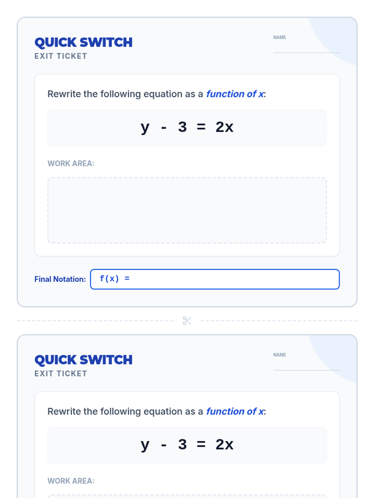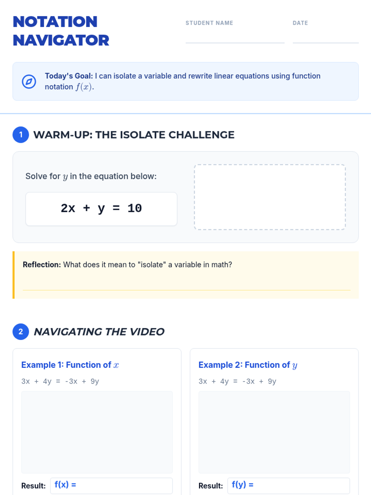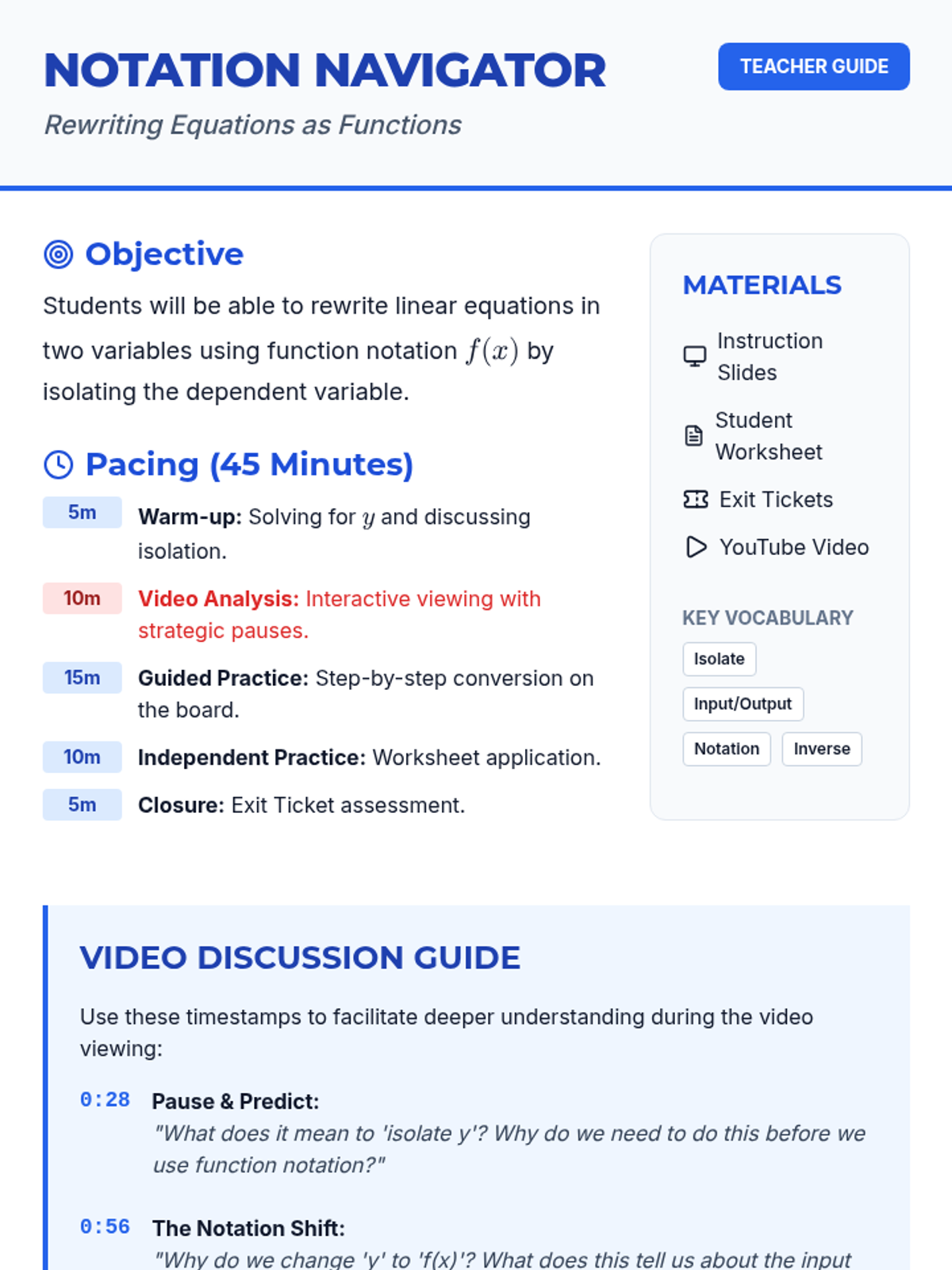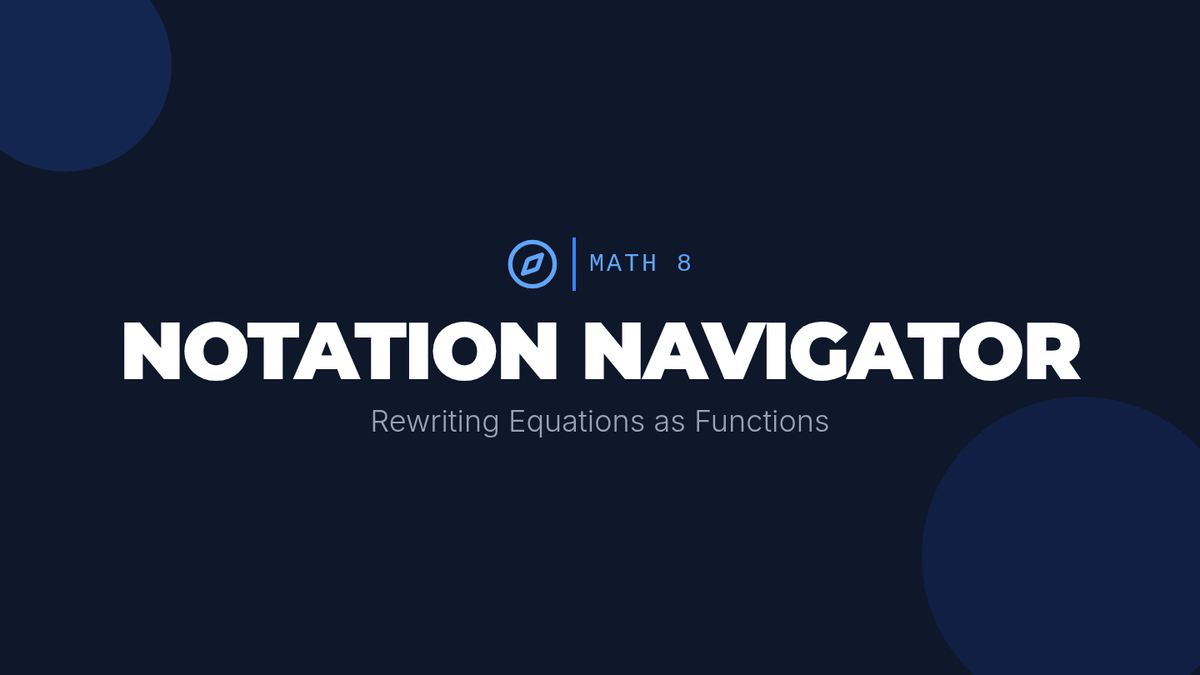 A lesson introducing 8th-grade students to function notation by rewriting linear equations. Students learn to isolate the output variable and transition from y= to f(x)= notation, including practice with non-standard variables.