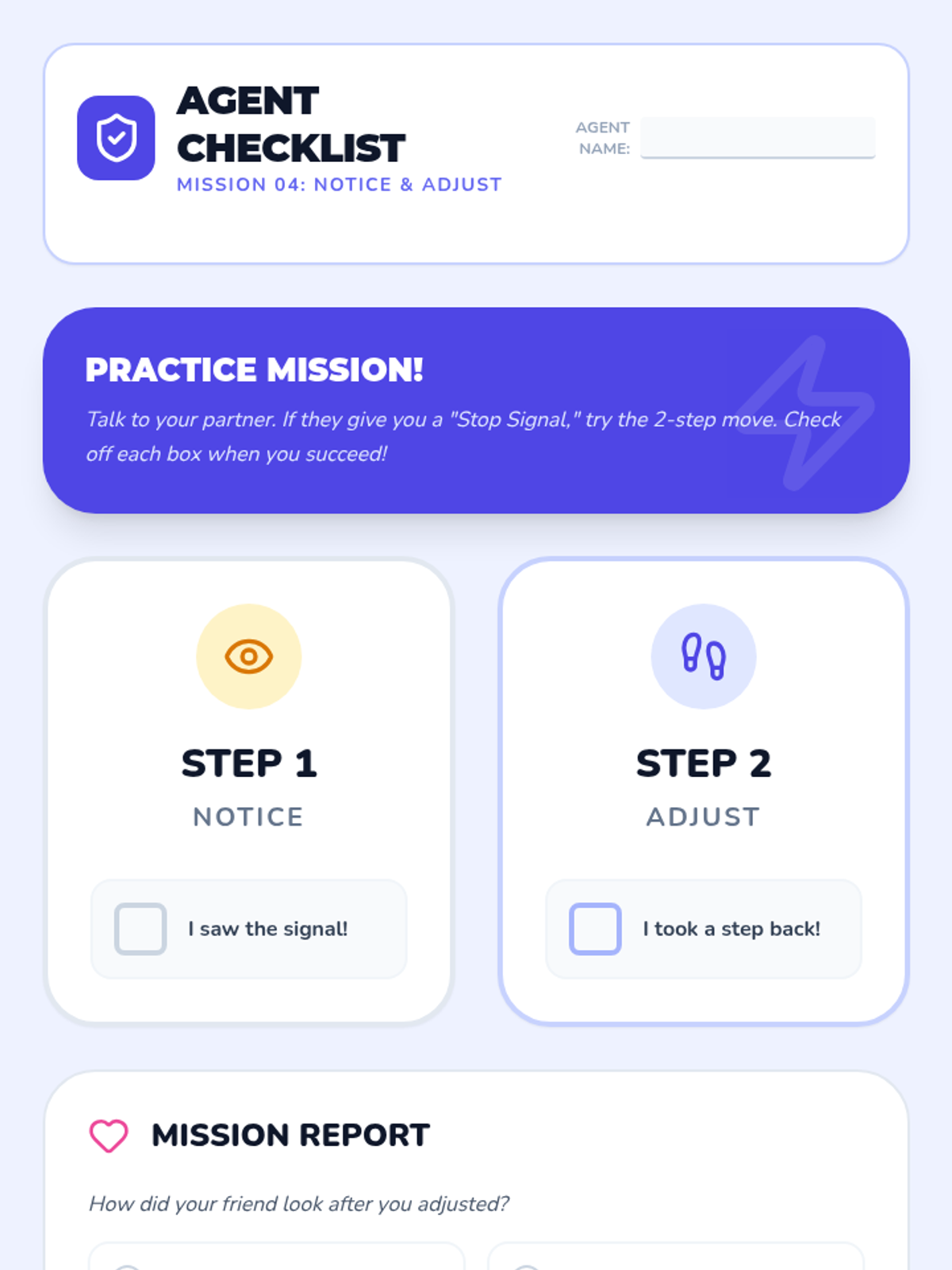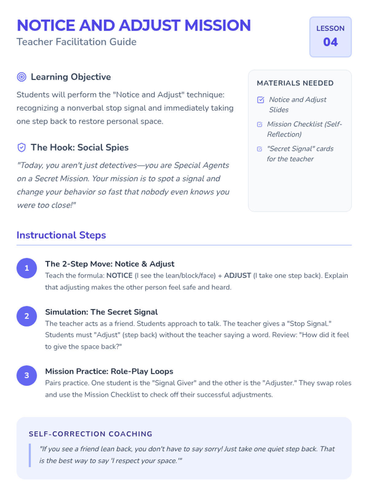 Students practice the 'Notice and Adjust' technique, learning to physically change their behavior immediately upon spotting a discomfort cue.