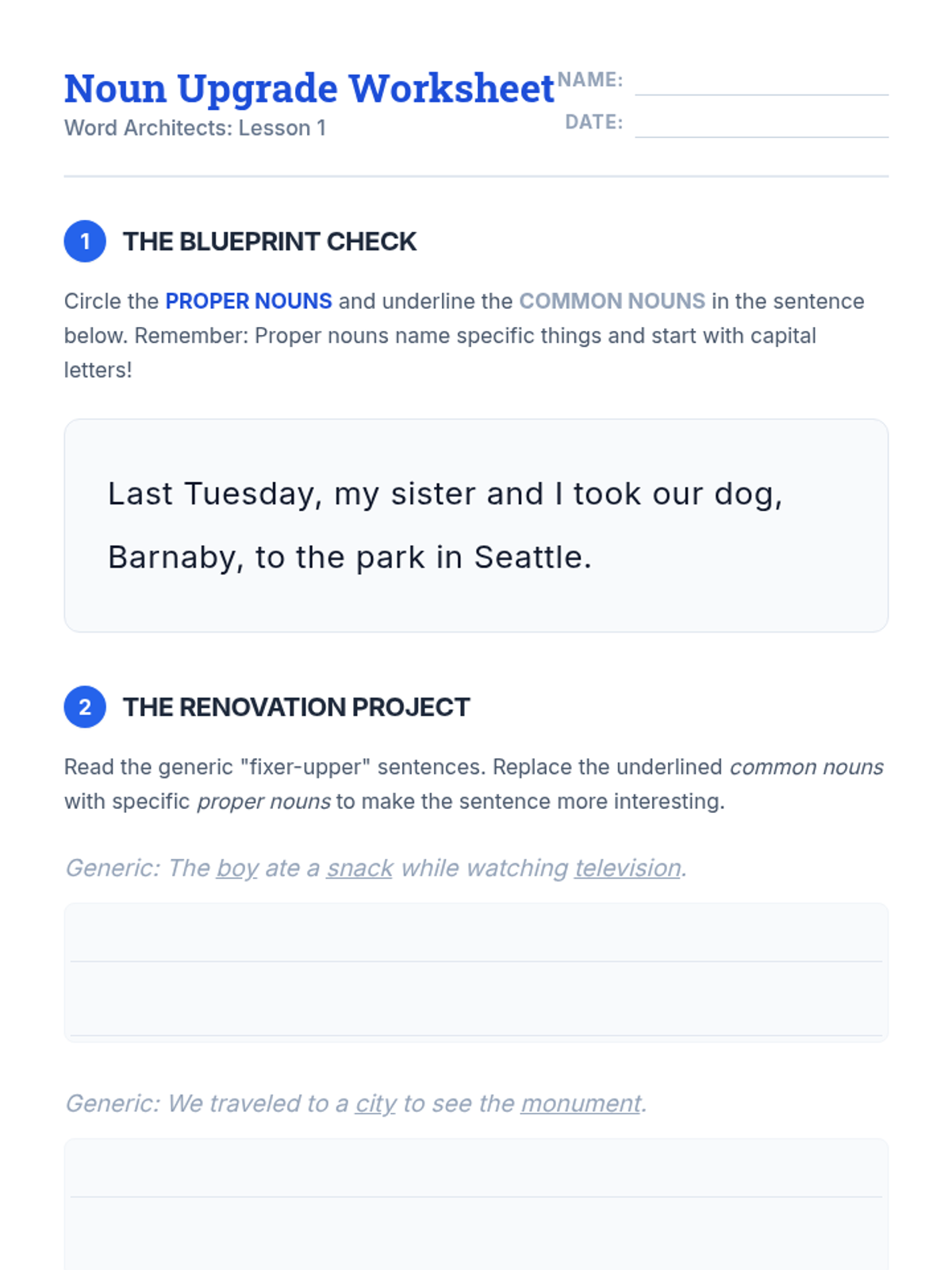 Students differentiate between common and proper nouns to increase specificity in their writing, focusing on capitalization and adding context.