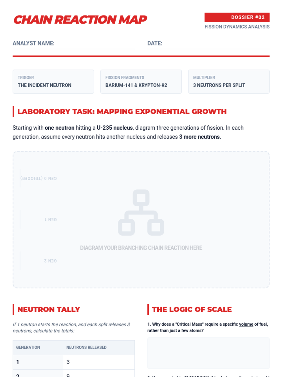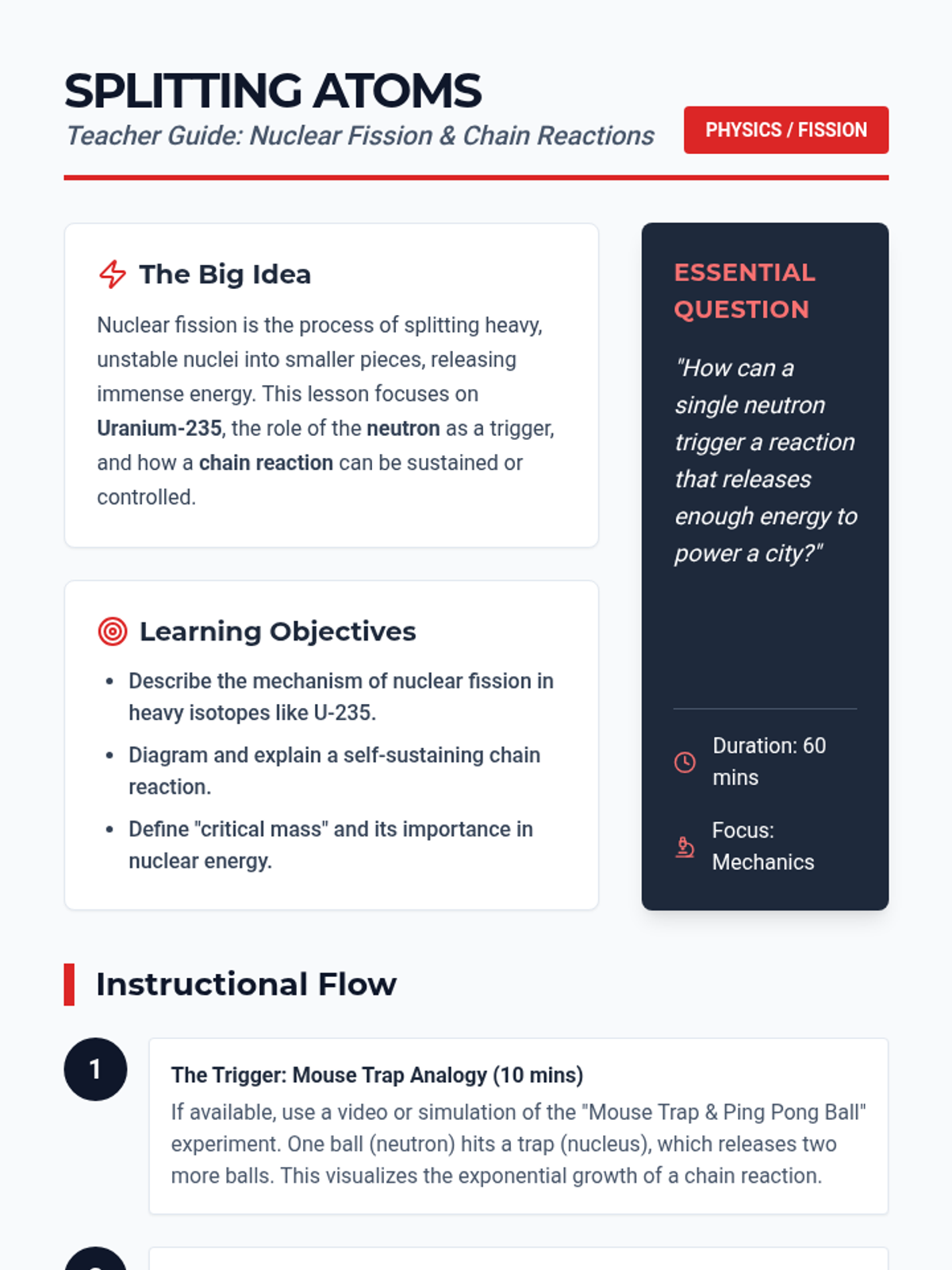 Learners study the process of splitting heavy nuclei, focusing on Uranium-235, chain reactions, and the concept of critical mass.