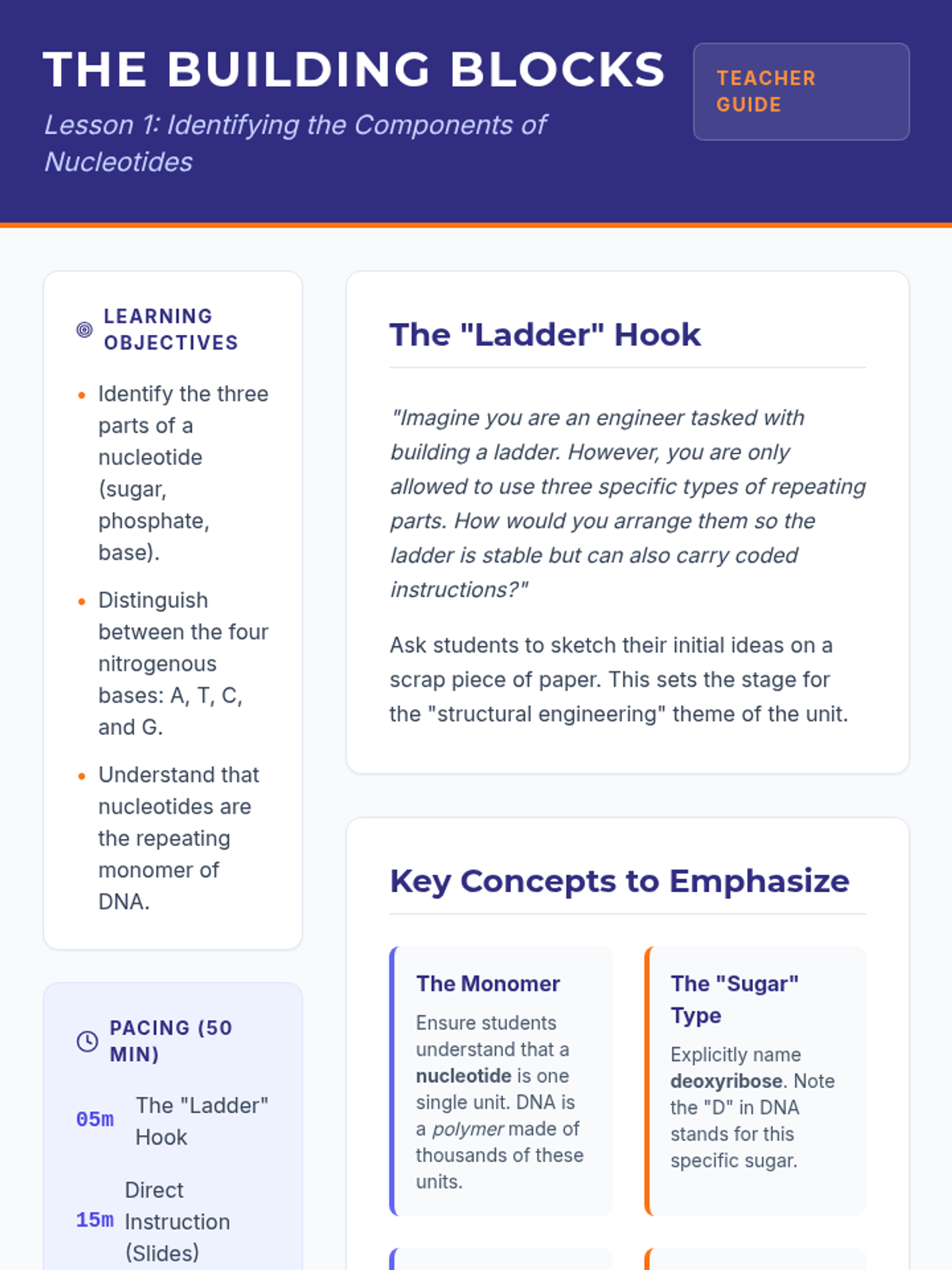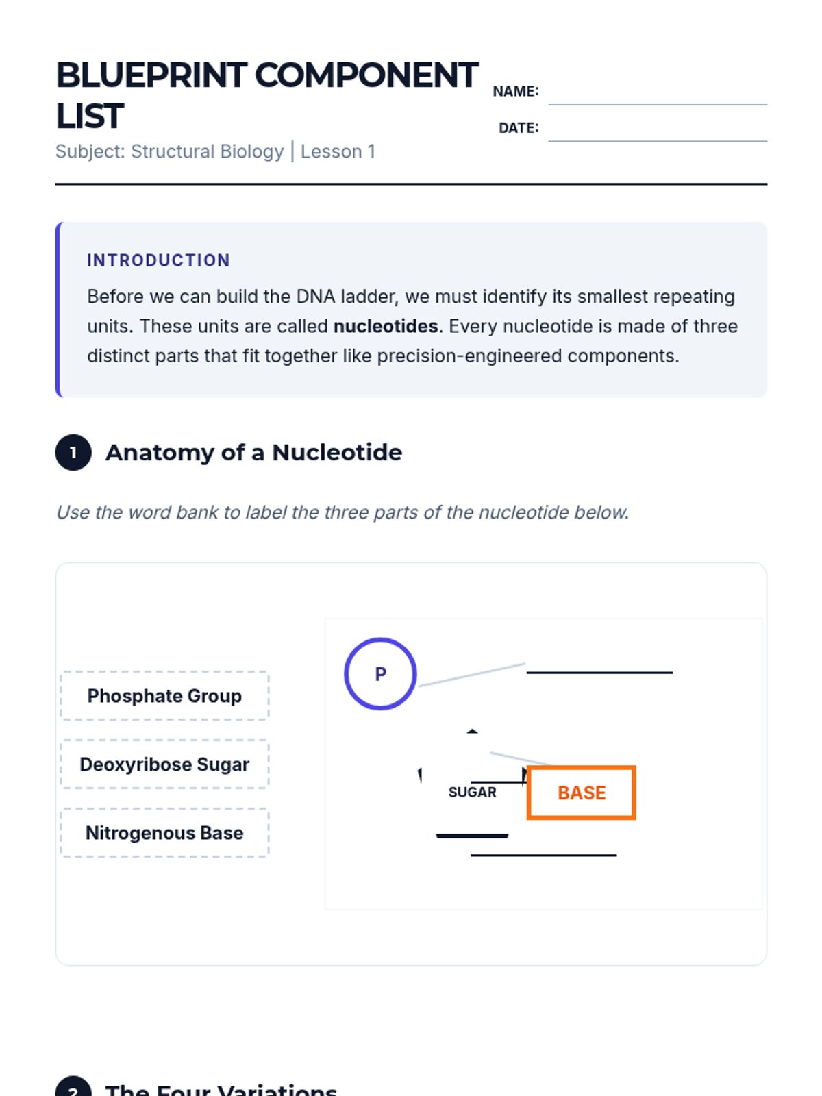 Students examine the three chemical parts of a nucleotide: deoxyribose sugar, phosphate group, and nitrogenous base, and identify the four specific nitrogenous bases.