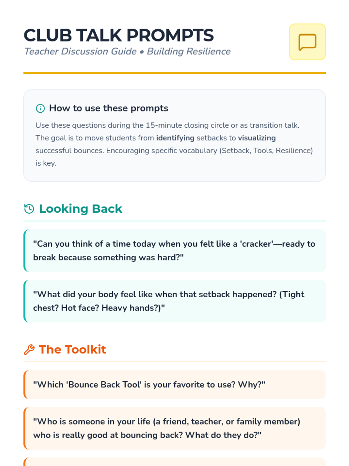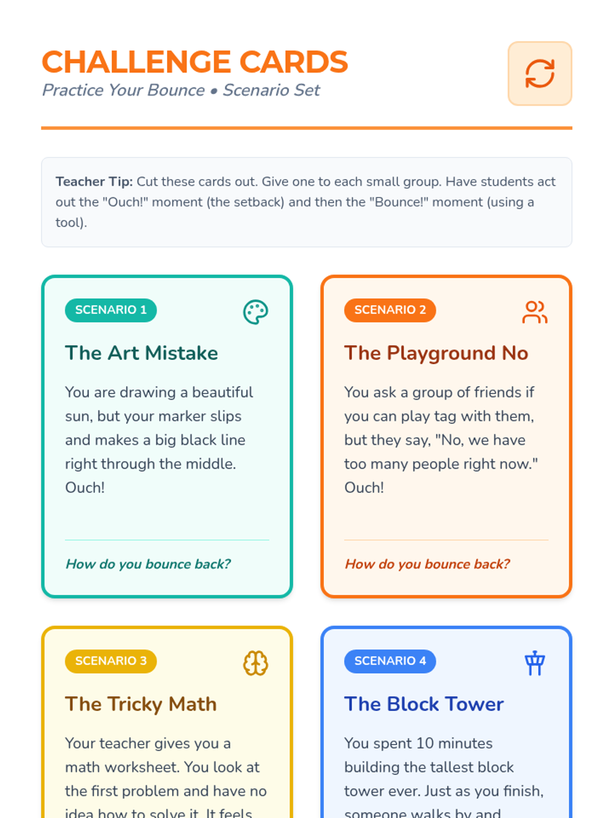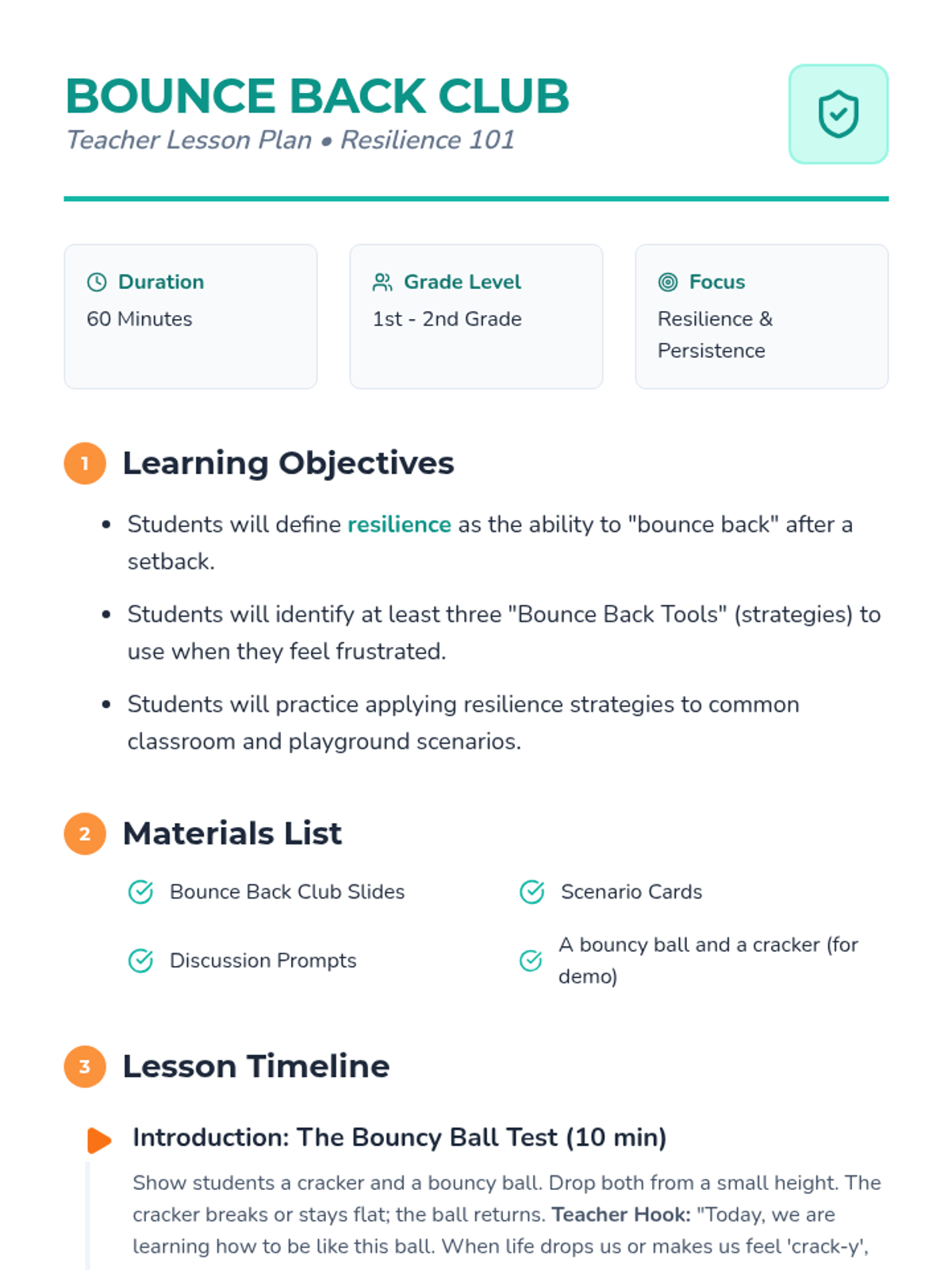 An interactive 1-hour lesson for 1st-2nd graders focusing on the concept of resilience through the metaphor of a 'Bounce Back Club'. Students learn to identify challenges and use positive strategies to recover from setbacks.