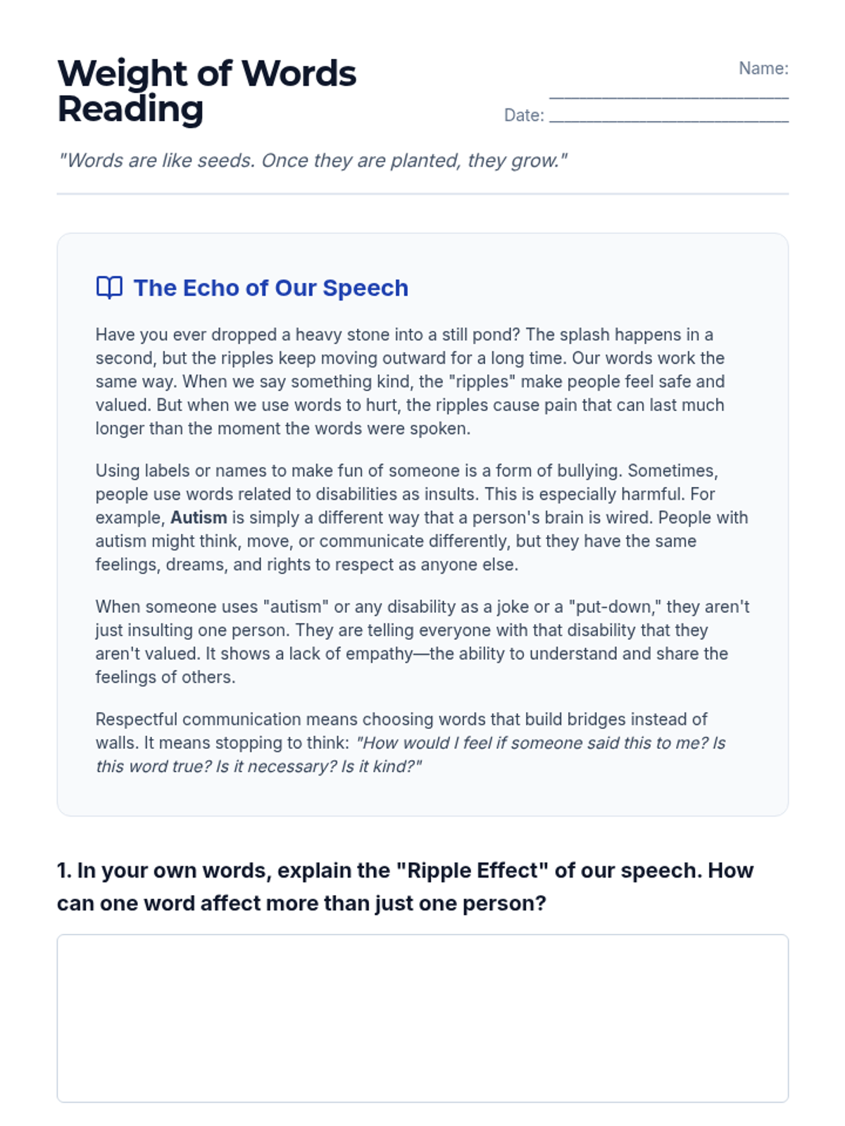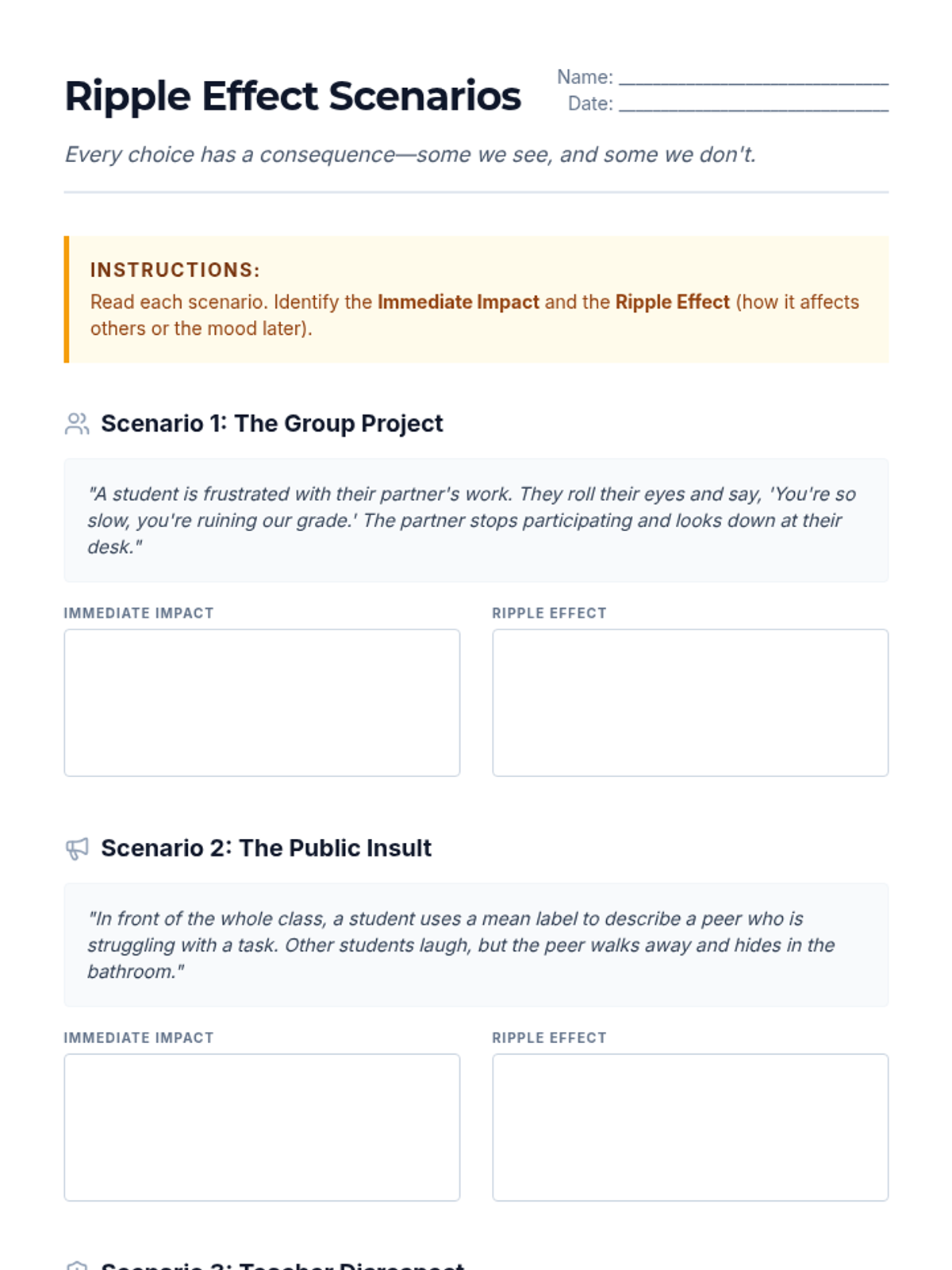 A punchy 10-minute whole-group lesson focused on developing perspective-taking, kindness, and respectful communication in 3rd-grade students using the metaphor of a ripple effect to teach consideration.