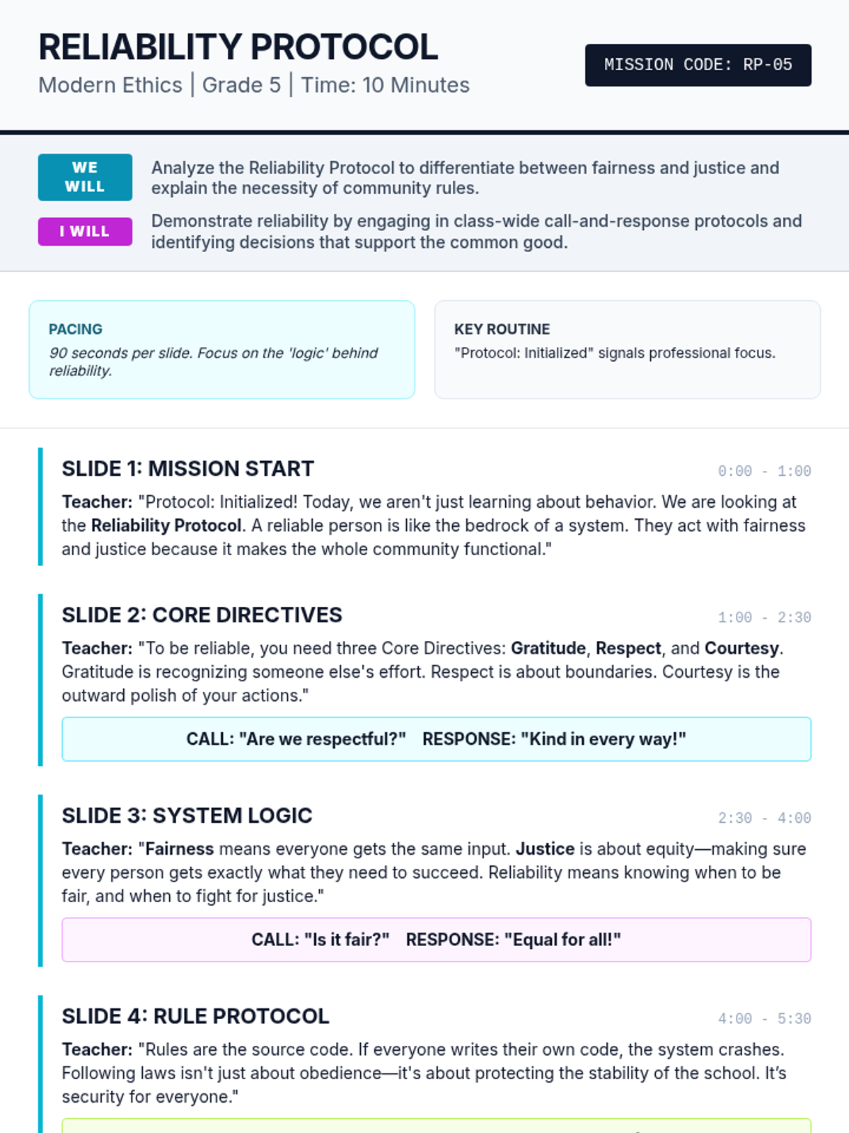 A fast-paced, high-energy 10-minute lesson focused on identifying the 'common good' and practicing the courage needed to make responsible decisions for the classroom and community. Students explore real-world scenarios and use a 'Common Good Compass' to guide their choices.