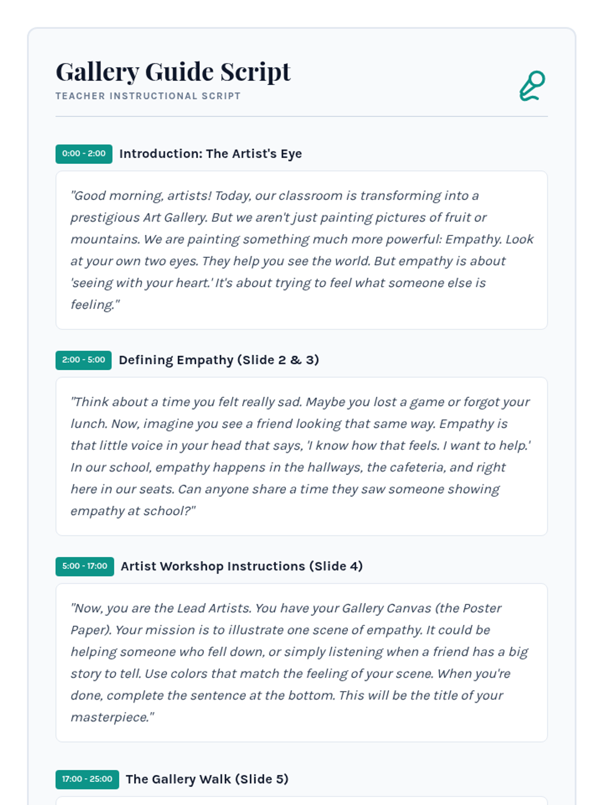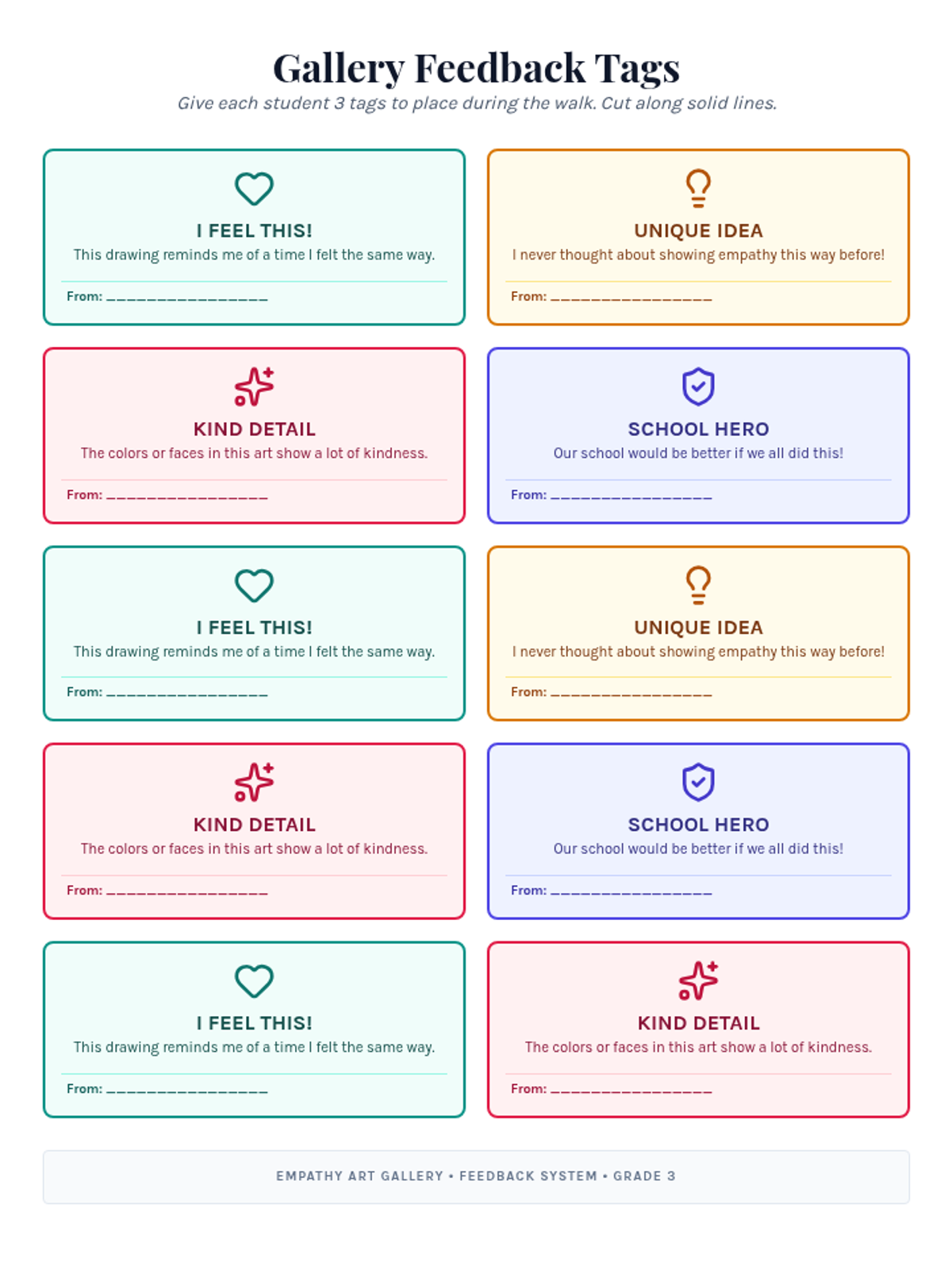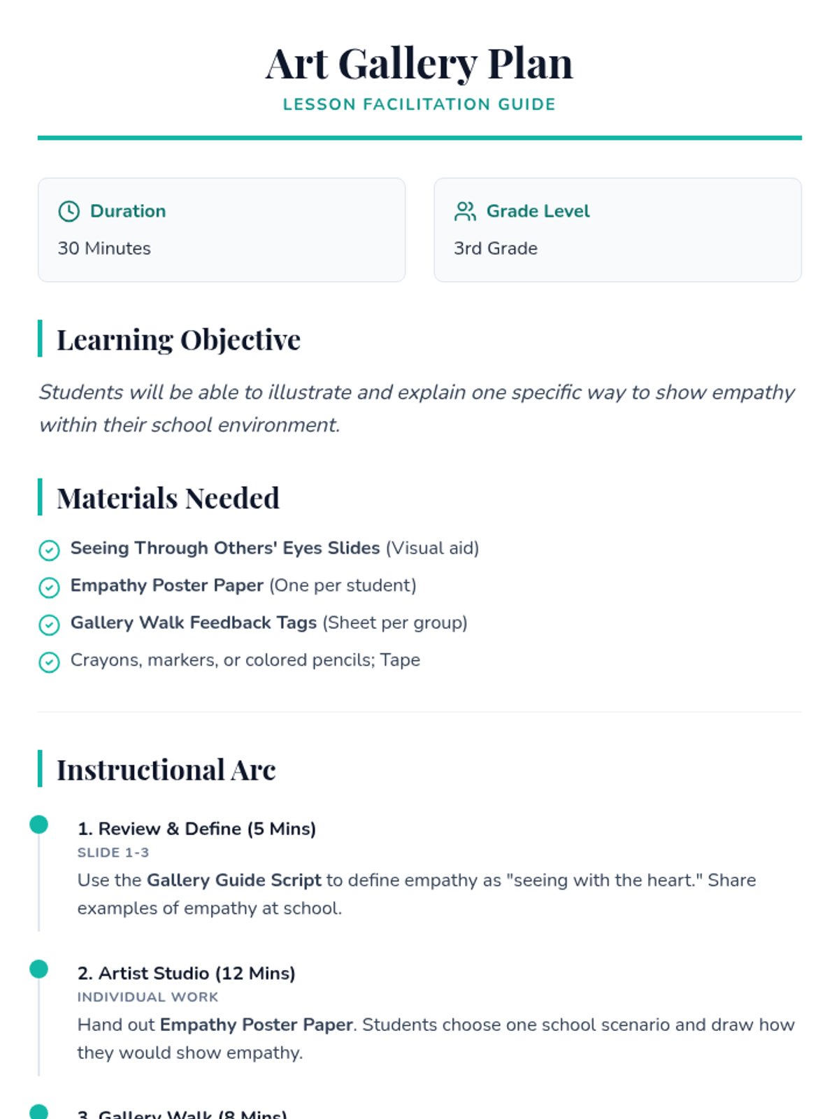 A 30-minute social-emotional learning lesson where students create and display art representing empathy in their school community. Students will define empathy, create visual representations of kind actions, and participate in a reflective gallery walk.