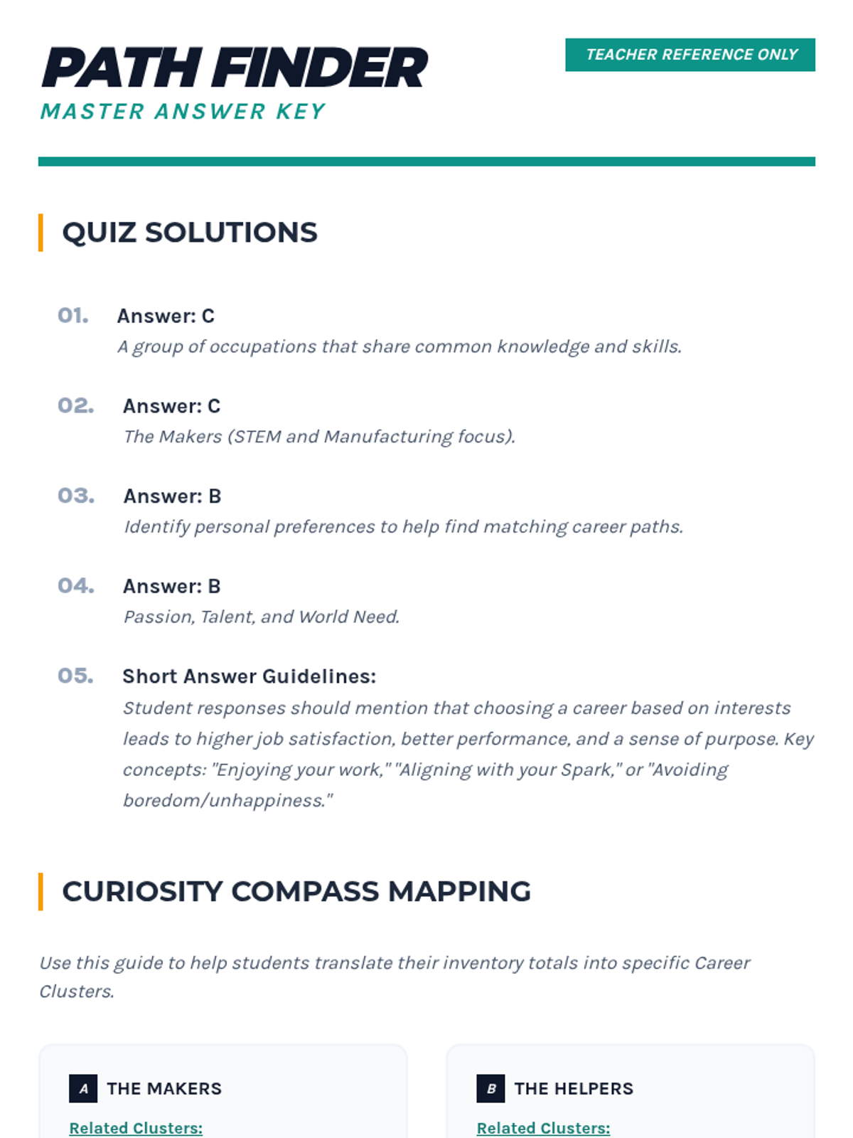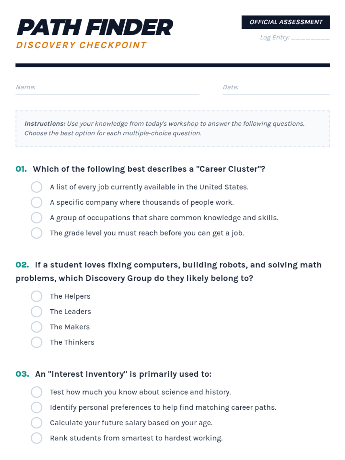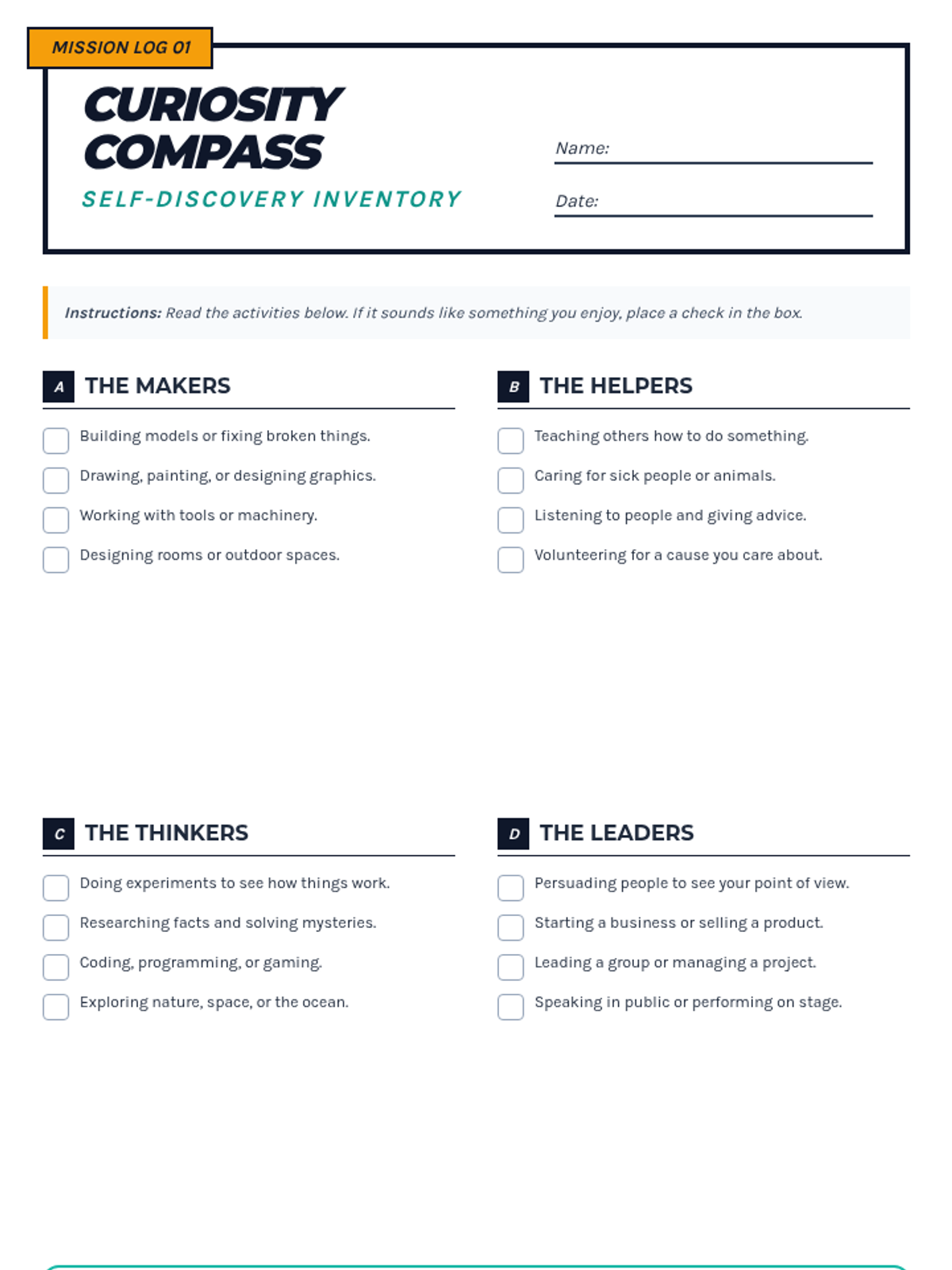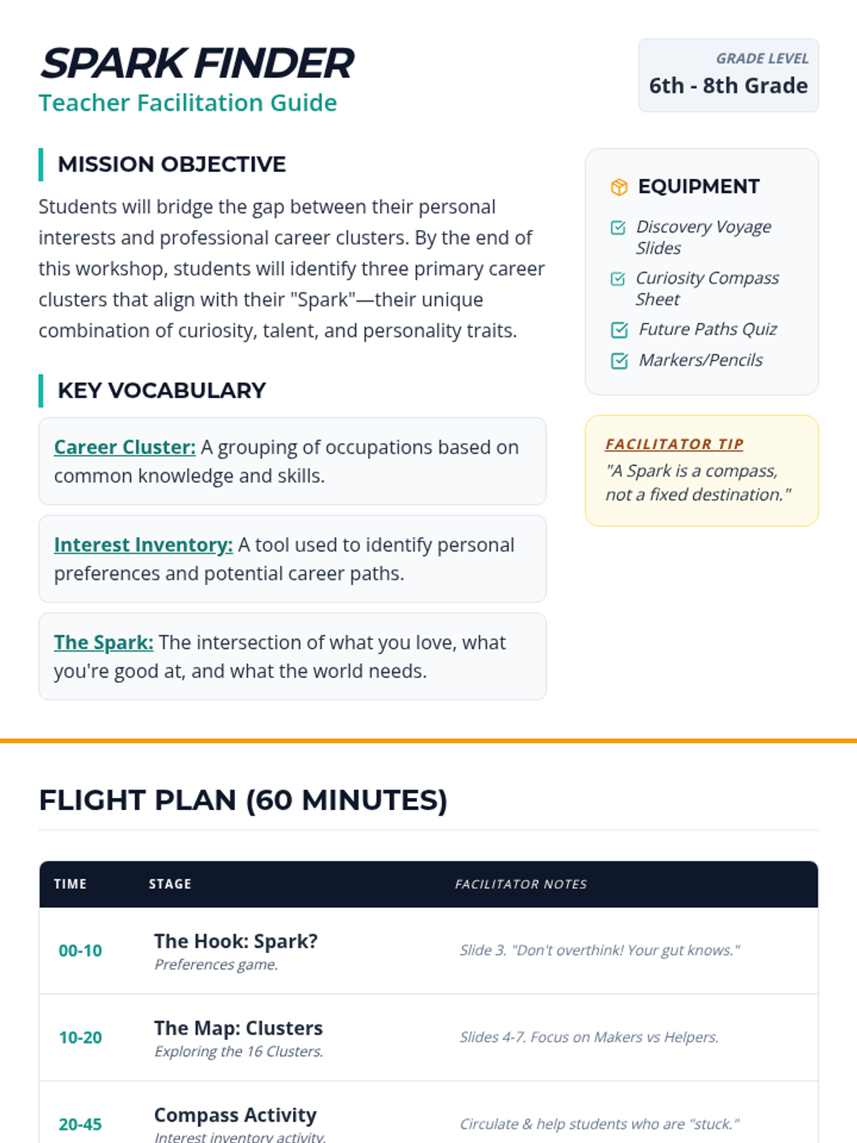 A career exploration workshop for middle schoolers to map natural curiosities to professional clusters using interest inventories. Students explore personality traits and vocational paths to foster hope and purpose.