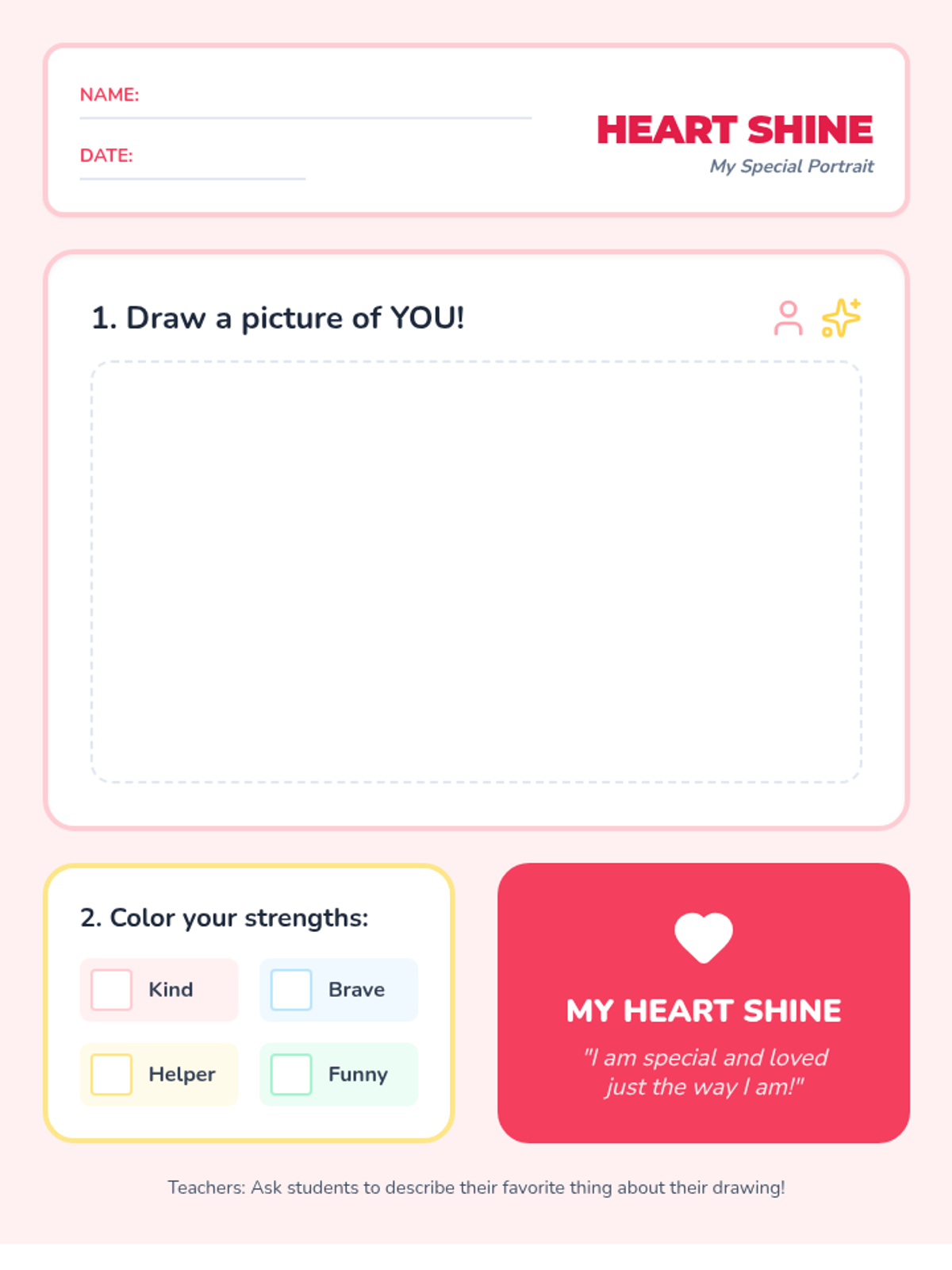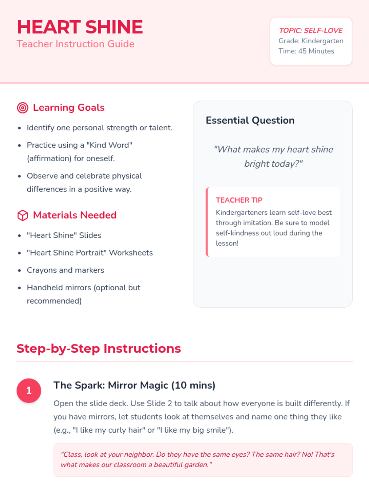 A kindergarten lesson focused on building self-esteem through identifying personal strengths, practicing self-affirmations, and celebrating physical uniqueness.
