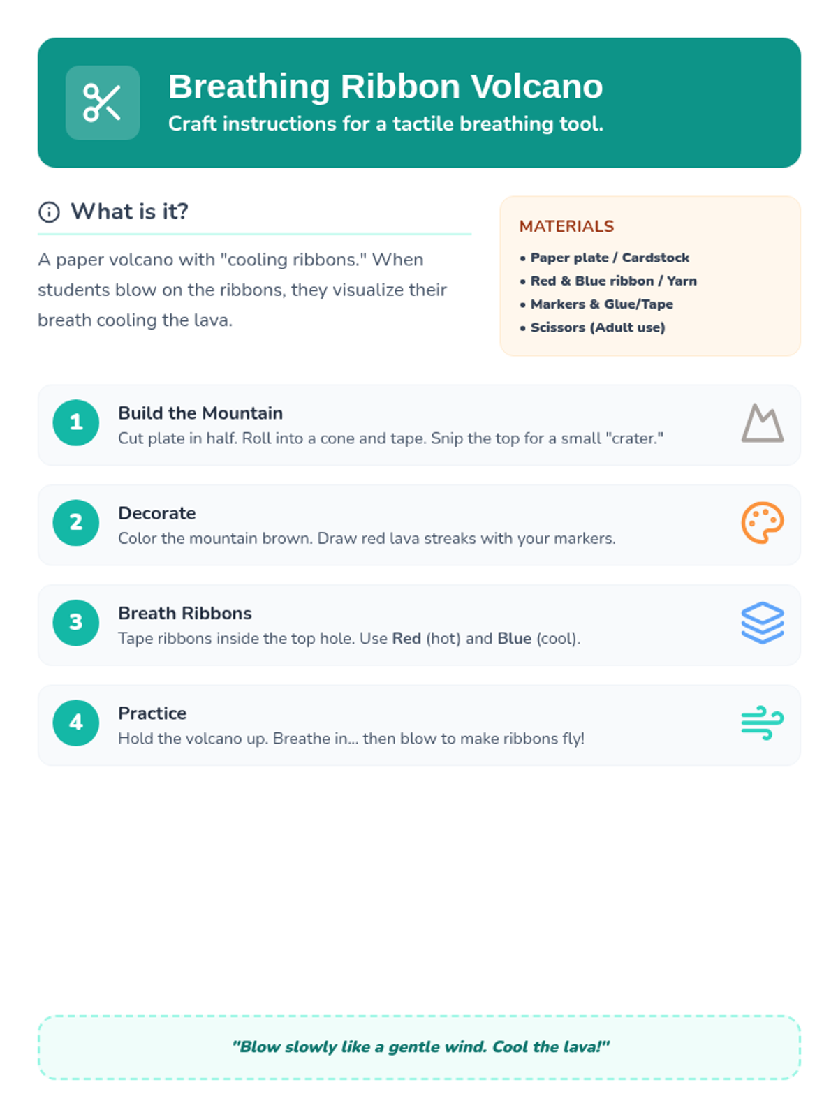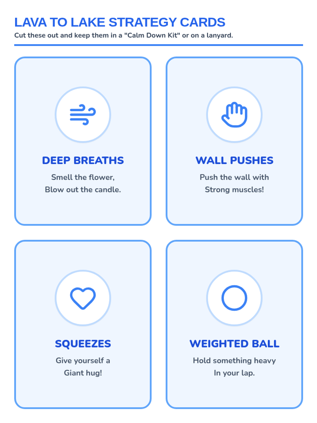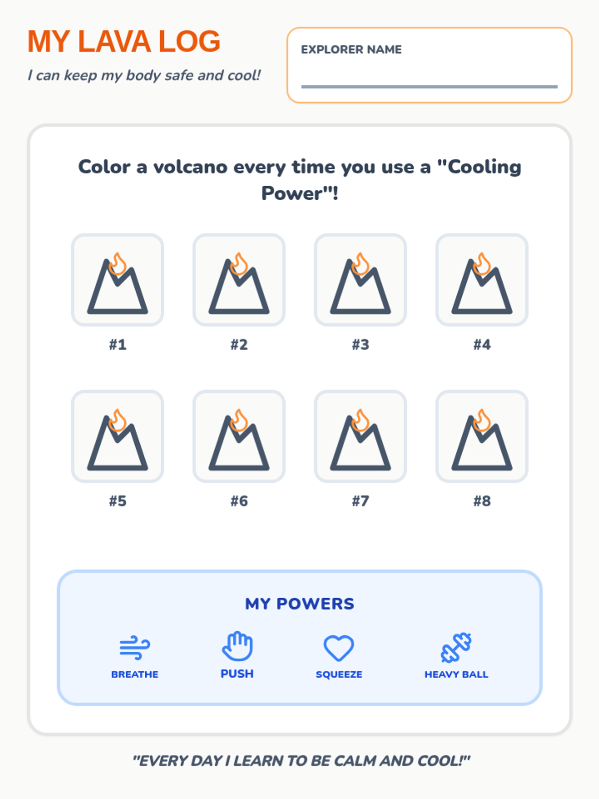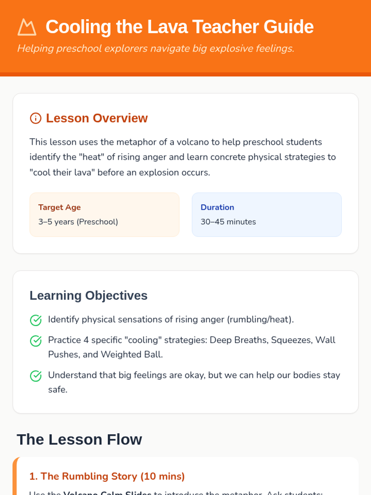 A comprehensive social-emotional lesson for preschool students using a volcano metaphor to teach self-regulation strategies like deep breathing, weighted balls, and wall pushes.