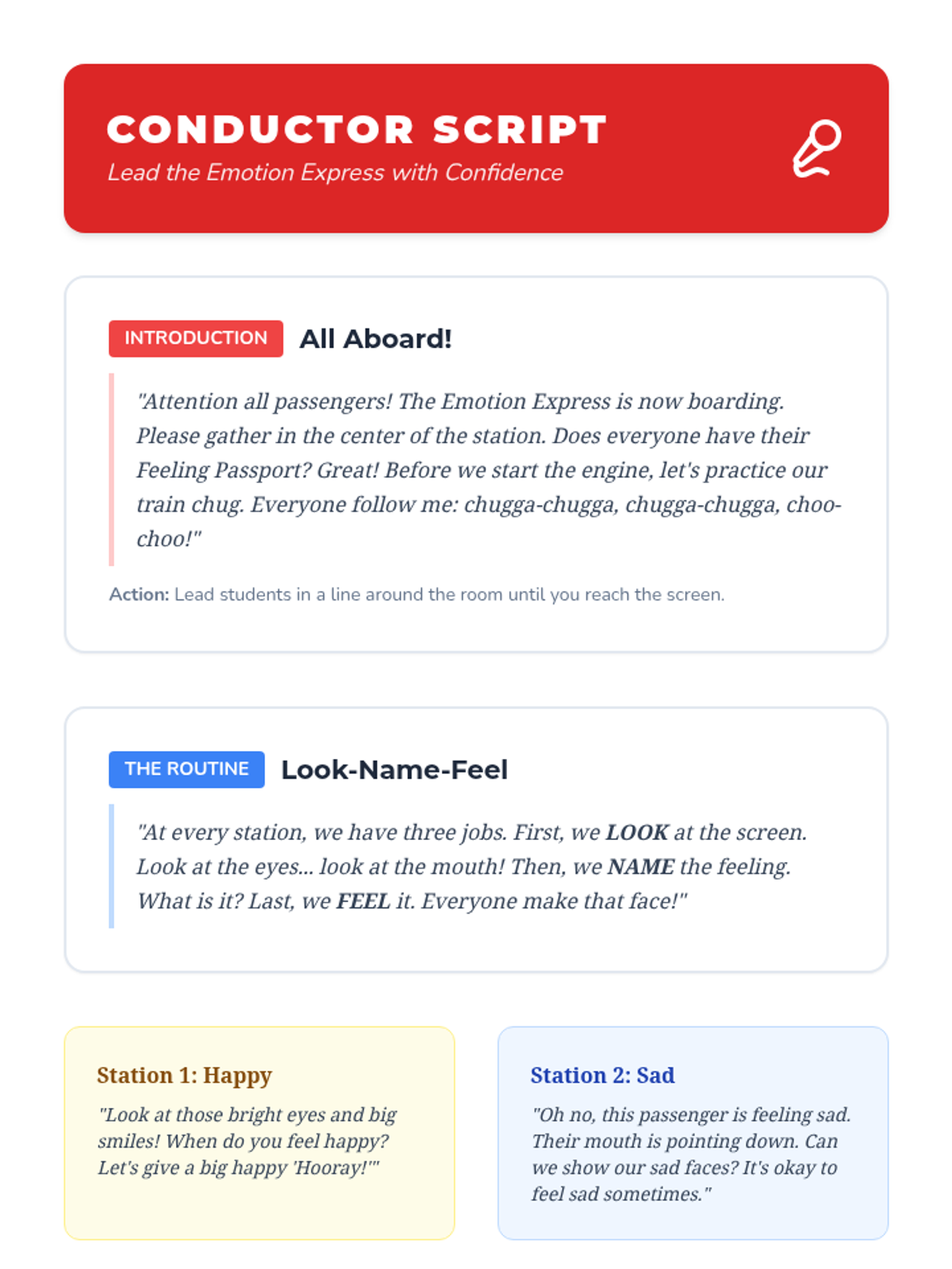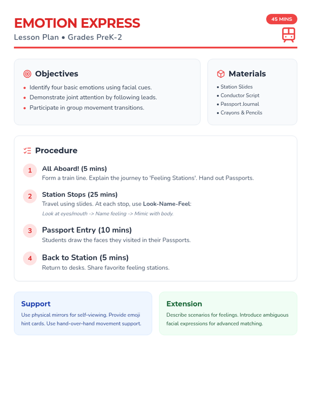 A movement-based social-emotional learning lesson where students board a virtual train to explore facial expressions and social cues at different 'Feeling Stations'.