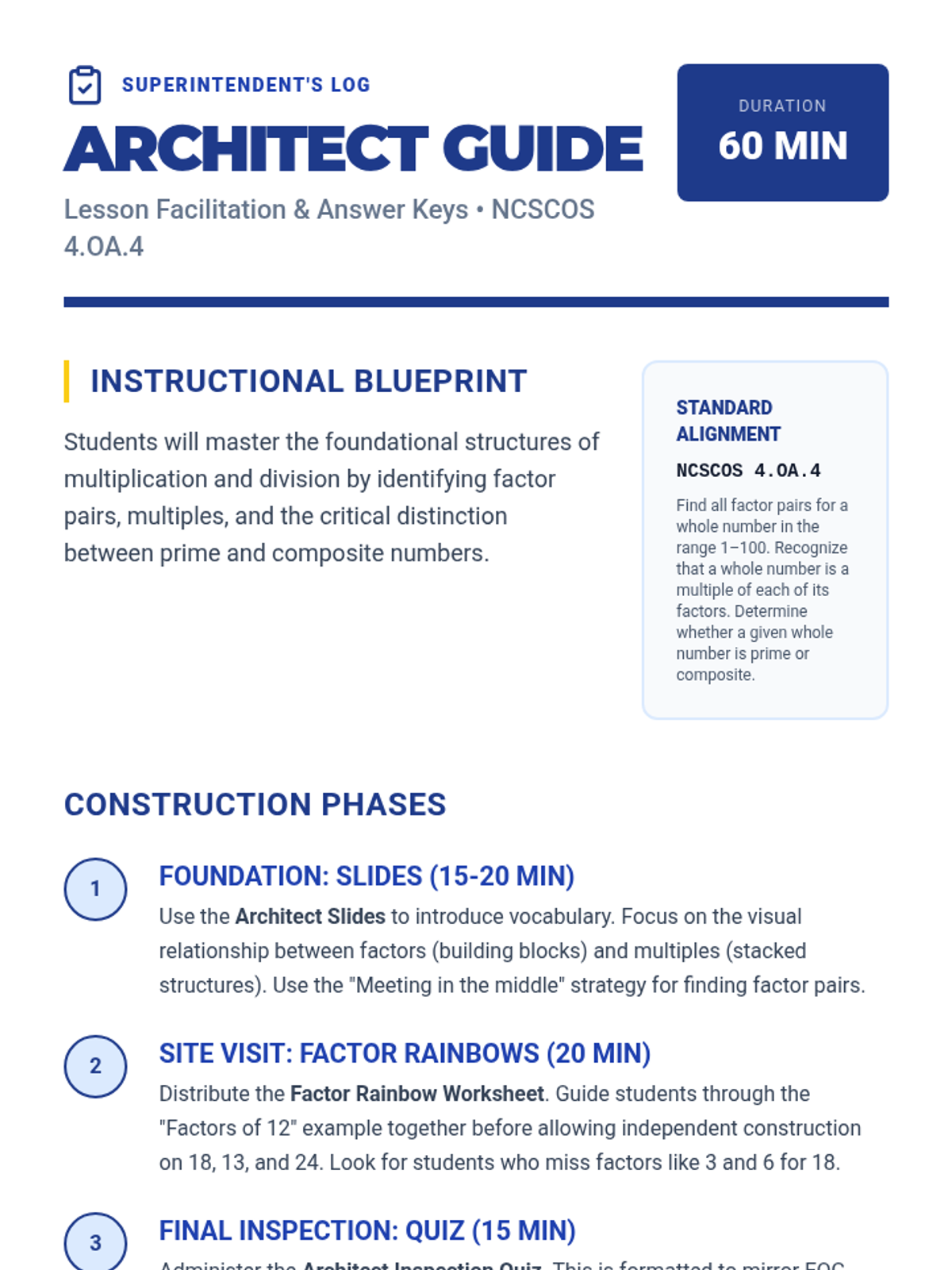 A comprehensive exploration of factors, multiples, prime, and composite numbers. Students use visual tools like factor rainbows and the Sieve of Eratosthenes to build a deep understanding of number relationships, aligned to NCSCOS 4.OA.4.