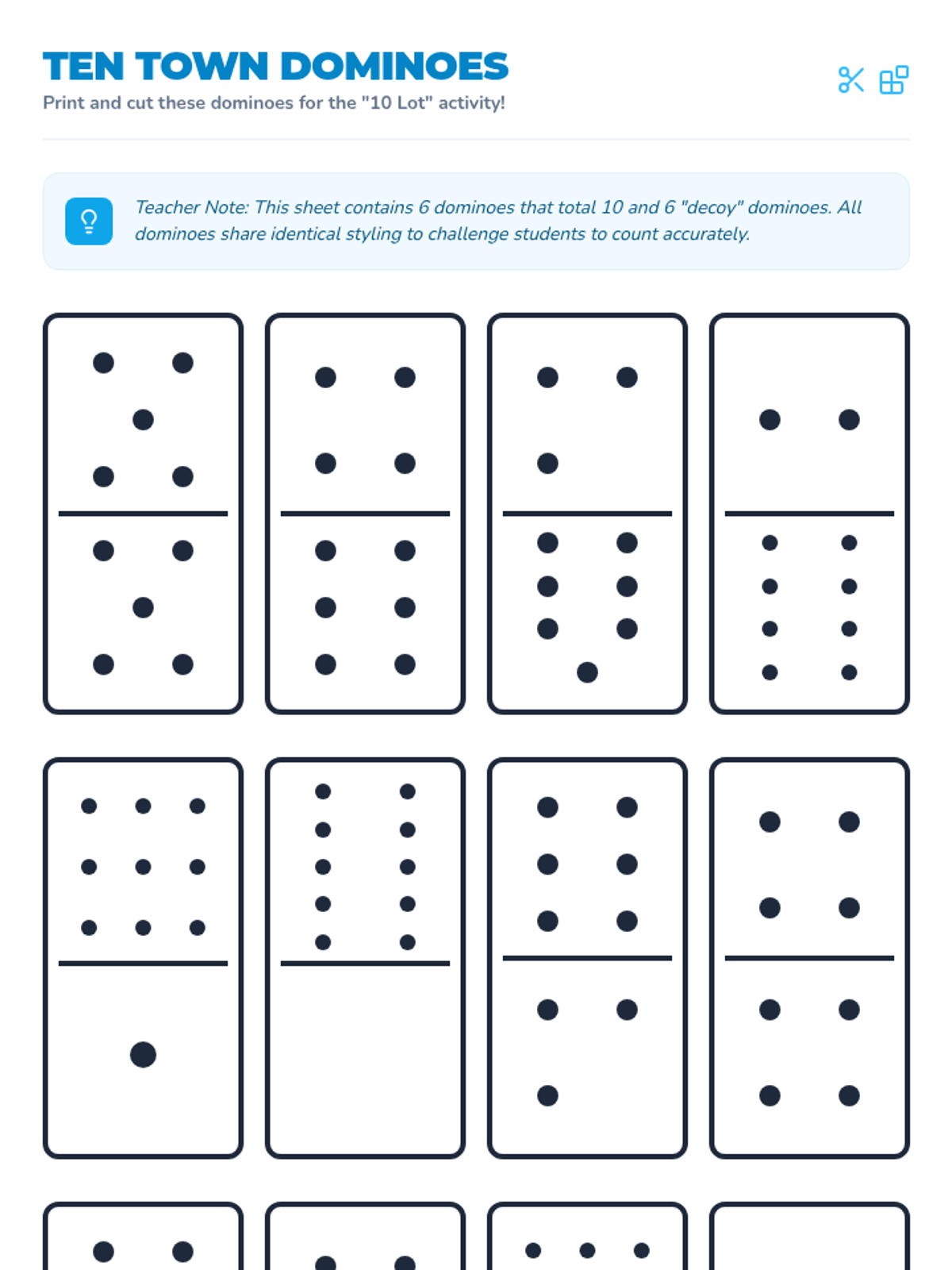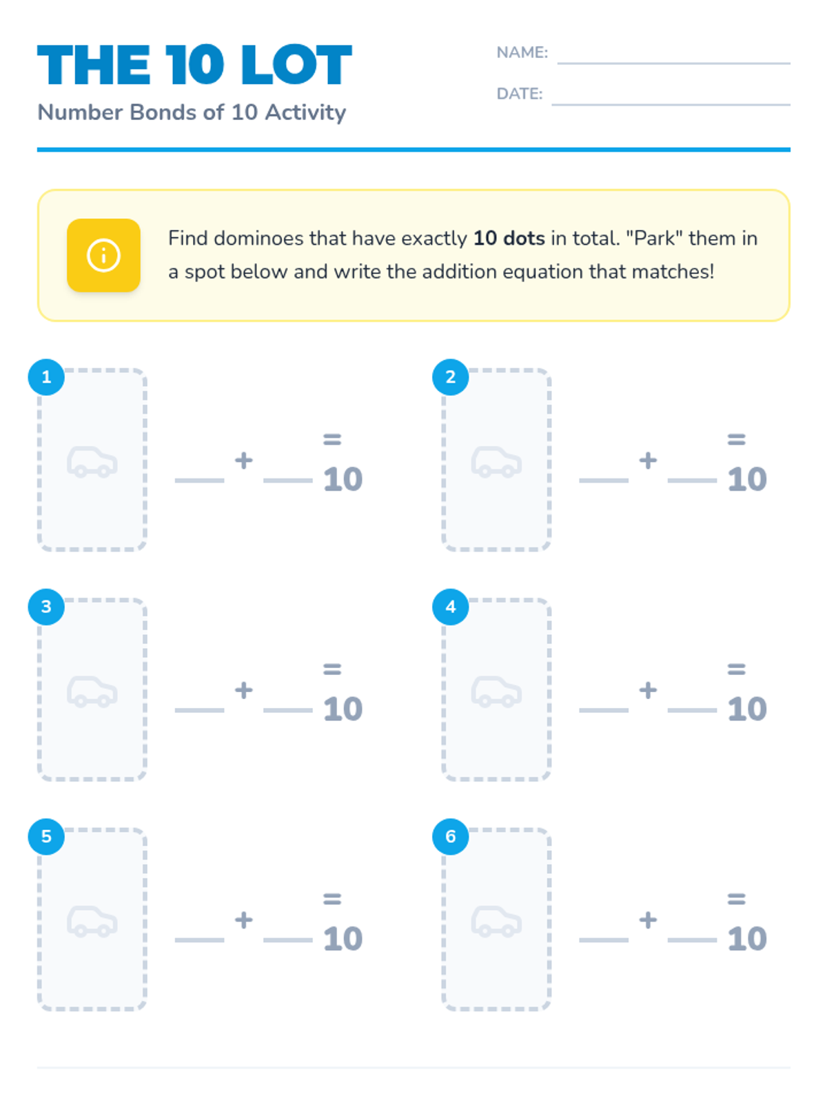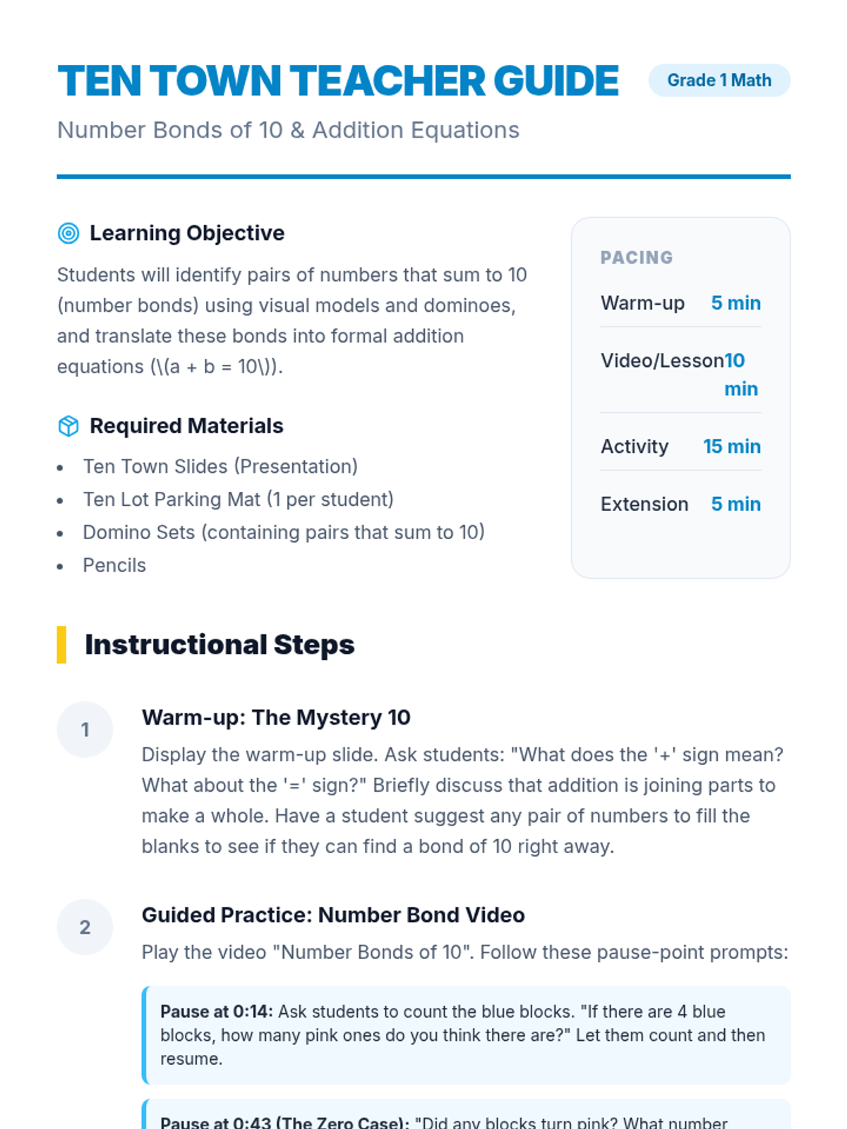 A hands-on 1st Grade math lesson where students explore number bonds of 10 using visual models, a video, and a 'Domino Parking Lot' activity to practice writing addition equations.