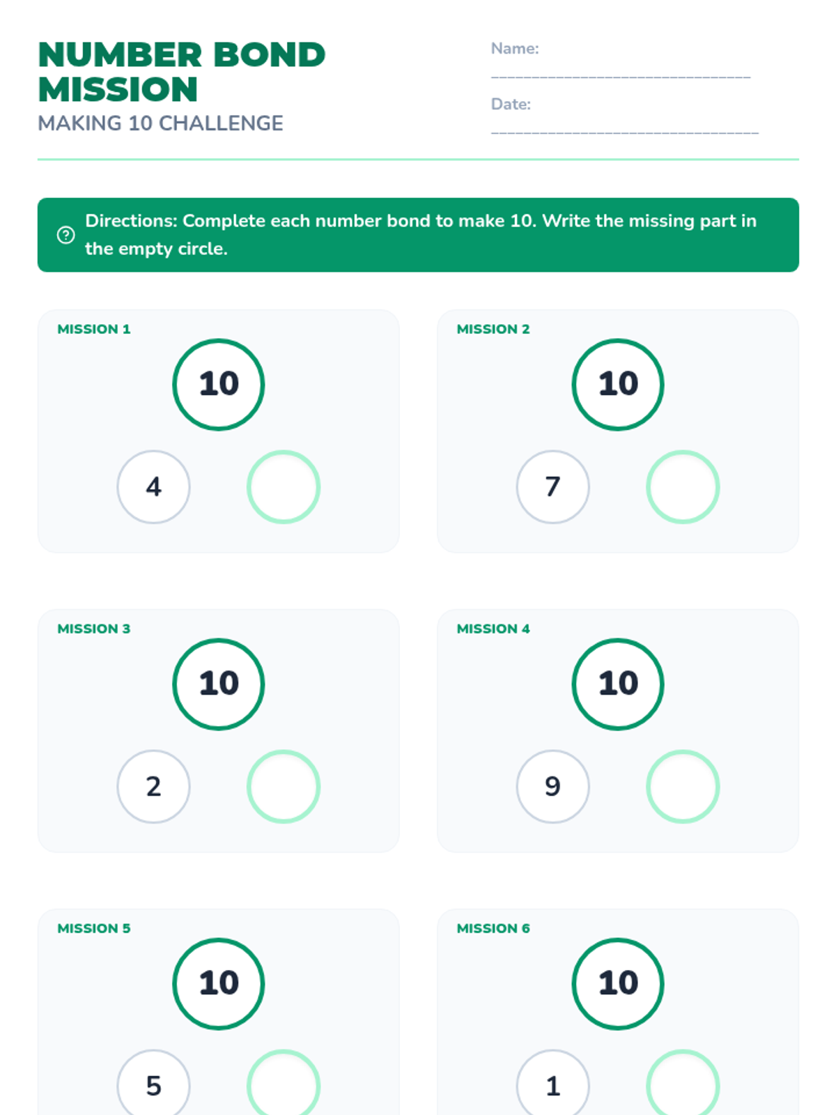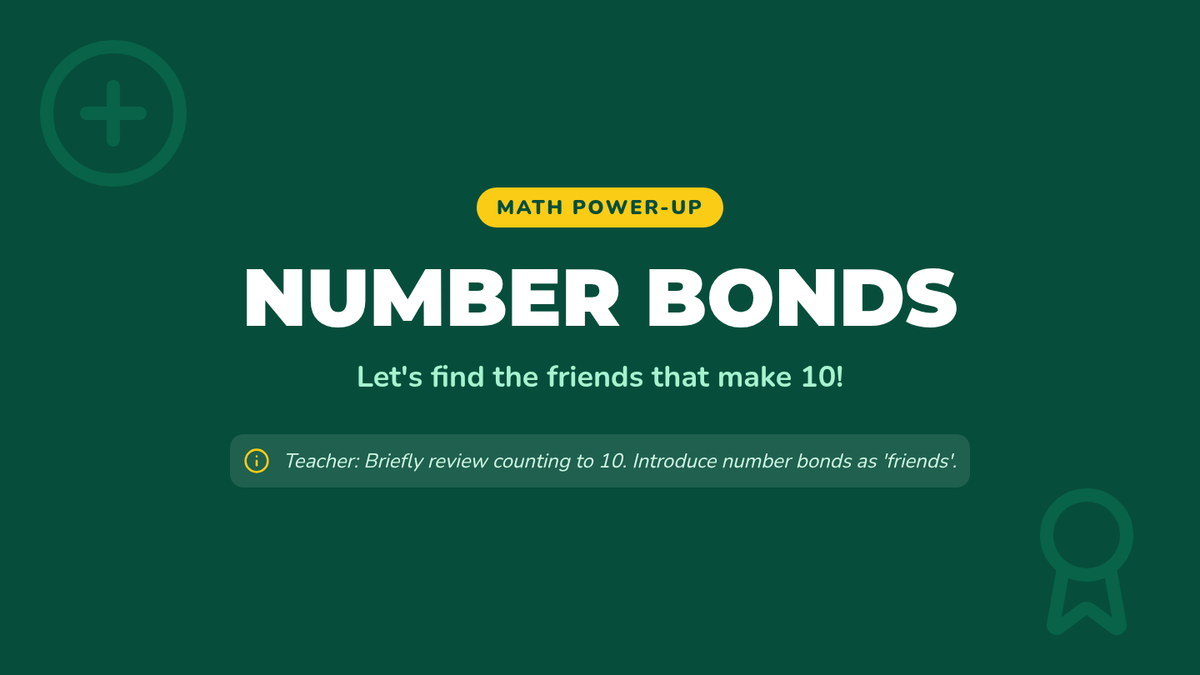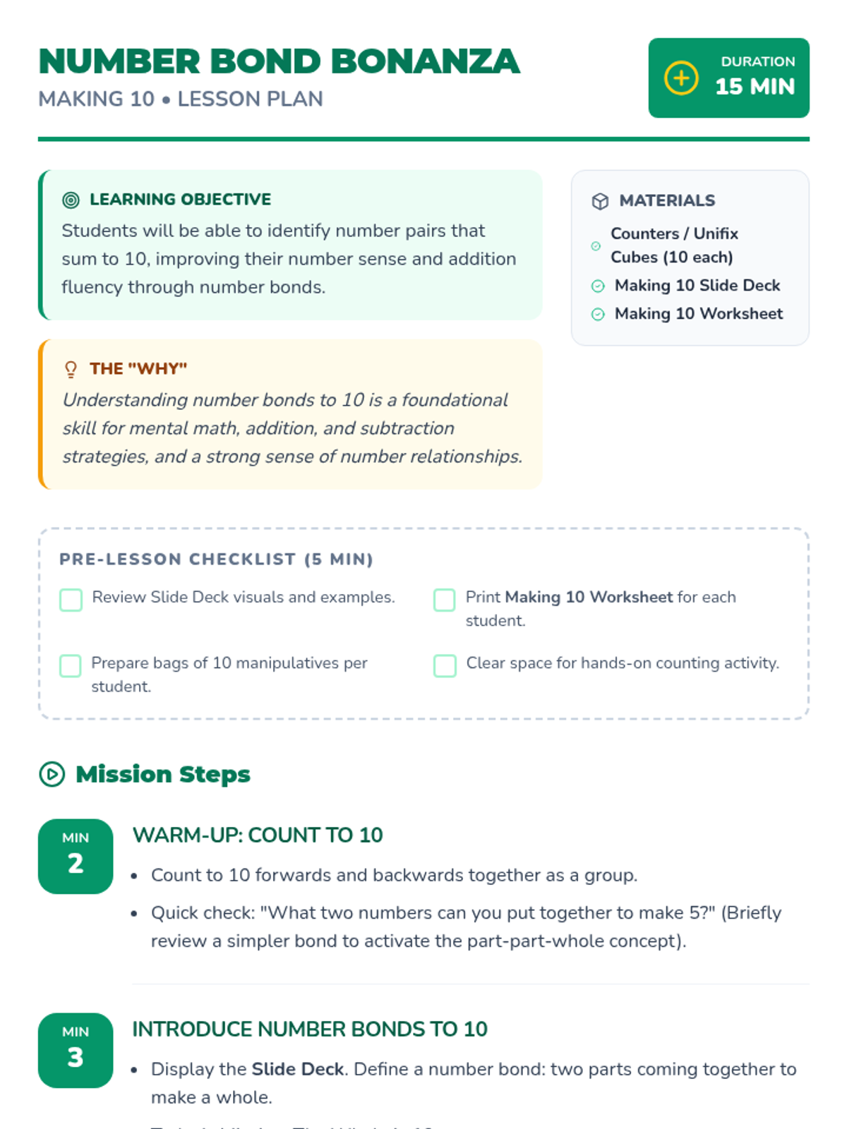 A 15-minute targeted intervention focusing on identifying number pairs that sum to 10 using number bonds and manipulatives.