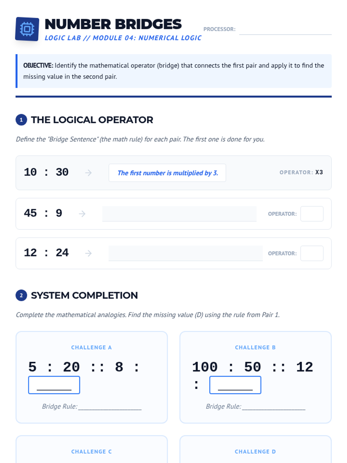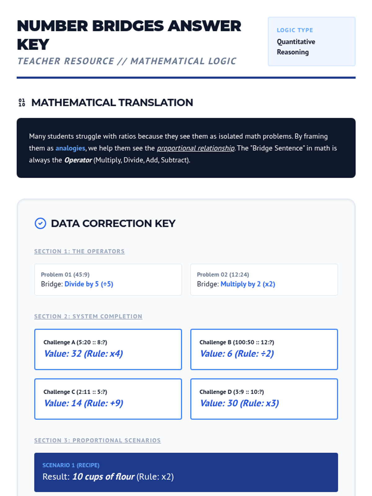 Students explore the relationship between numerical ratios and verbal analogies, finding mathematical rules that act as bridge sentences.