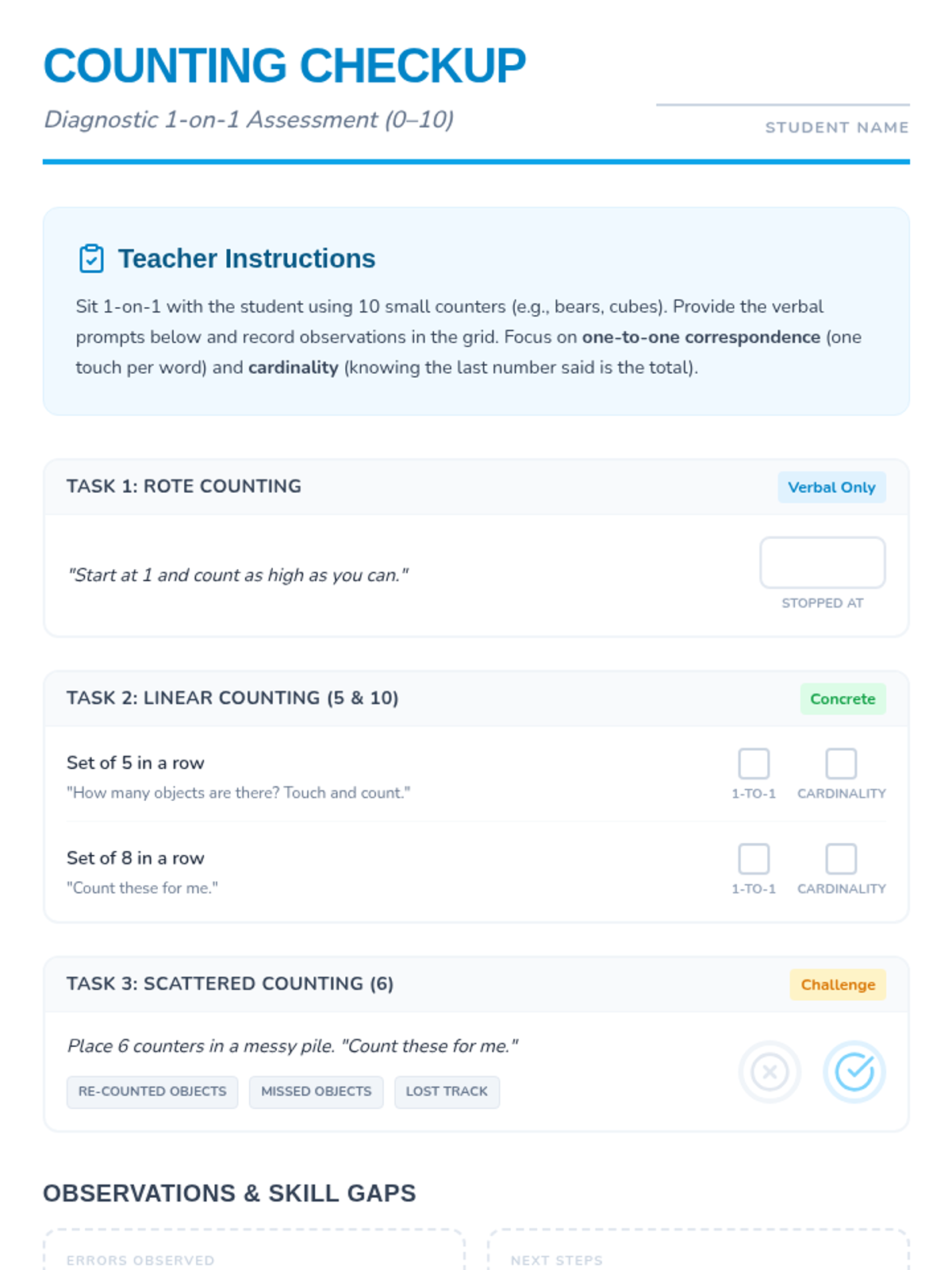 The final lesson in the sequence focusing on matching sets to numerals and a post-intervention assessment to measure student growth in counting mastery.