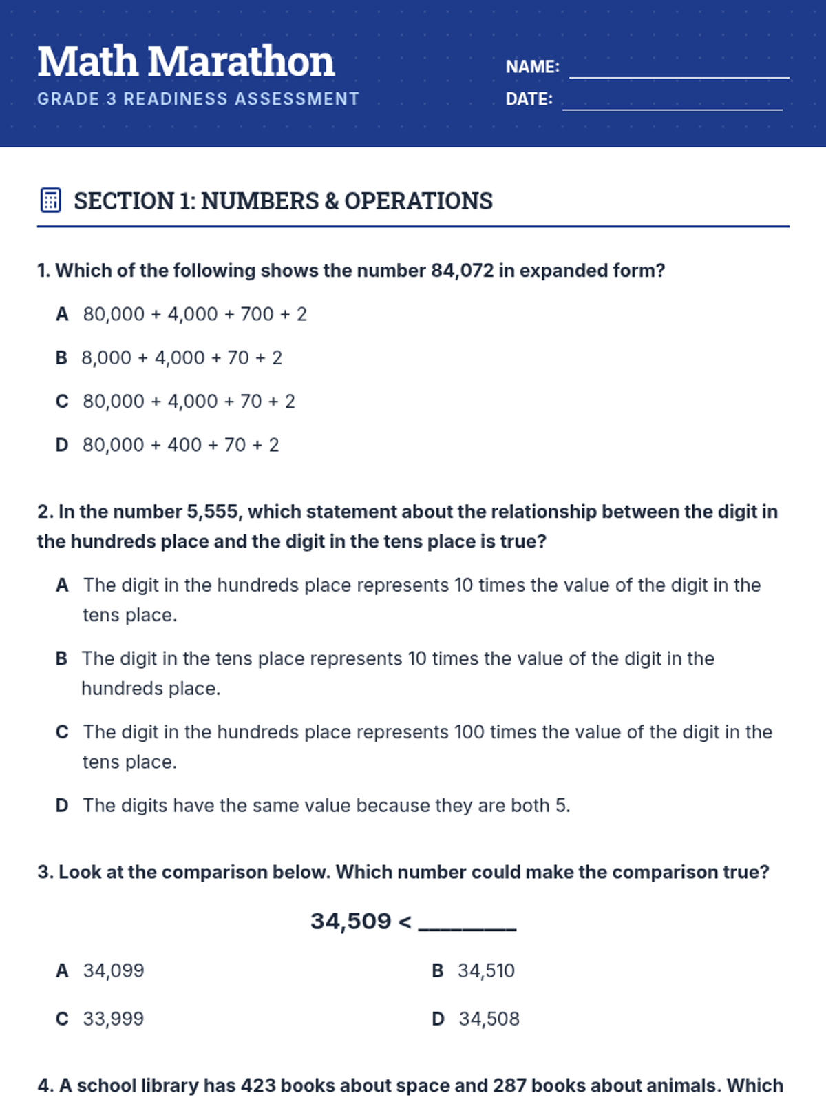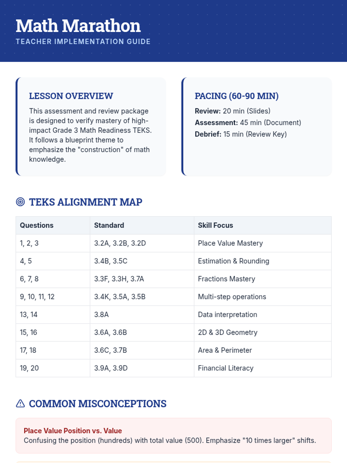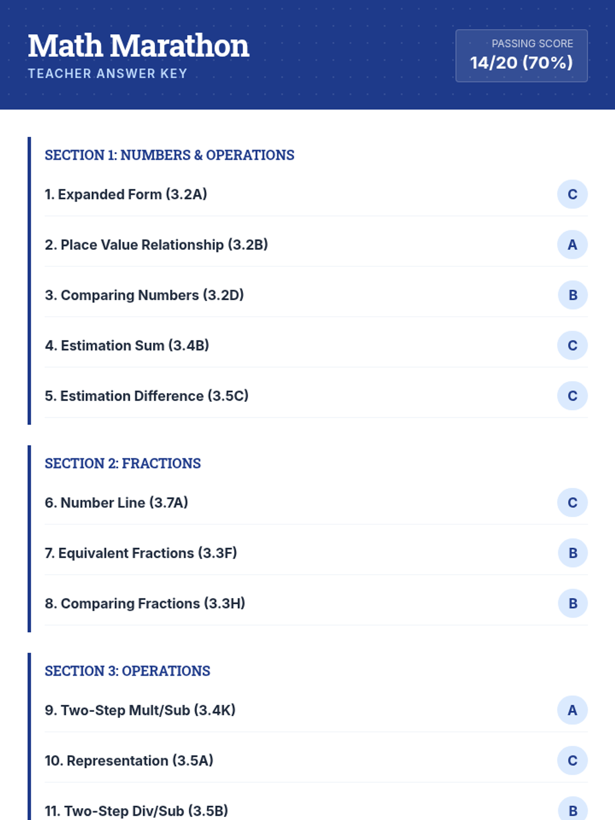 A comprehensive 20-question multiple-choice assessment covering key Grade 3 Math Readiness TEKS including place value, fractions, operations, and measurement.