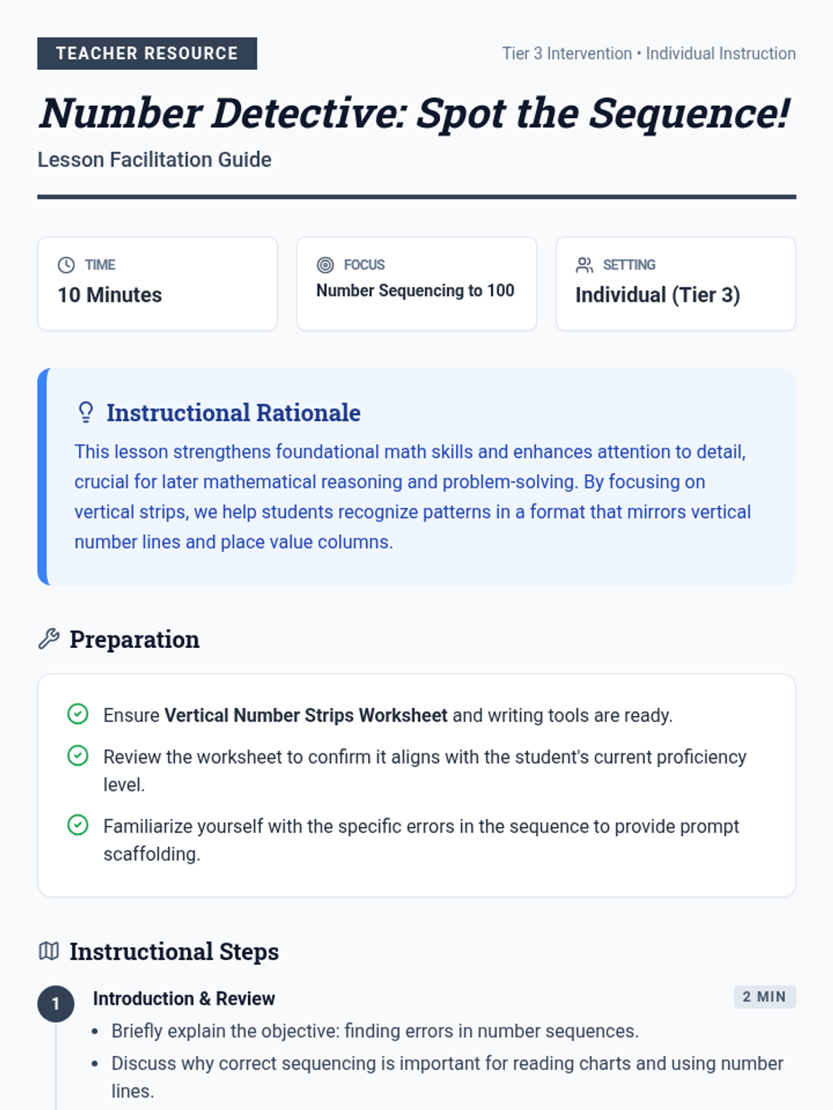 An individual Tier 3 lesson focused on mastering number sequencing up to 100 using vertical strips, emphasizing error detection and attention to detail.