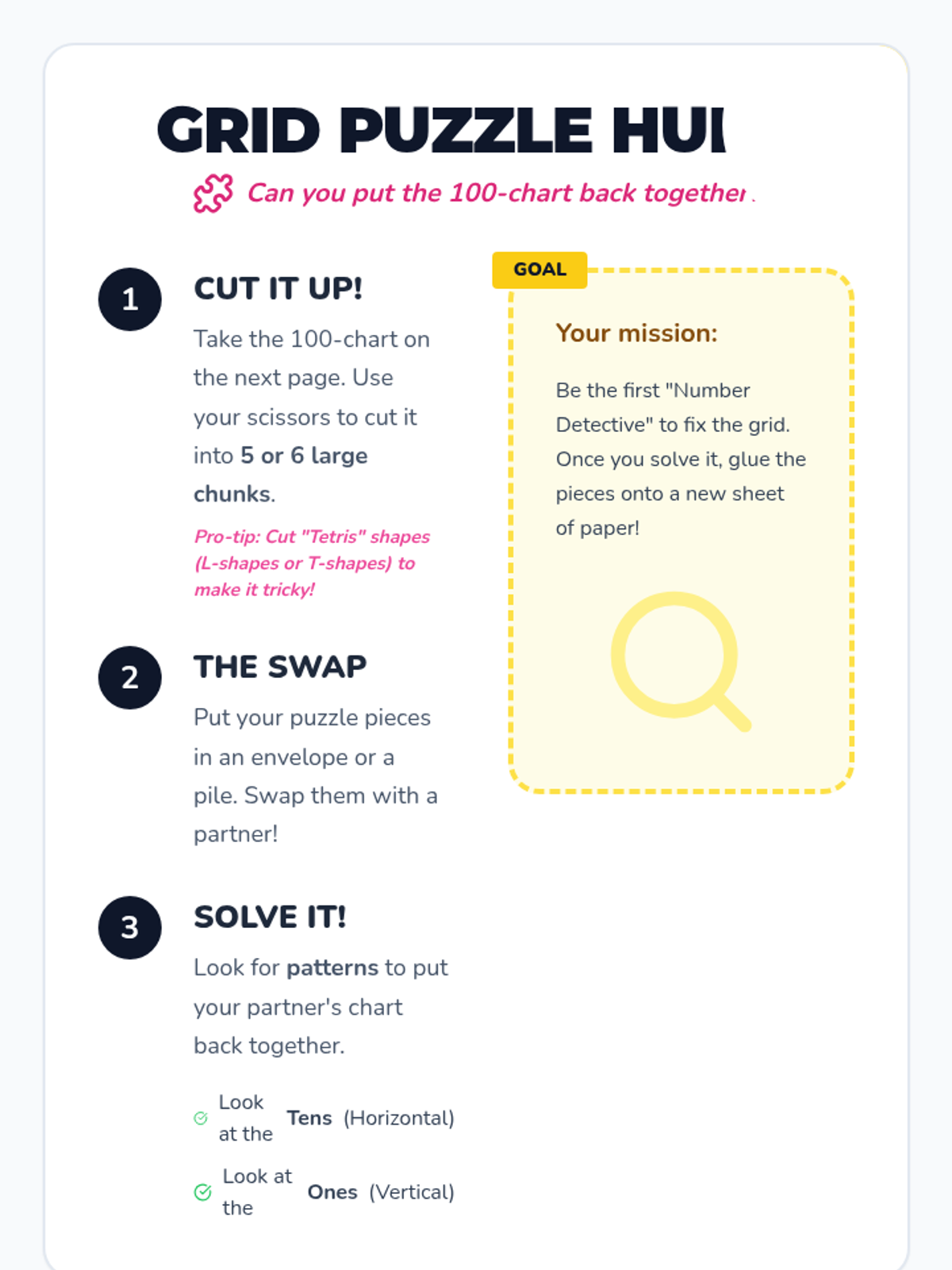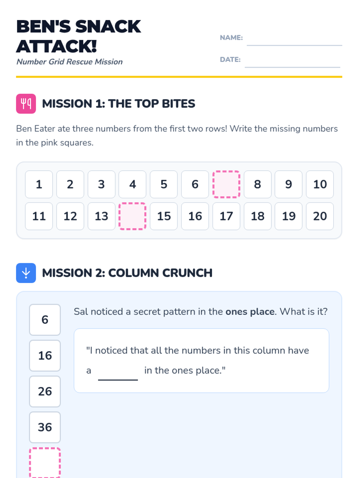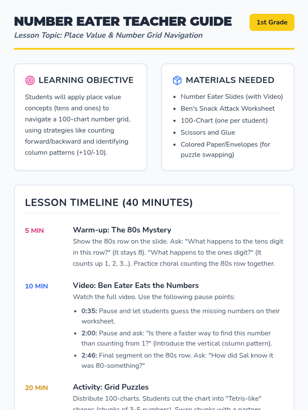 A 1st-grade lesson on place value and number grid patterns inspired by the 'Ben Eater' monster. Students use sequential counting and column patterns to repair a broken number grid and solve Tetris-style grid puzzles.